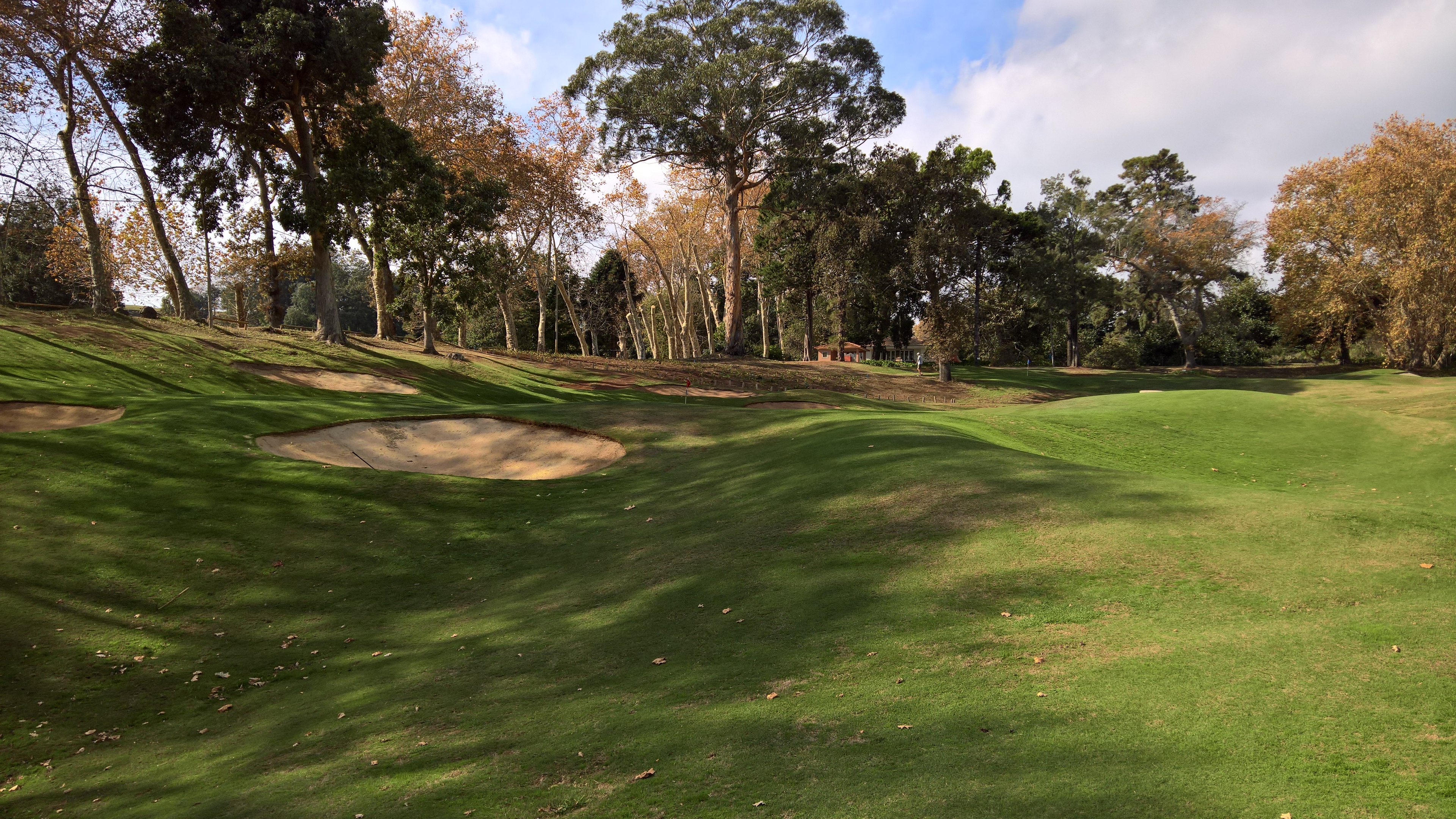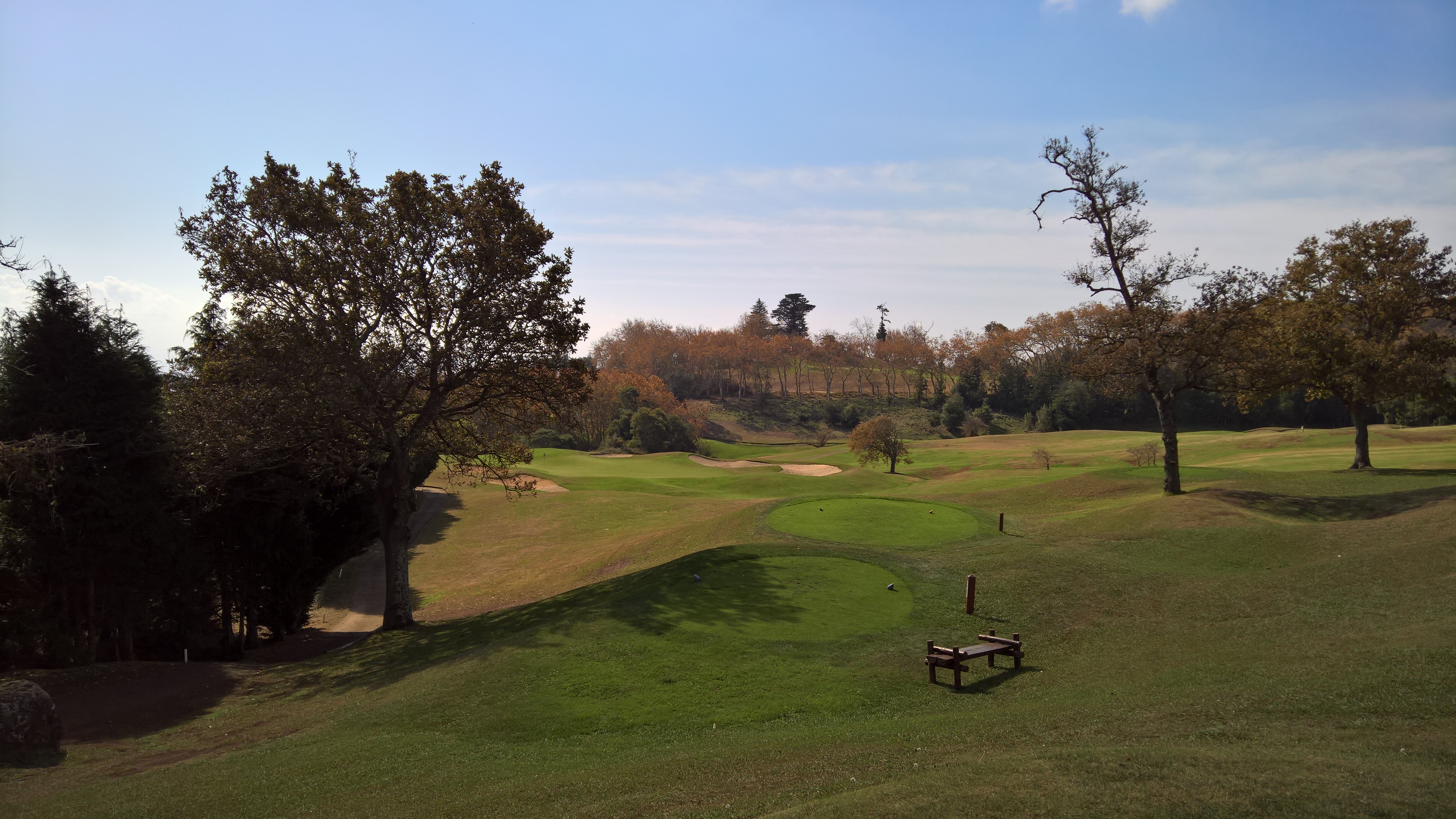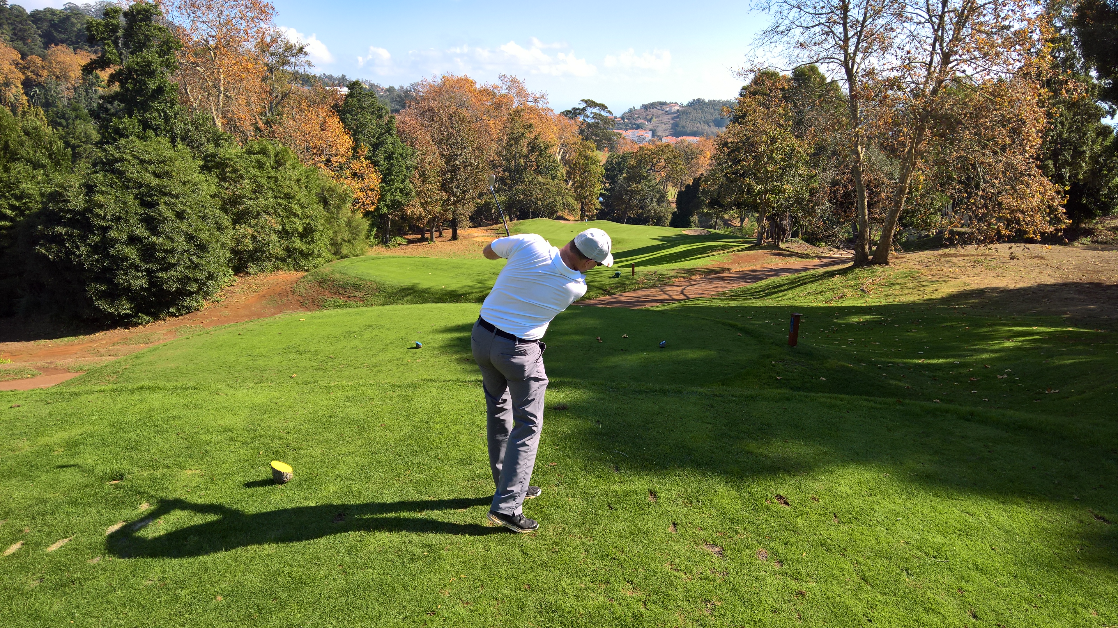 Das fünfte Loch beschert dem Spieler das nächste bergab-Par-3, das diesmal knapp 130 Meter lang ist. Durch die erhöhte Lage und die im November unterschiedlich gefärbten Blätter der Bäume hat man einen tollen Blick. Das Foto von mir am Abschlag zählt zu meinen Lieblingsbildern, auch wenn ich den Ball in den Grünbunker rechts geschossen habe.