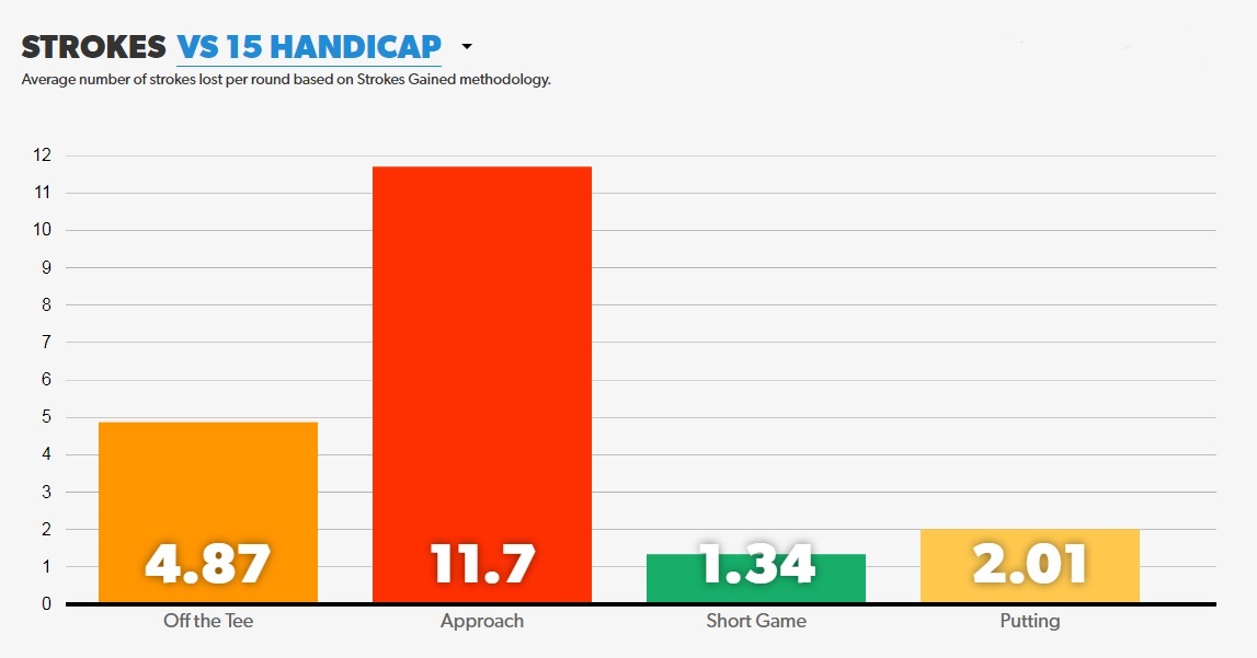 Da GameGolf auch hier viele Möglichkeiten bietet, schaue ich auf den statistischen Vergleich mit einem Handicap-15-Spieler (das ist meine optimistische Zielvariante) und sehe sehr deutlich, wo ich die meisten Schläge „verliere“. Und hier sollte natürlich der Schwerpunkt für mein Training liegen.