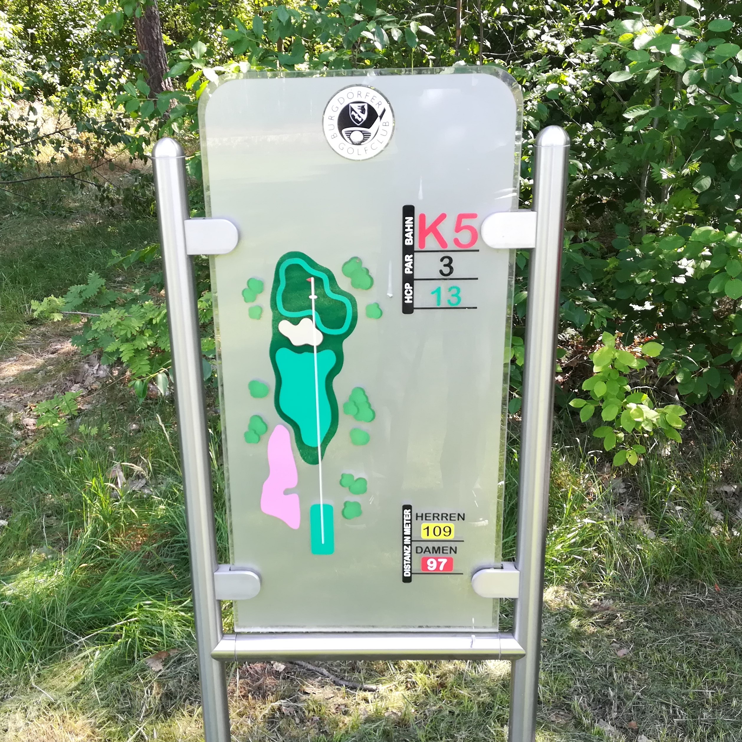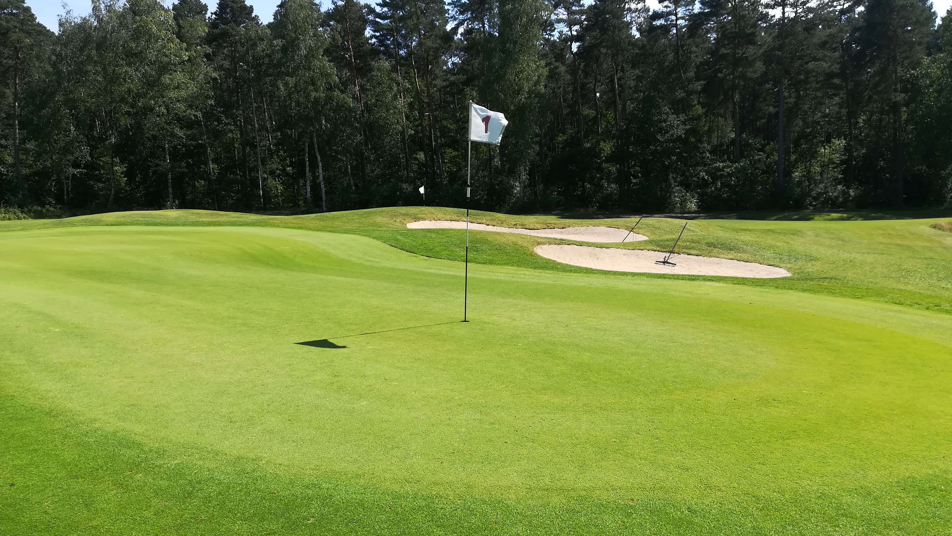 Es ist nicht nur sehr klein, sondern auch nett onduliert und nicht unbedingt einfach zu lesen. Die gebogene L-Form sorgt im schlimmsten Fall dafür, dass man durch ein Stück Vorgrün putten muss, wenn man Pech beim Anspiel hatte.