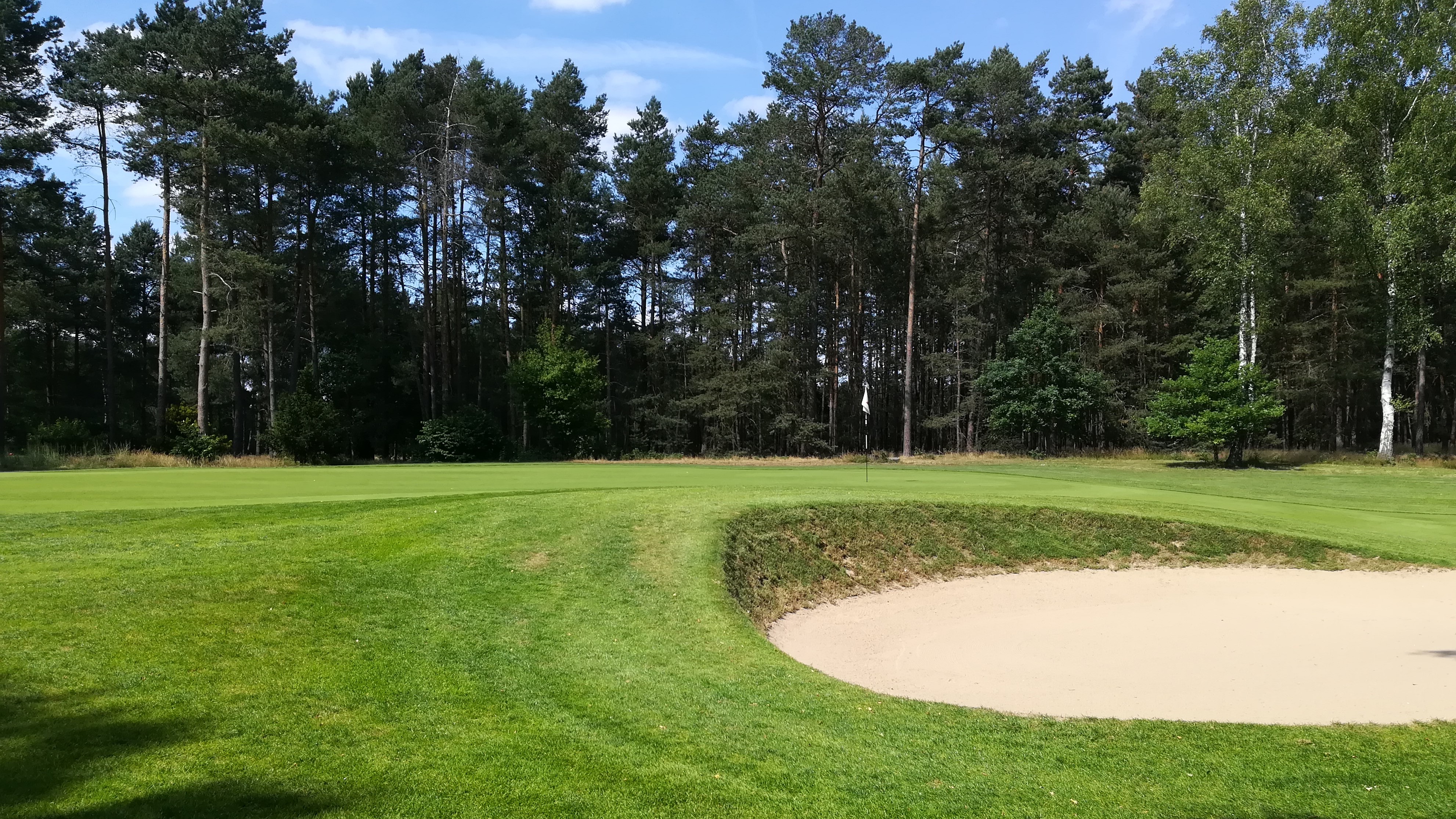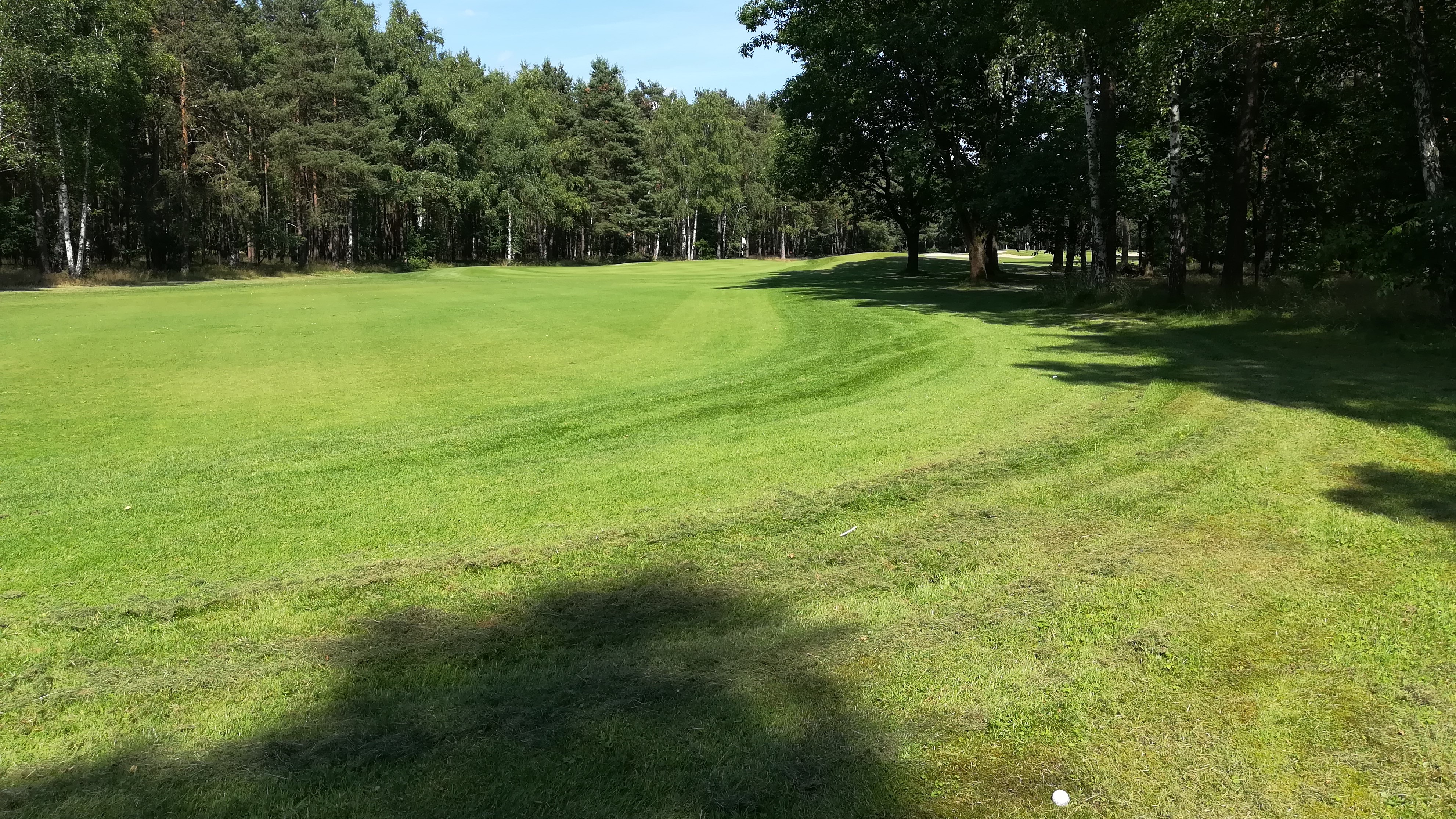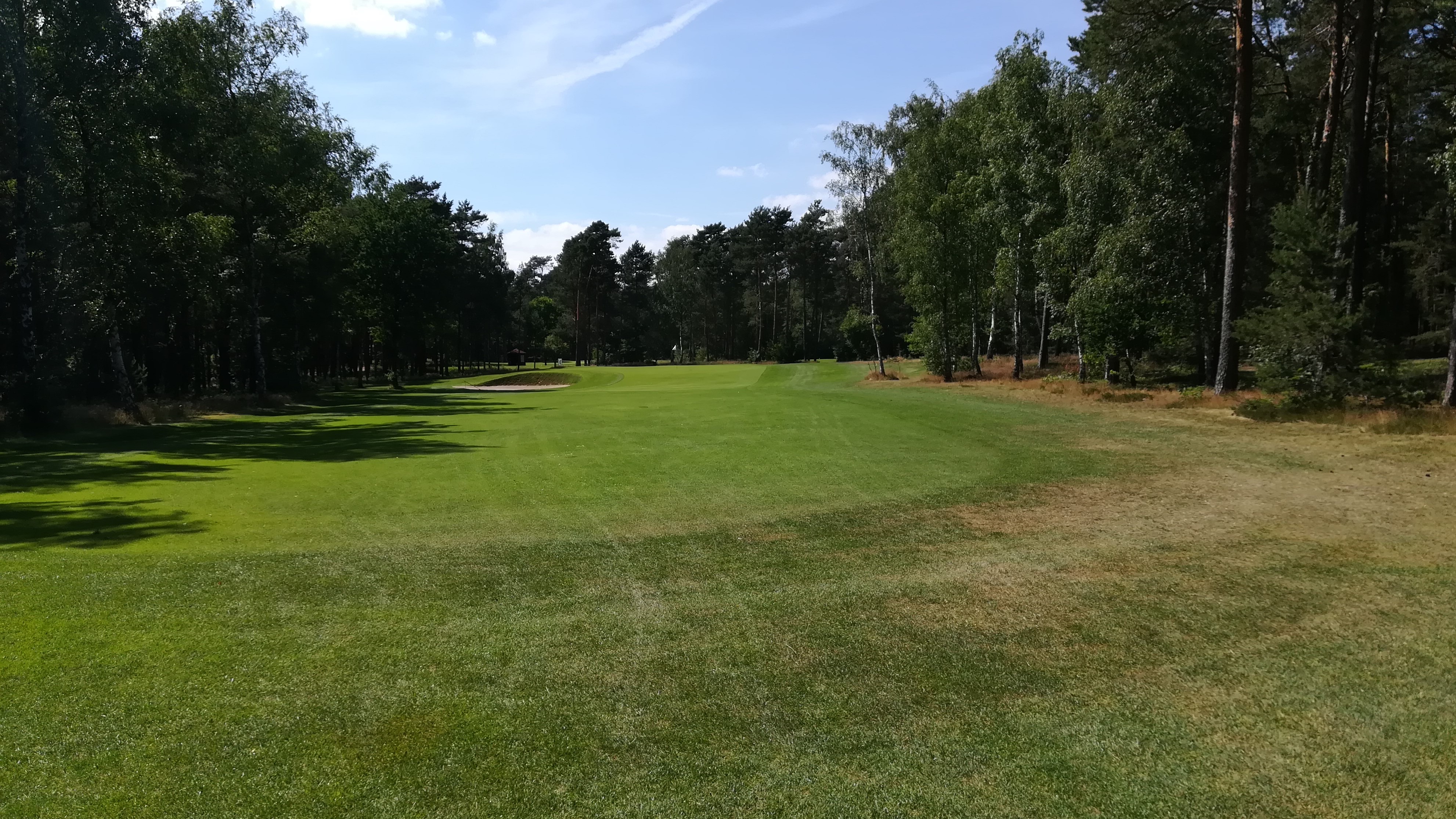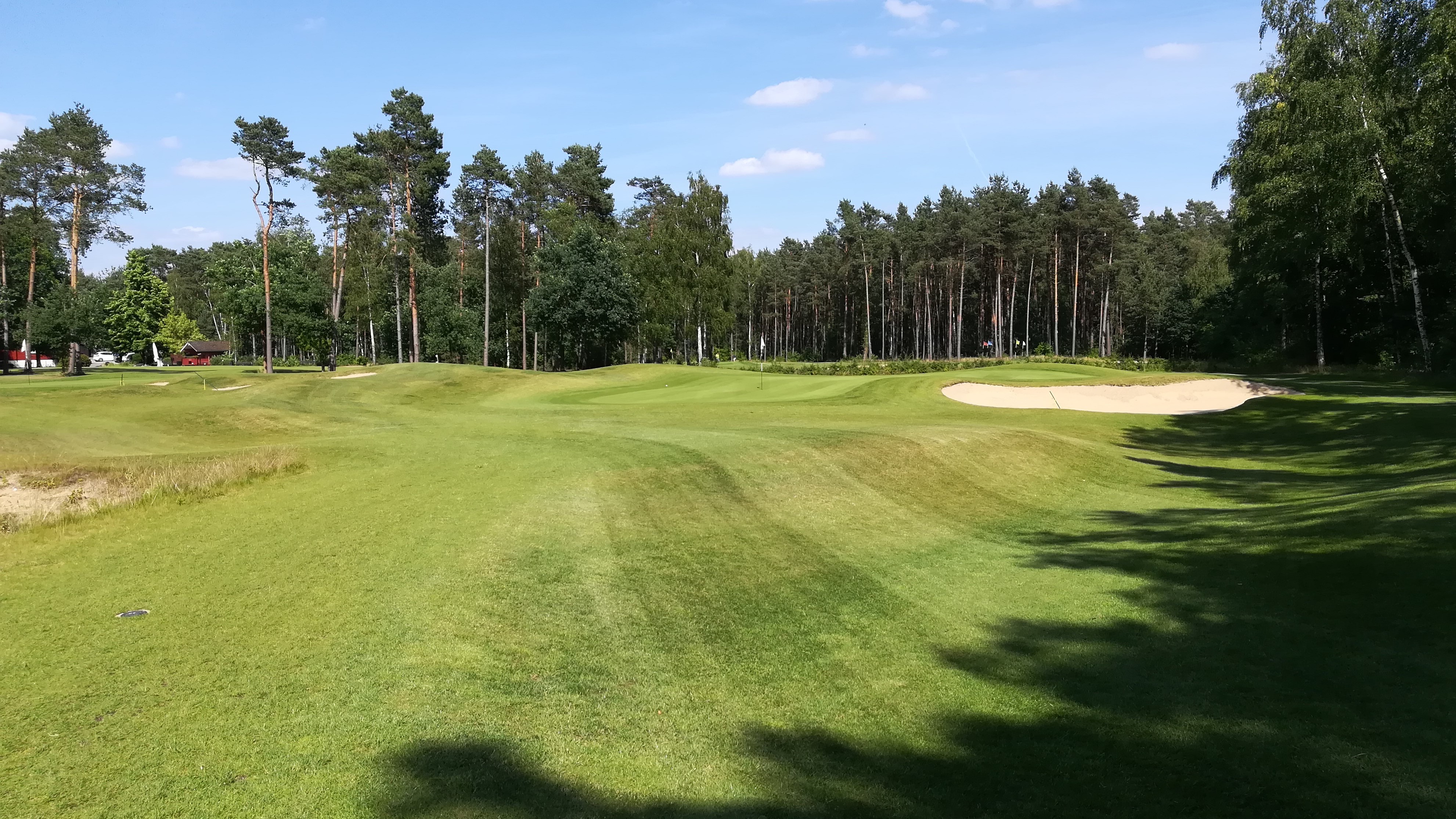 Einzig das Grün bietet durch seine längliche Form und eine kleine Welle so etwas wie einen Reiz, je nachdem wo die Fahne steckt. Ein kleiner Hügel rechts neben dem Grün wirft knapp seitlich verzogen Bälle im Idealfall sogar wieder zurück auf die Linie. Links vom Grün wartet ein Stückchen Wald.
