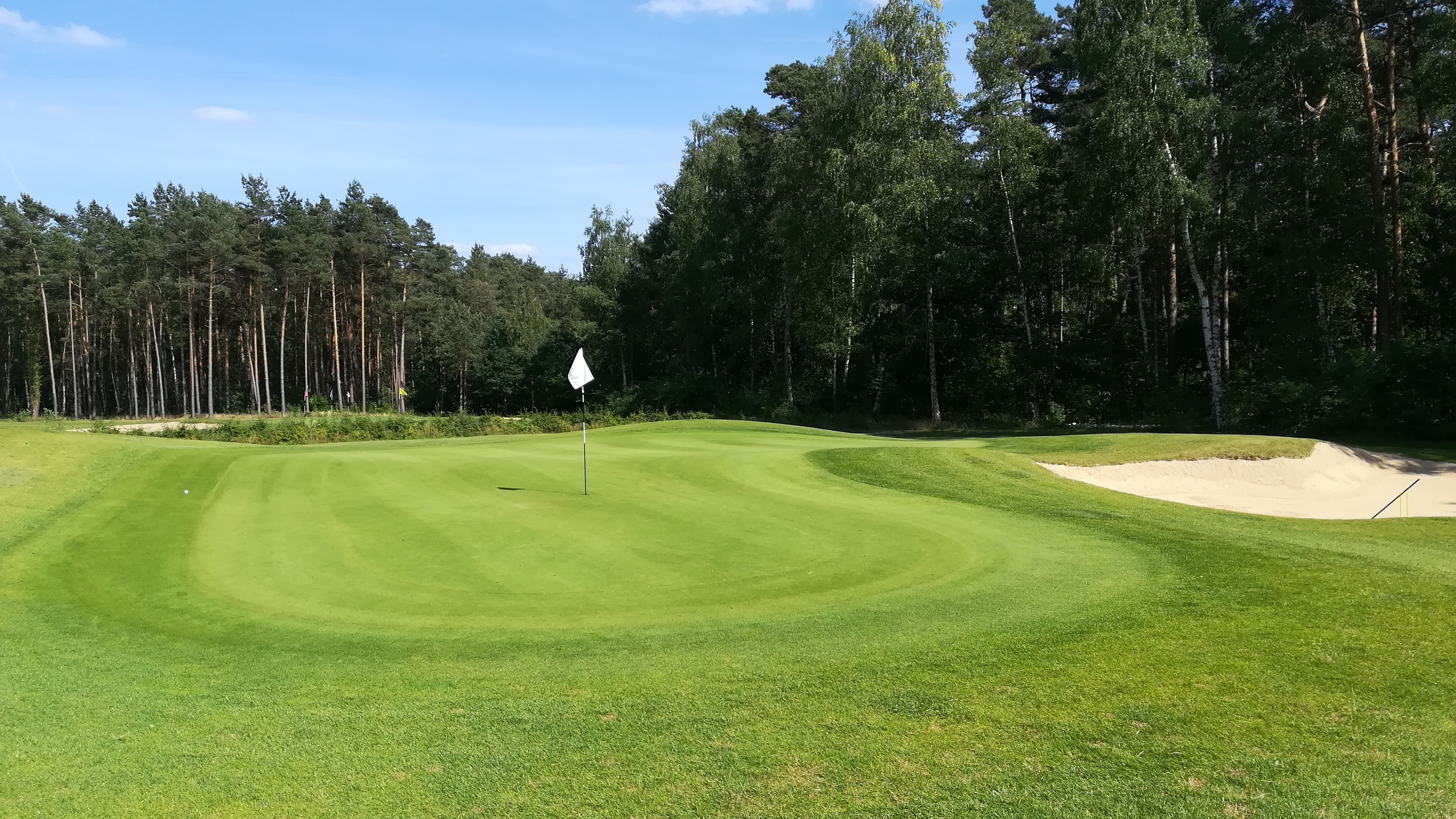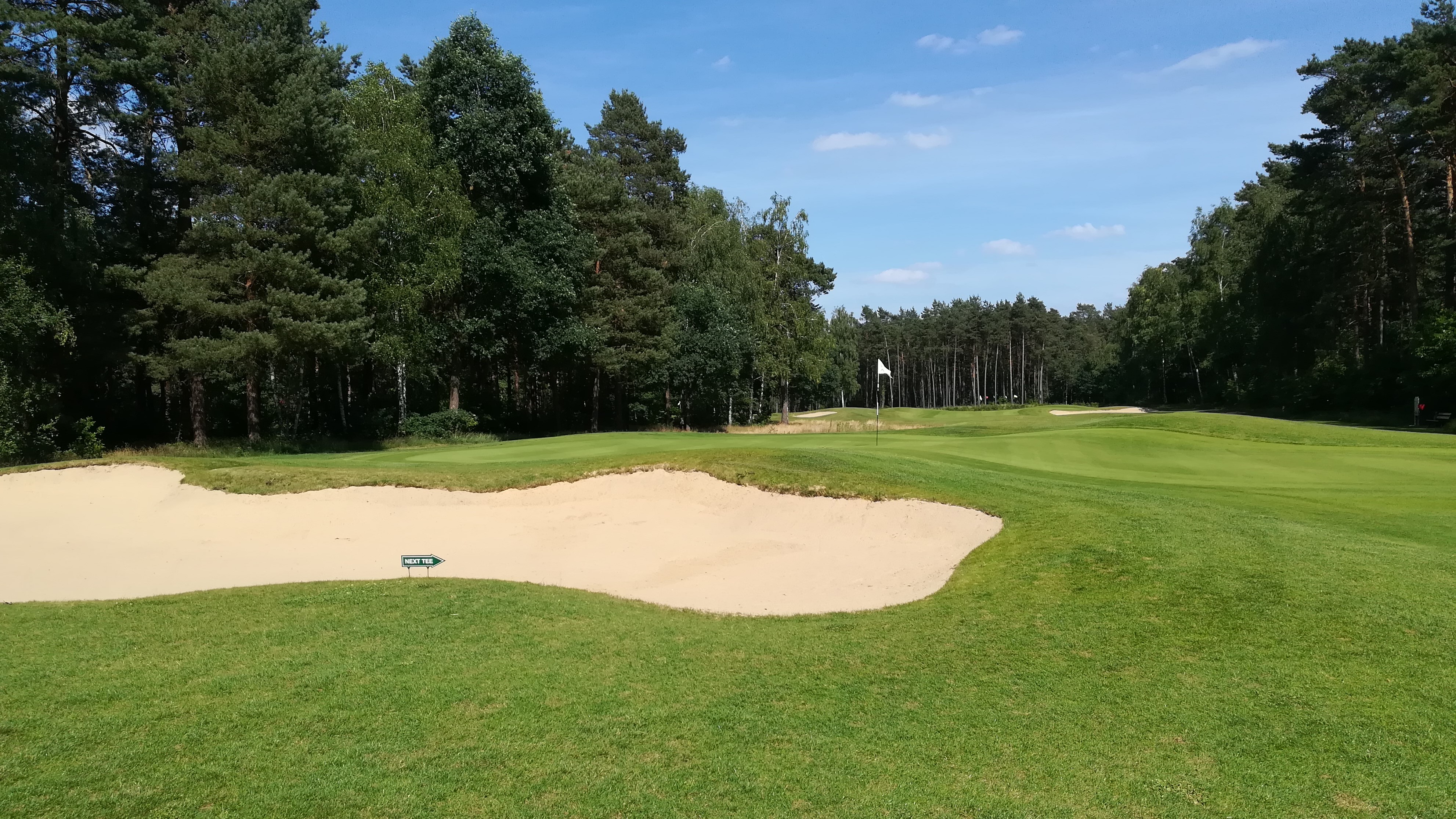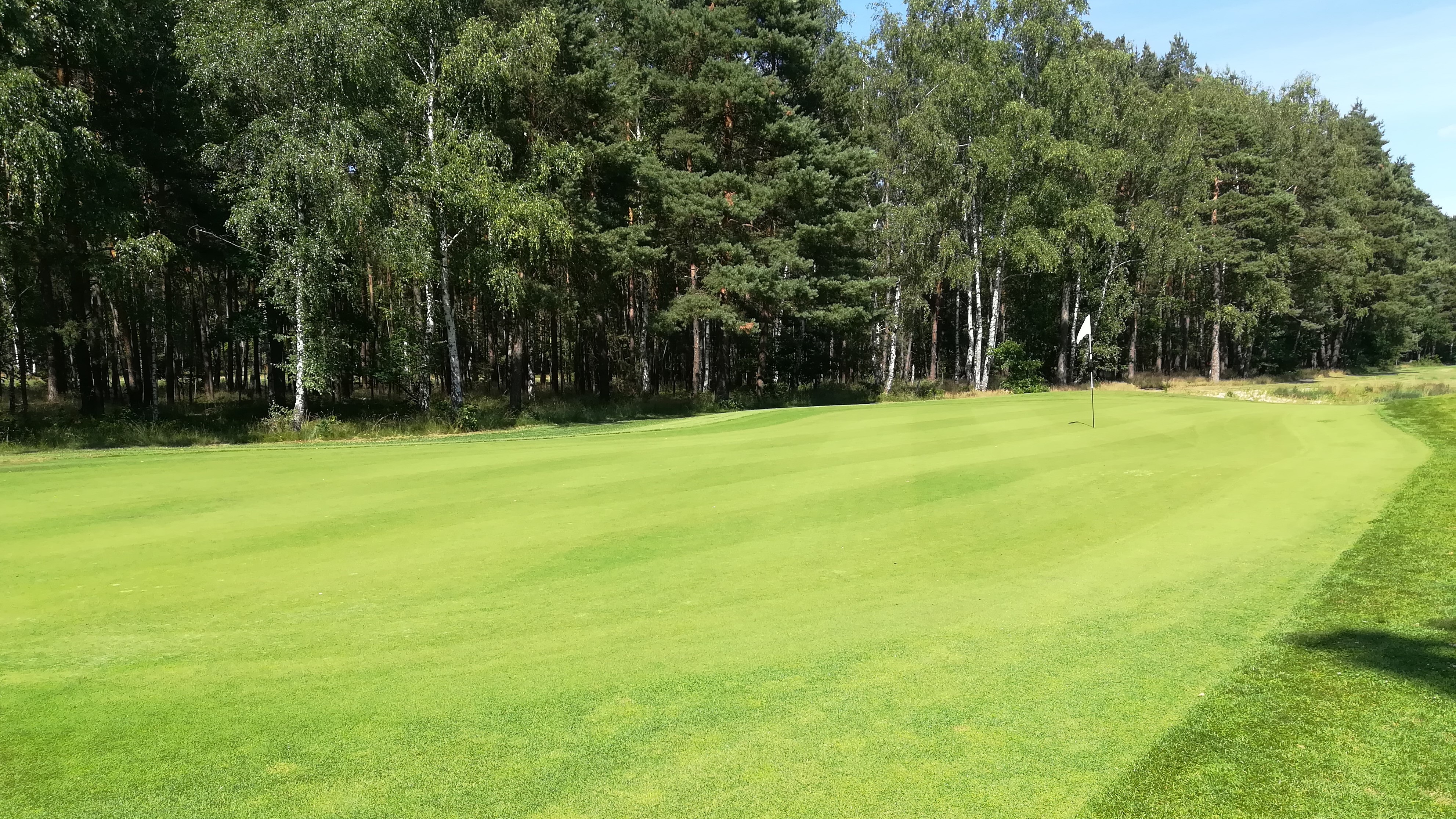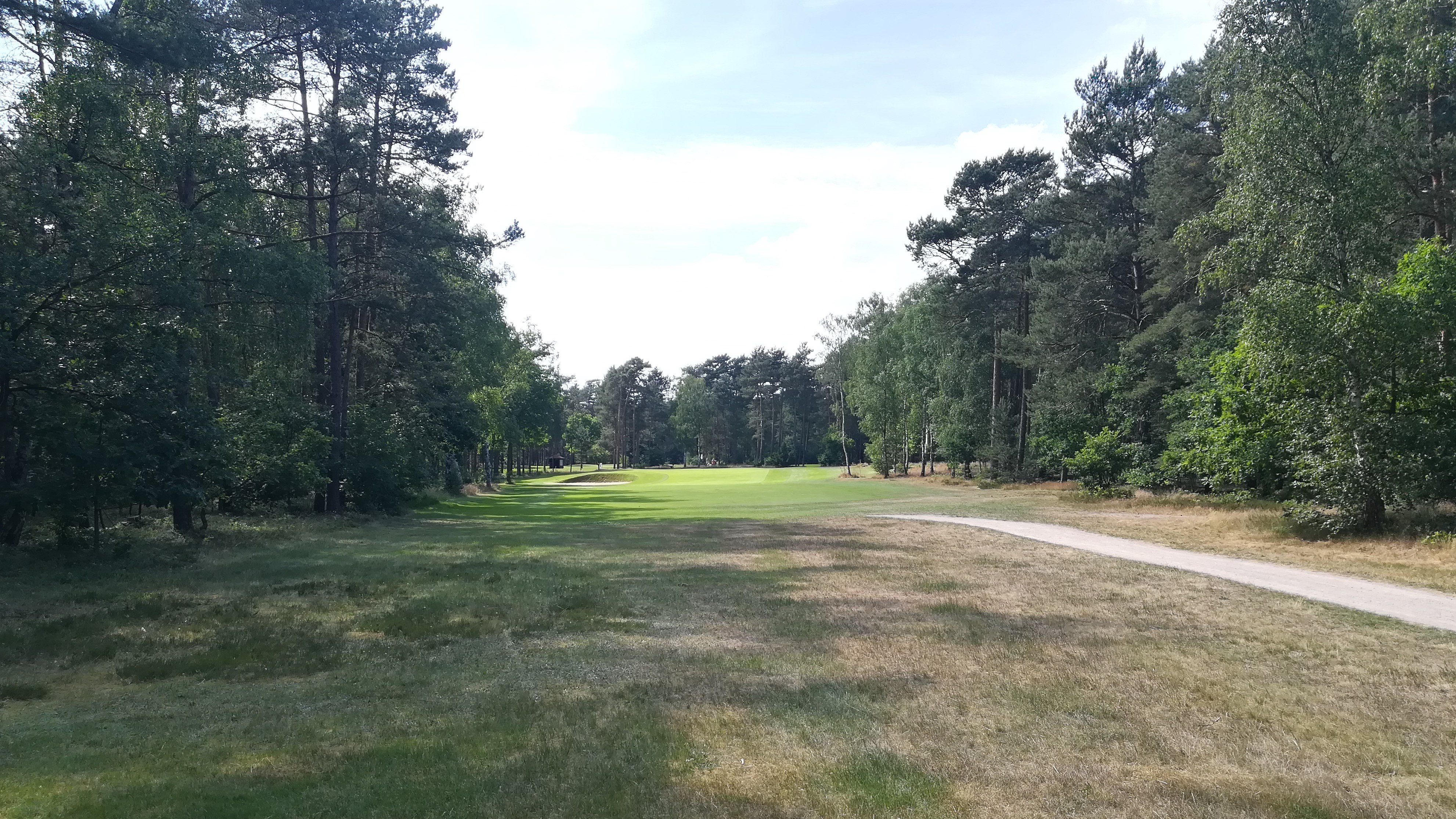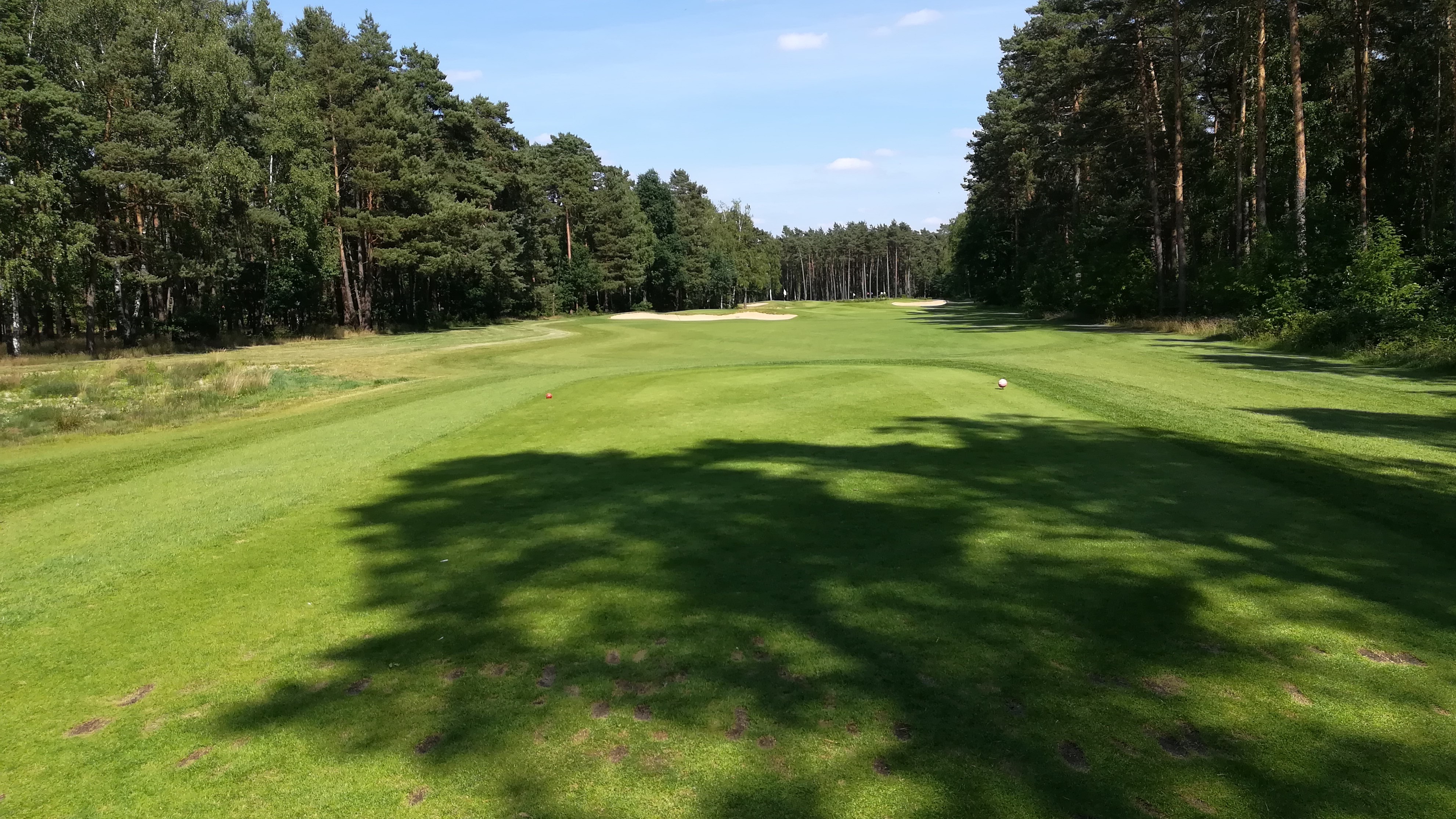 Einzig das Grün bietet durch seine längliche Form und eine kleine Welle so etwas wie einen Reiz, je nachdem wo die Fahne steckt. Ein kleiner Hügel rechts neben dem Grün wirft knapp seitlich verzogen Bälle im Idealfall sogar wieder zurück auf die Linie. Links vom Grün wartet ein Stückchen Wald.