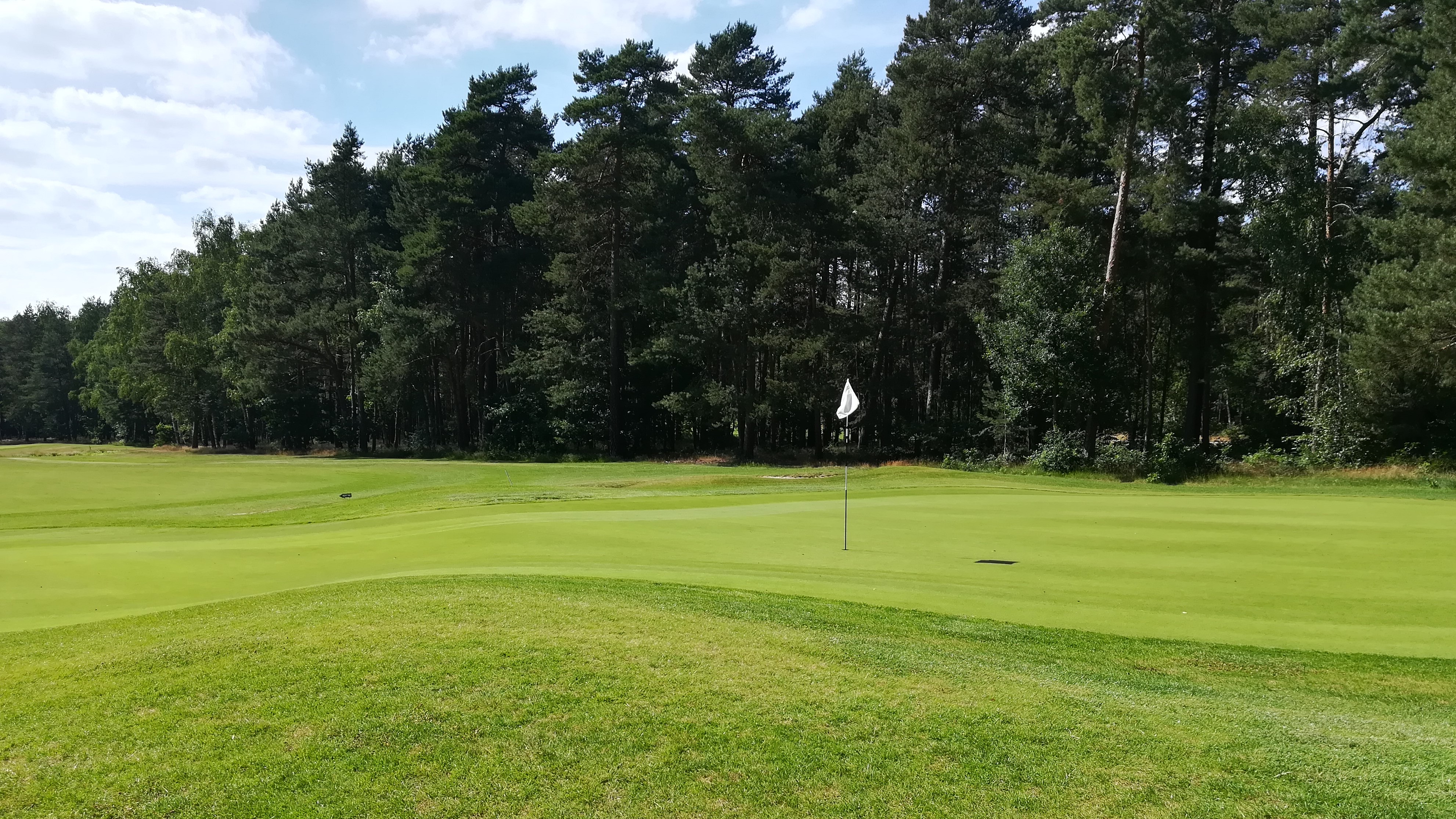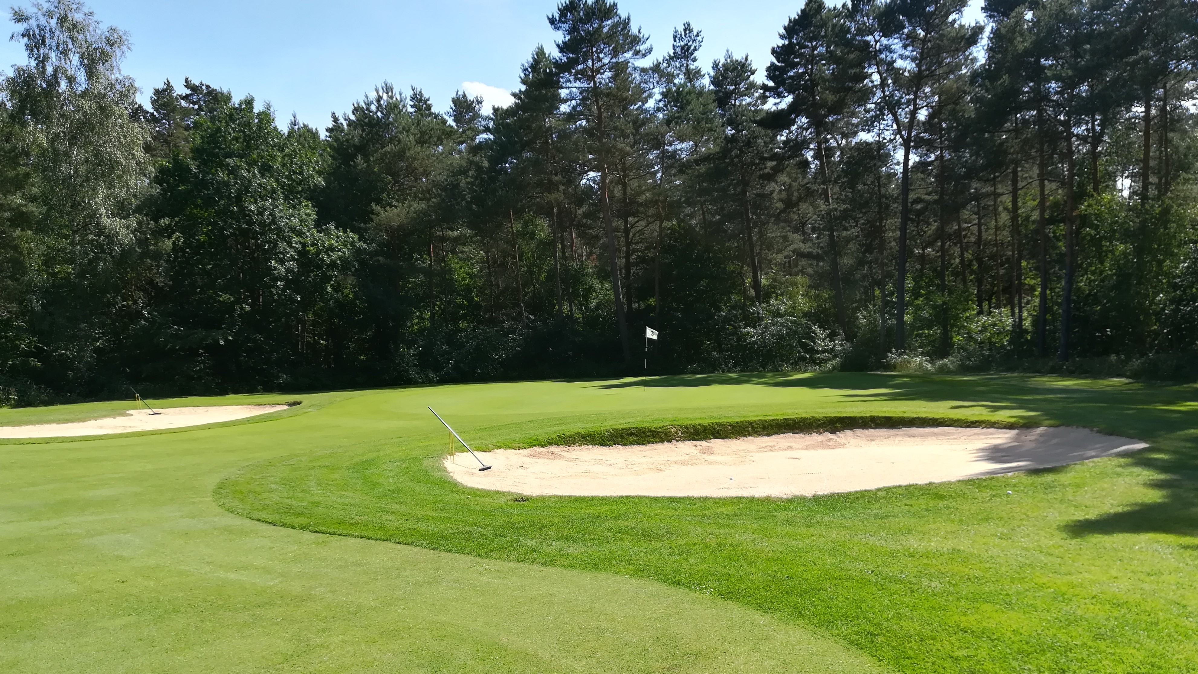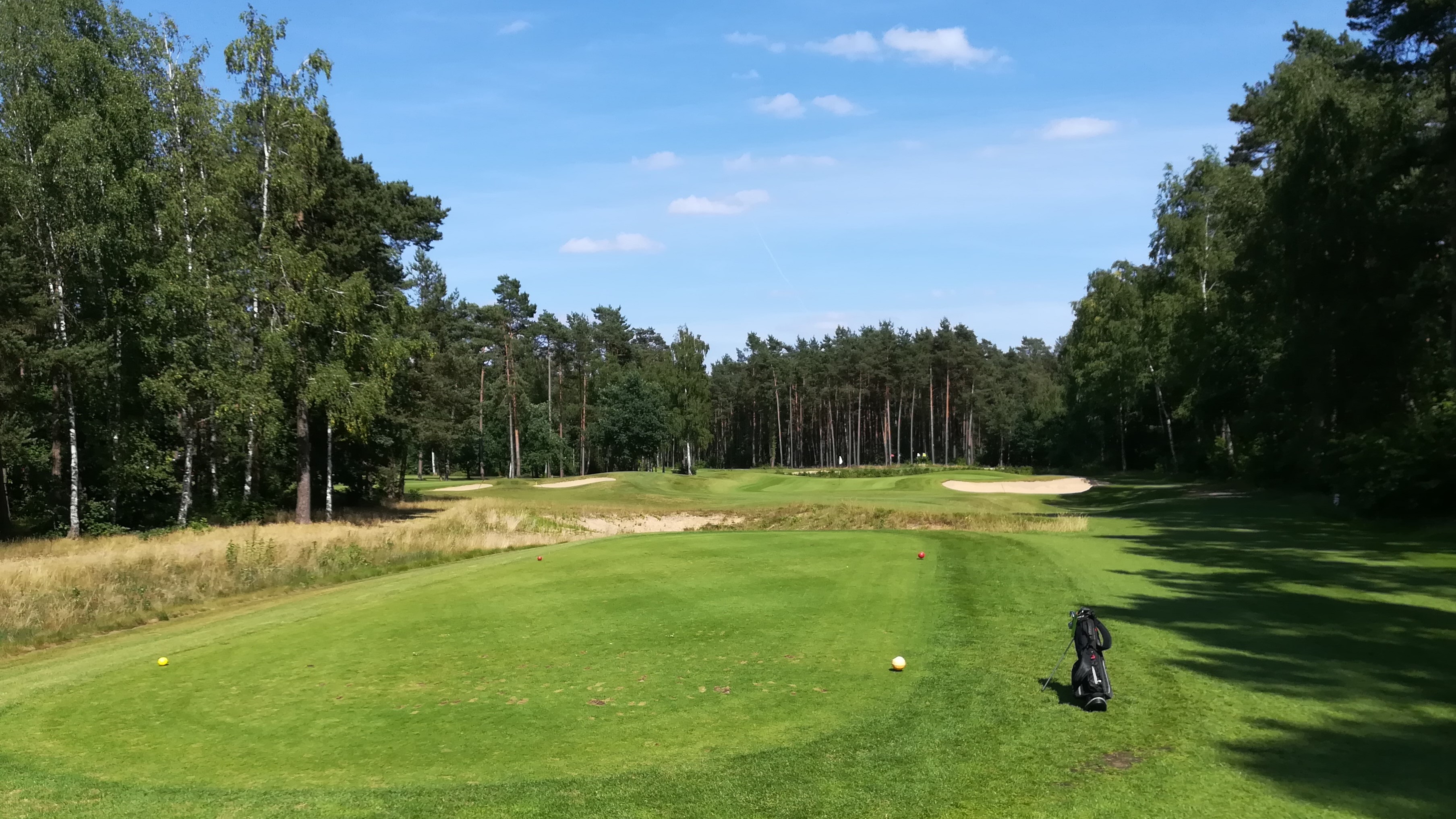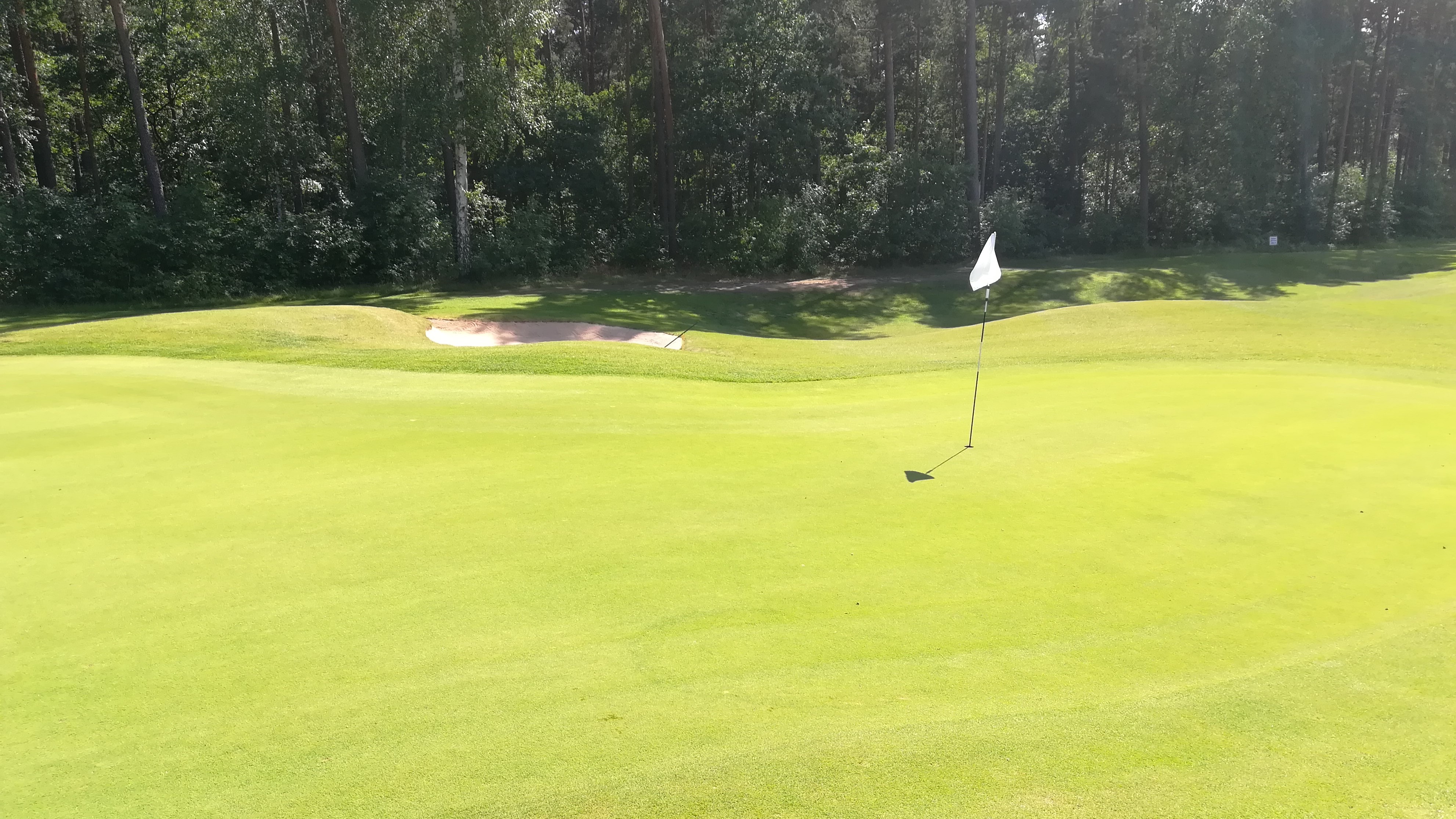 Einzig das Grün bietet durch seine längliche Form und eine kleine Welle so etwas wie einen Reiz, je nachdem wo die Fahne steckt. Ein kleiner Hügel rechts neben dem Grün wirft knapp seitlich verzogen Bälle im Idealfall sogar wieder zurück auf die Linie. Links vom Grün wartet ein Stückchen Wald.
