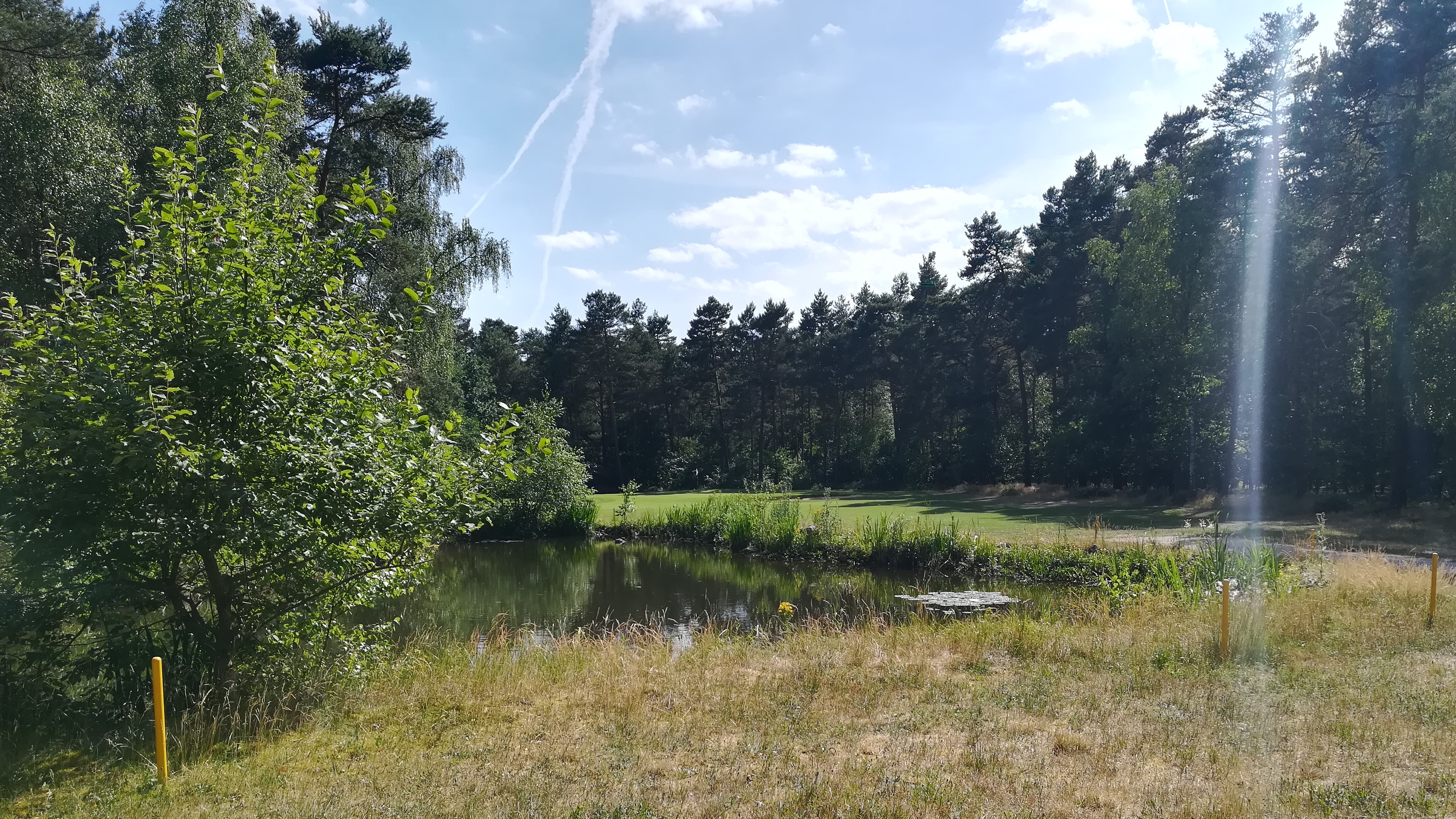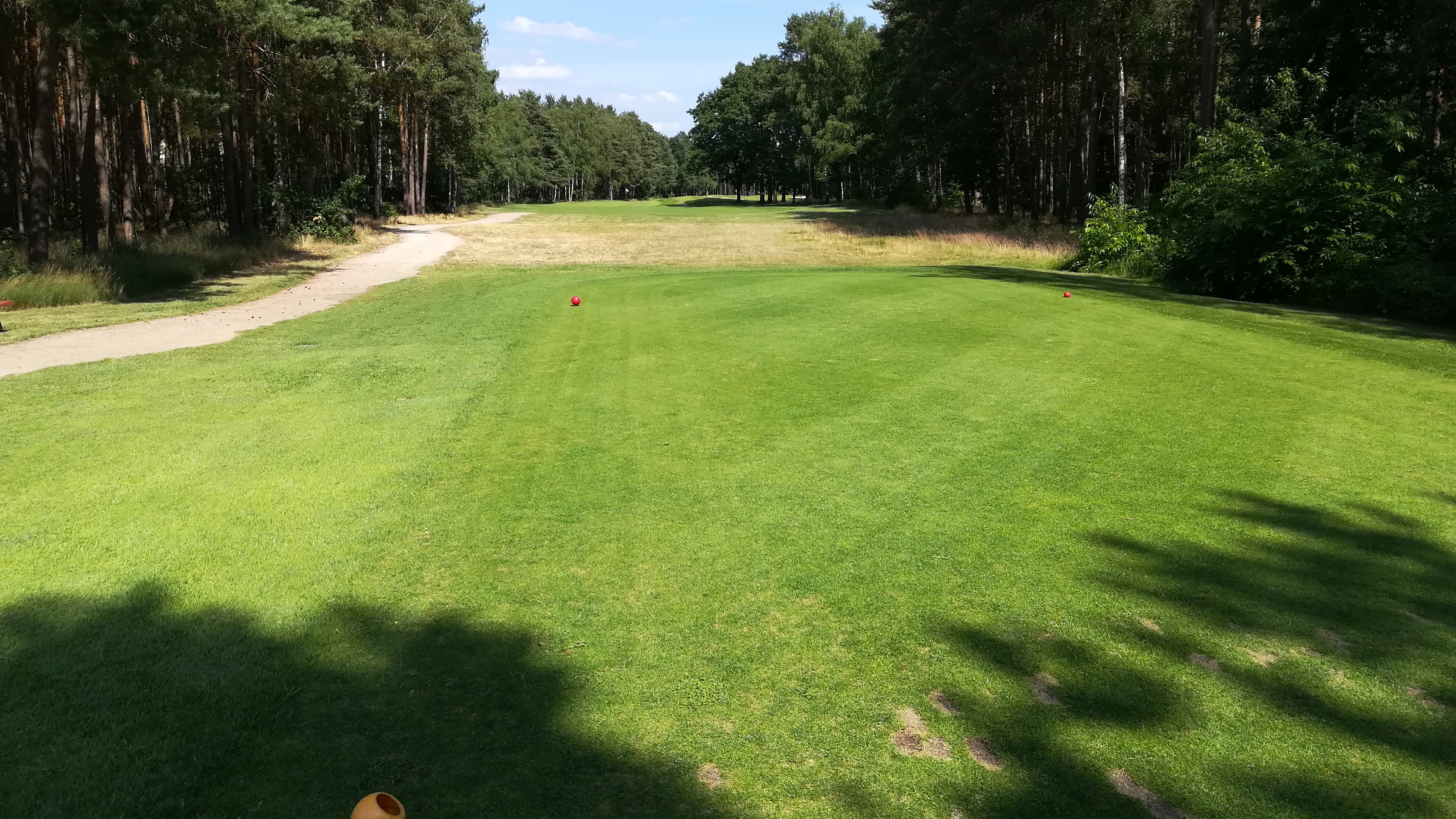 Das kleine „Fairway“ zwischen der Tee-Box und dem Grün ist breit und eigentlich immer kurz gemäht. Links der Wald ist weit genug weg und auch die Bäume rechts sollten bei einem guten Treffer keine große Rolle spielen.