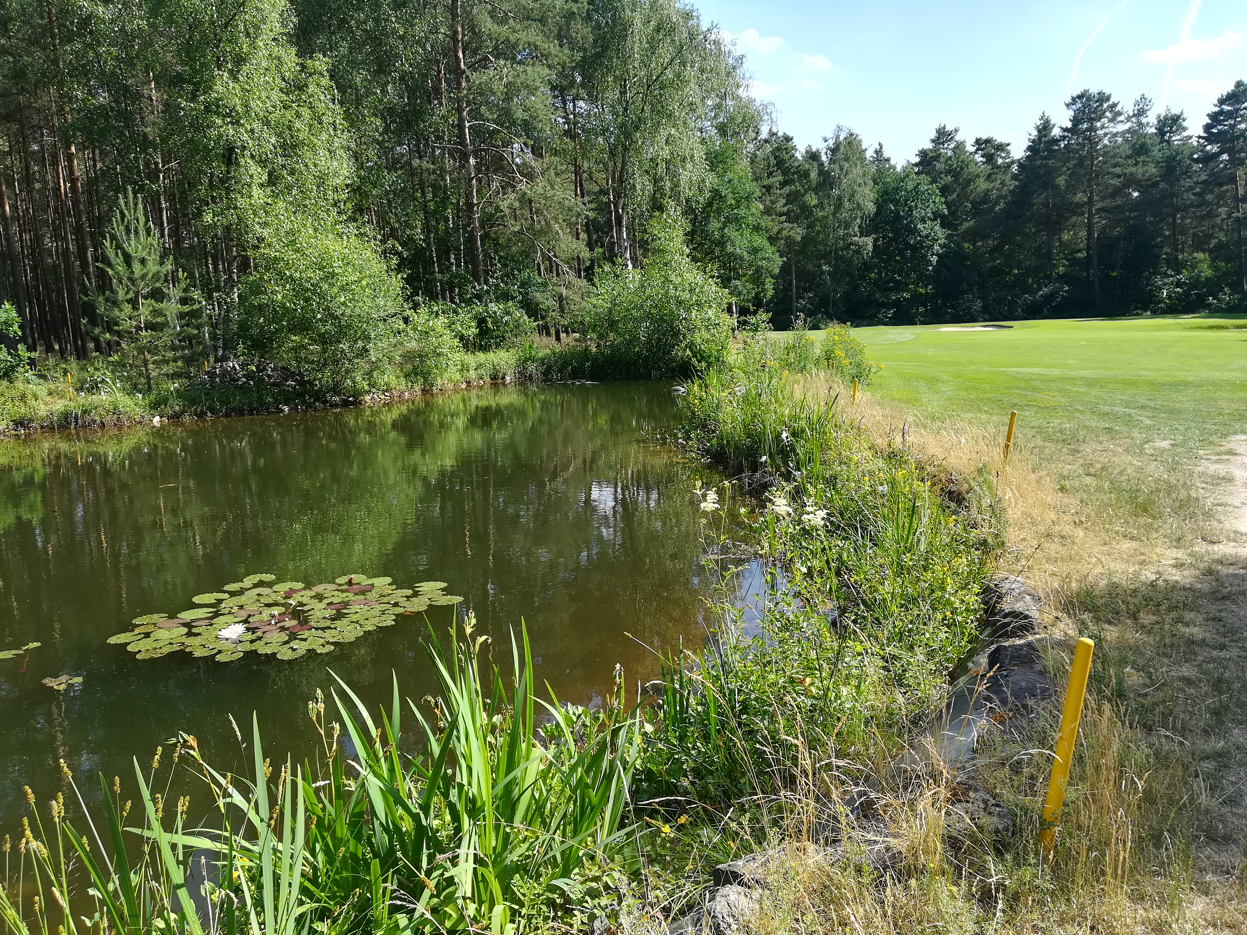 Landschaftlich ist die drei das schönste Loch des Platzes. Von einem erhöhten Abschlag aus schlägt man über einen seitlichen Teich. Der kommt zwar nicht wirklich ins Spiel, aber zieht natürlich trotzdem die Aufmerksamkeit auf sich.