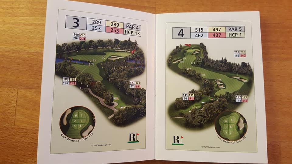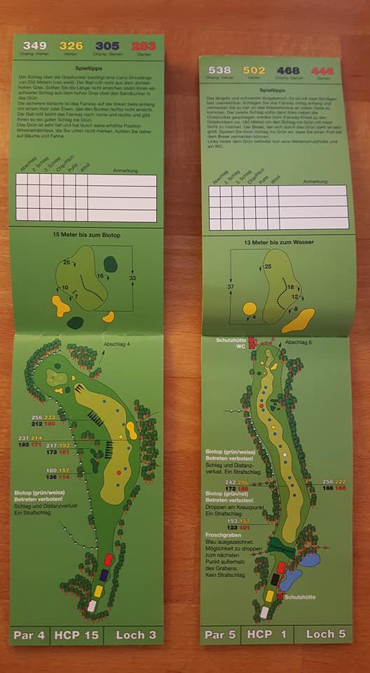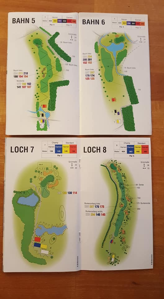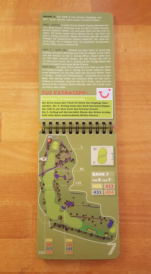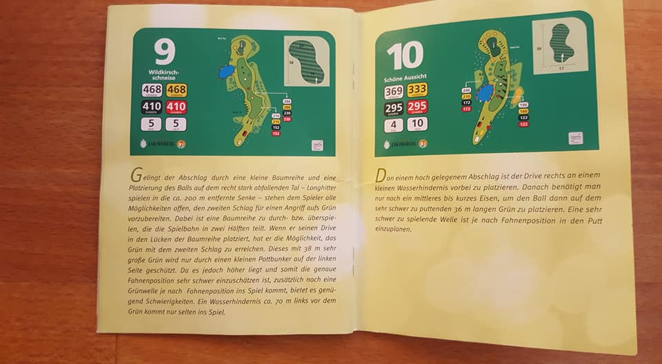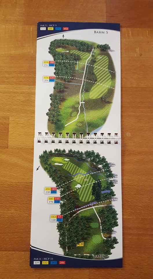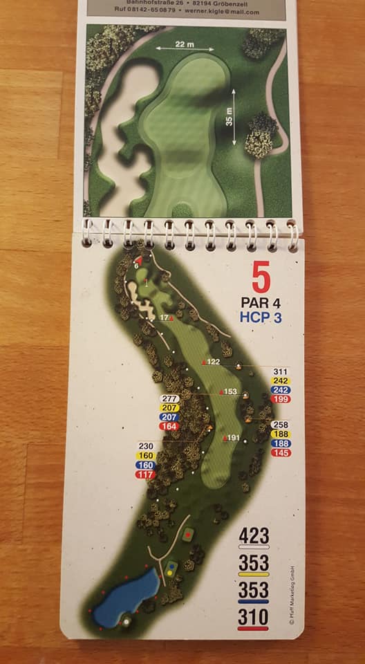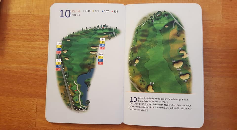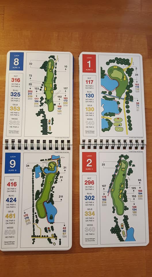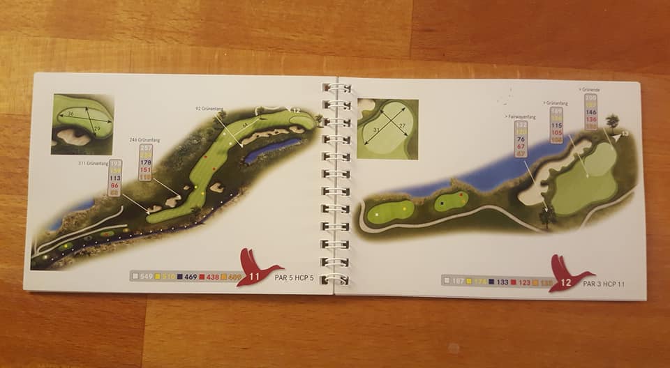 Wie sagte Kaiser Franz einst: „In Germany we call it a Klassiker“. Das wohl bekannteste und am weitesten verbreitete Birdiebook-Design, z.B. im Golfclub Ebersberg (oben) oder in Bad Griesbach (unten: Audi Course) im Dienst. Alles drin was man benötigt, und die Entfernungspunkte werden sehr individuell benannt, z.B. „Waldecke“ oder „Senke“