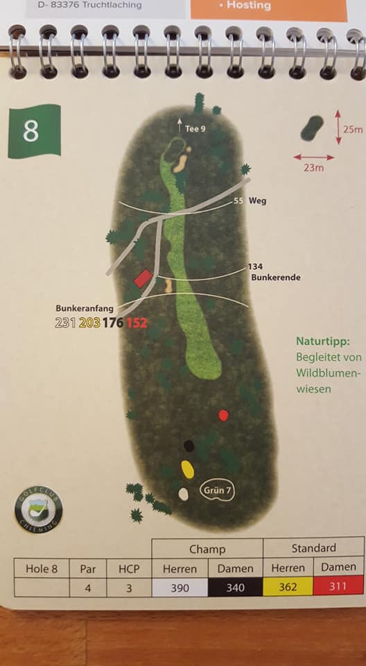 Vorbildlich auch das Birdie Book von Achental. Sehr einfach zu lesende Zeichnungen, wichtige Punkte sind sowohl zum Abschlag als auch zum Grünanfang gemessen. Die Grenzen zwischen Fairway, Semi- und Hard Rough sind gut einzuschätzen.