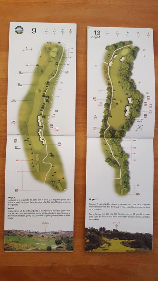 Zwei hervorragende Exemplare ihrer Gattung gab es an der Costa del Sol zu bestaunen. Links Calanova, rechts Los Arqueros. Besonders smart: bei jedem Loch gab es unten ein Foto mit dem idealen Aim Point für den Abschlag, so konnte man auch auf verwinkelten Bahnen am Tee erst mal selbstbewusst losledern.