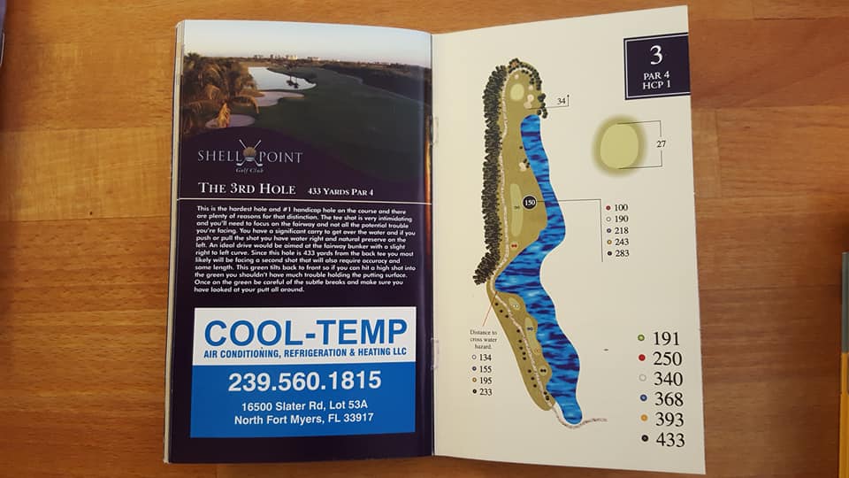 Das Birdie Book von Shell Point / Ft Myers FL ist in zwei Punkten auffällig. Der Designer ist vermutlich passionierter Angler, anders lässt sich nicht erklären, dass er mehr Liebe in das Design der Wasserhindernisse als der Trockenbereiche investiert hat. Und ich kann versichern – Bahn 3 hat definitiv nicht nur einen 30 x 10 Yards großen Fairwaystreifen in der Mitte der Bahn.