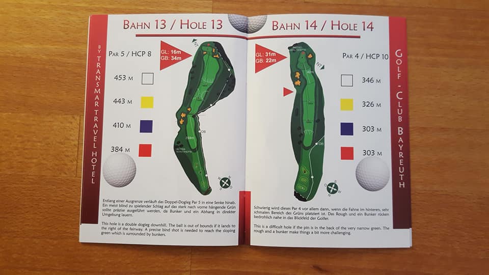 … an Bahn 13 trifft der Golfclub Bayreuth genau mein Humor. „Spielen sie ihren blinden Schlag ins Grün möglichst präzise. UN-BE-DINGT. Sie können dieses zwar in der Regel nicht sehen, und um es halbwegs lokalisieren zu können, würde Ihnen eine möglichst große Skizze bestimmt helfen, allerdings ist dafür in diesem Birdie Book kein Platz. Schließlich müssen wir auf jeder Seite in Schriftgrad 60 die Information, die sie ohnehin überall finden, nämlich wie lang die Bahn ist, unterbringen. Dann noch – gaaanz wichtig! – das Bild eines Golfballs, damit sie, lieber Leser, auch wissen, auf welches Objekt sie beim blinden Schlag ins viel zu klein gezeichnete Grün draufhauen müssen. Viel Erfolg!“