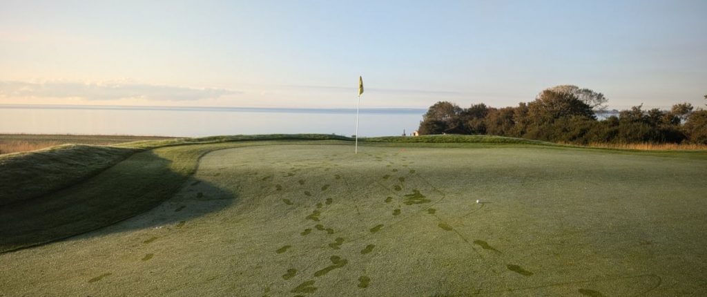 Parallel zum Fehmarnsund verläuft dann das dritte Loch, ein mittleres Par 5 mit einem kleinen Rechtsknick am Ende. Während der Abschlag gefühlt fast neben dem Strand ist verläuft zwischen Fairway und Meer dann doch noch ein breiterer Streifen Land – trotzdem sind der Blick und die Geräusche vom Meer her schon toll. Das Grün wird meistens um die Kurve angespielt und hat eine große Stufe.