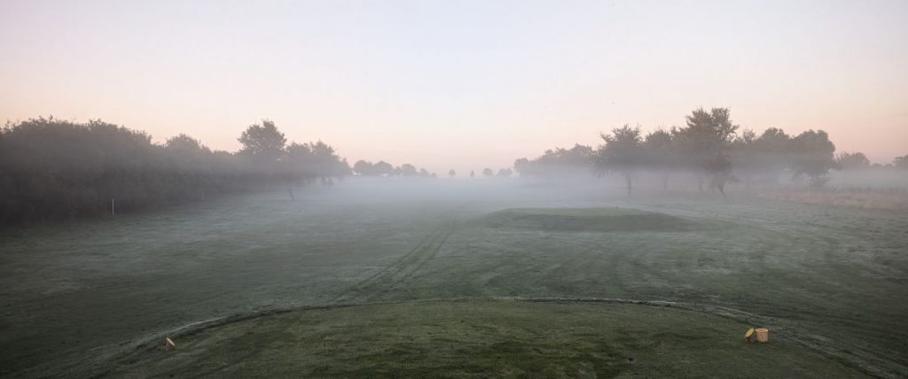 Wir sind sehr früh gestartet und hatten am ersten Abschlag noch dichten Nebel. Im Grunde war das Fairway zu erahnen, aber Loch eins ist ein relativ gerades Par 4 und vor uns war niemand unterwegs. Also haben wir abgeschlagen und sind nach Gehör zu den Bällen gegangen. Zum Start ist das Loch sehr angenehm und führt gleich in Richtung Meer.