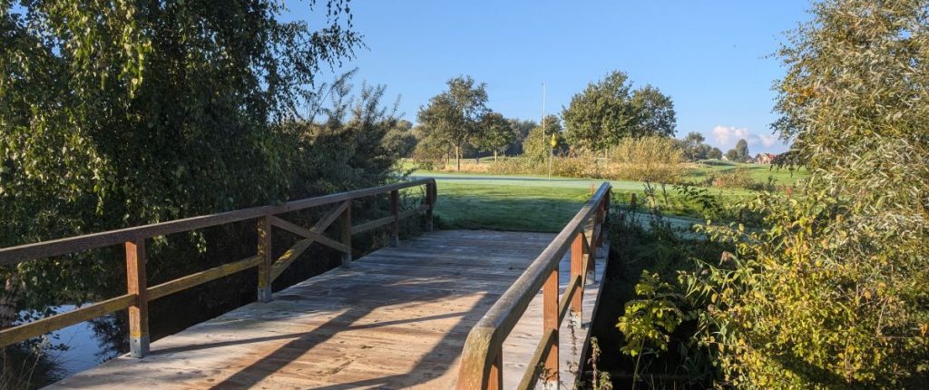 Zum Abschluss der Frontnine spielt man ein mittleres Par 3 Loch. Dessen Inselgrün ist von der Form her den Umrissen der Insel Fehmarn nachempfunden, selbst die hübsche Holzbrücke ist dort angesetzt, wo auch in „echt“ die Fehmarnsundbrücke steht. Optisch ist das wirklich sehr schön.