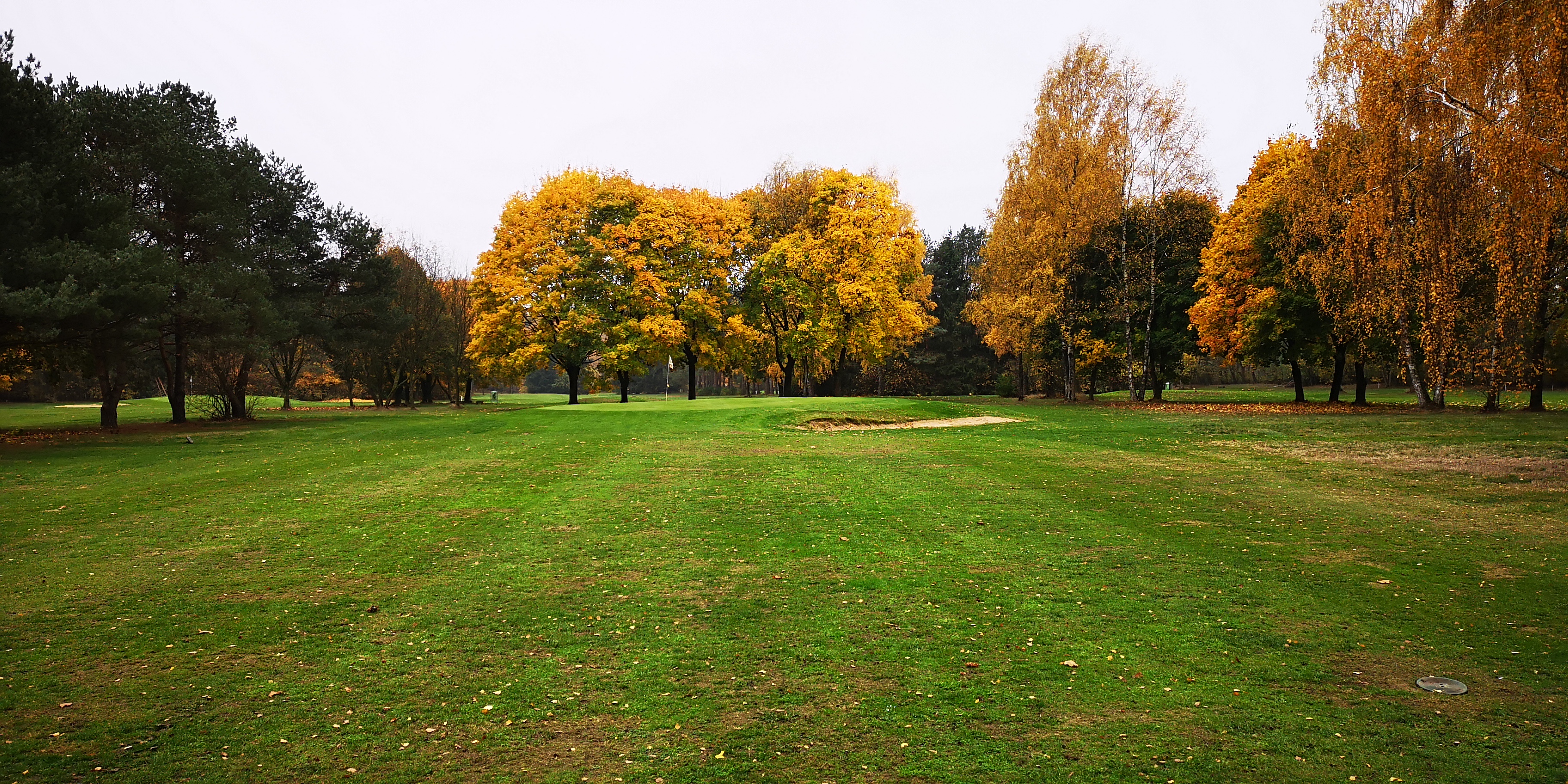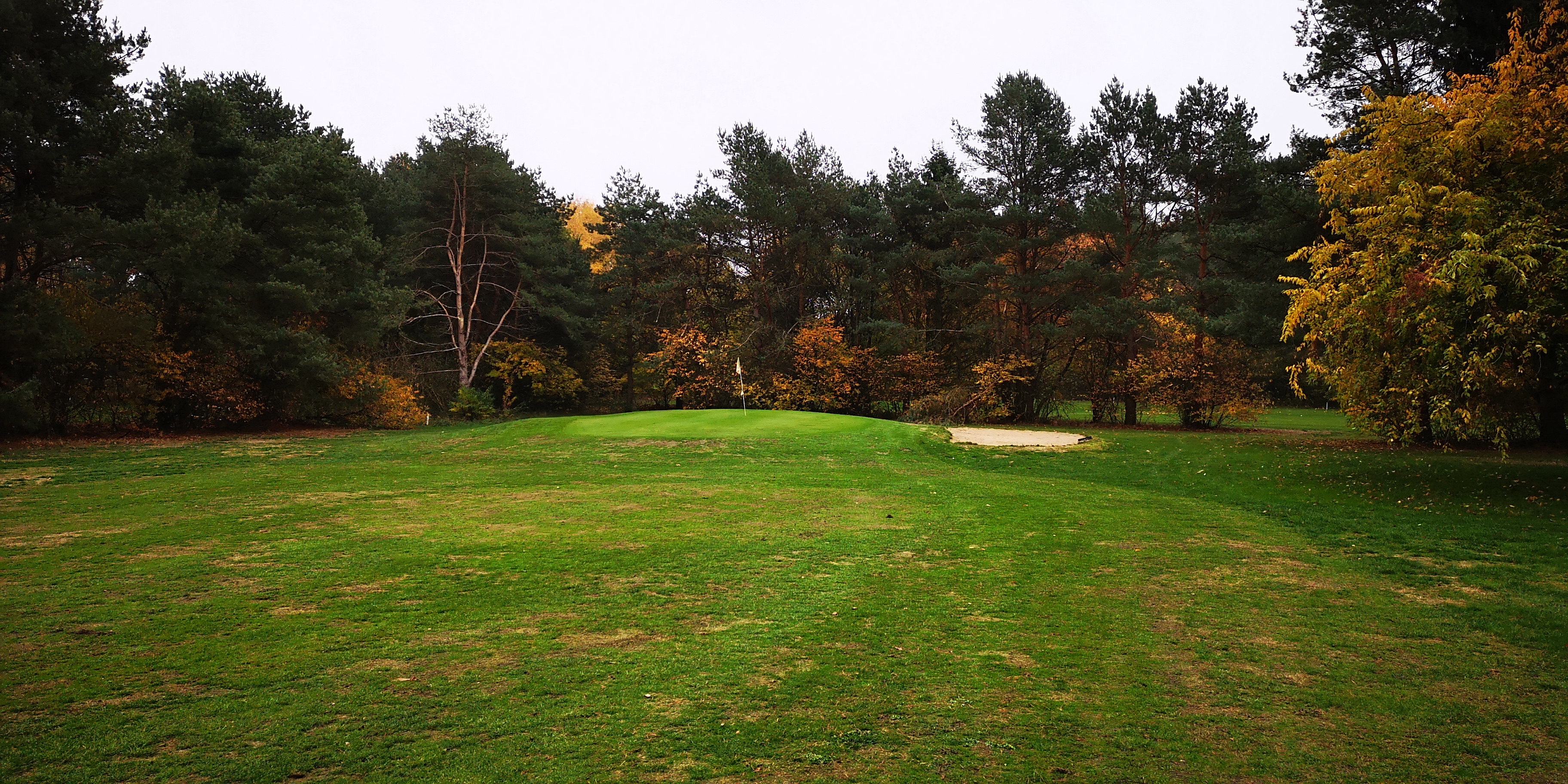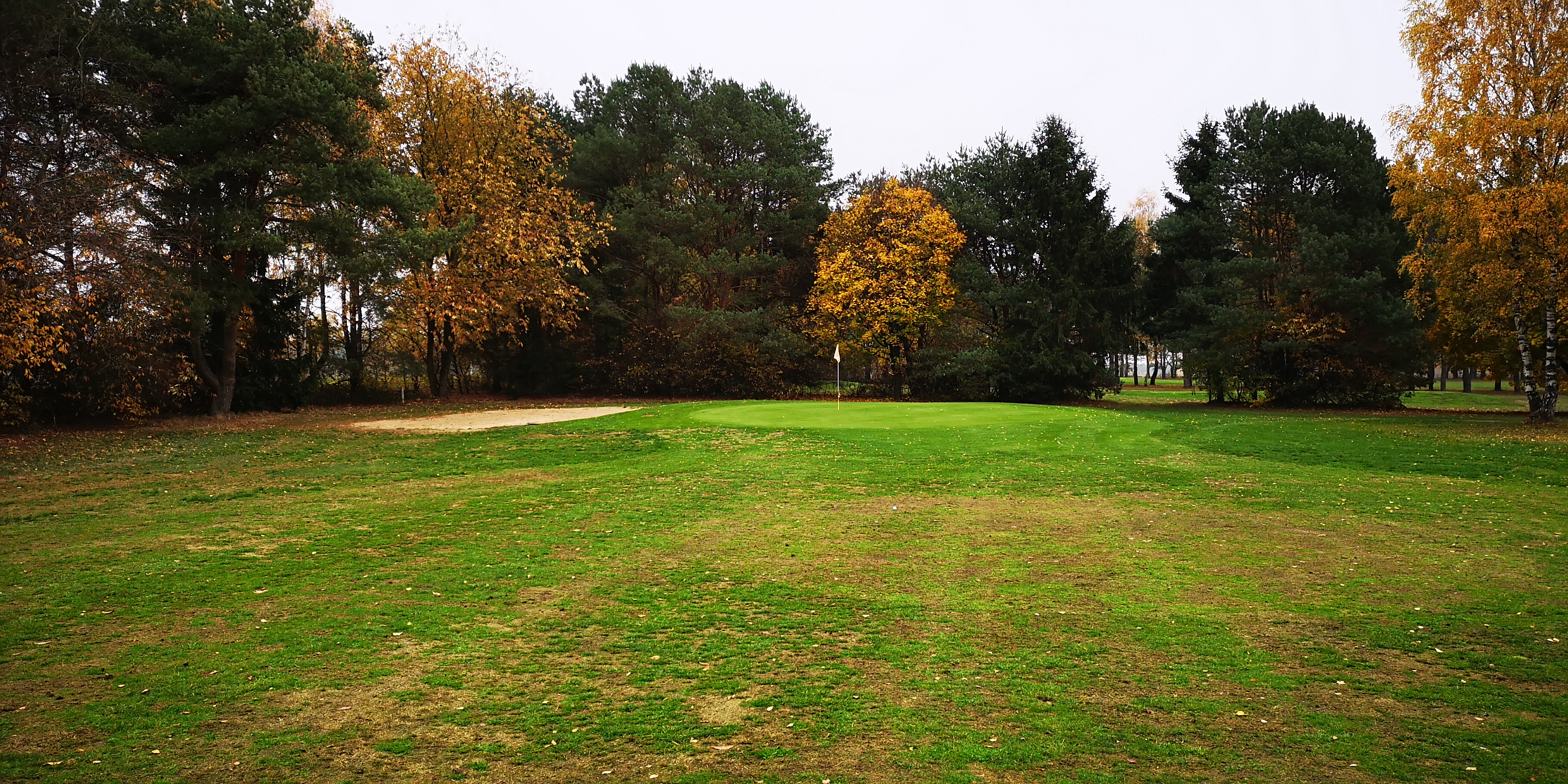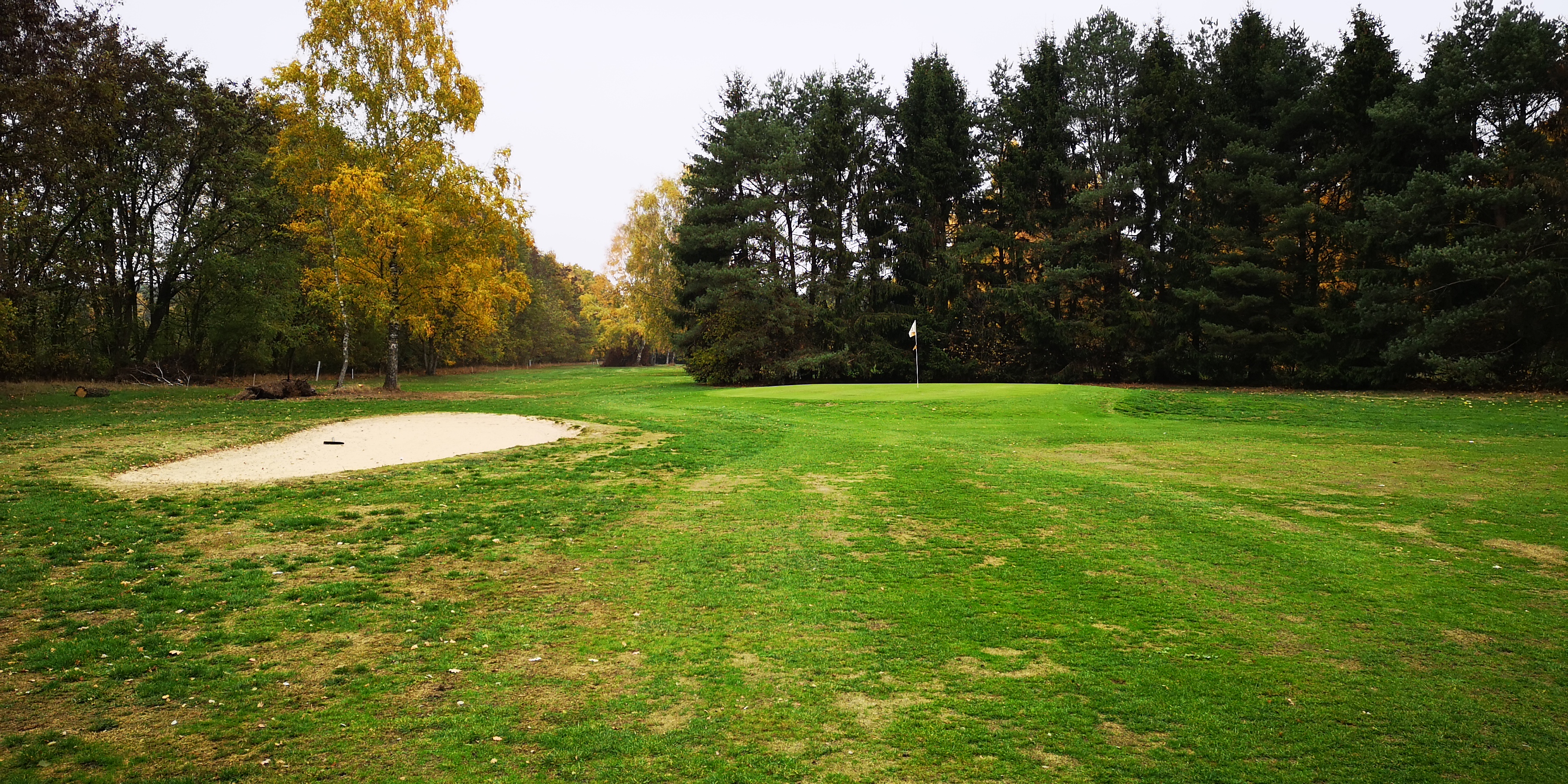 Da aber die Grüns auf dem Kurzplatz Soltau alle kaum 10 Meter Durchmesser haben, wähle ich den offiziellen Weg. Ein mittleres Eisen geradeaus sorgt dafür, dass man mit dem zweiten Schlag knapp 100 Meter zum Grün hat. Das ist diesmal ziemlich eben,