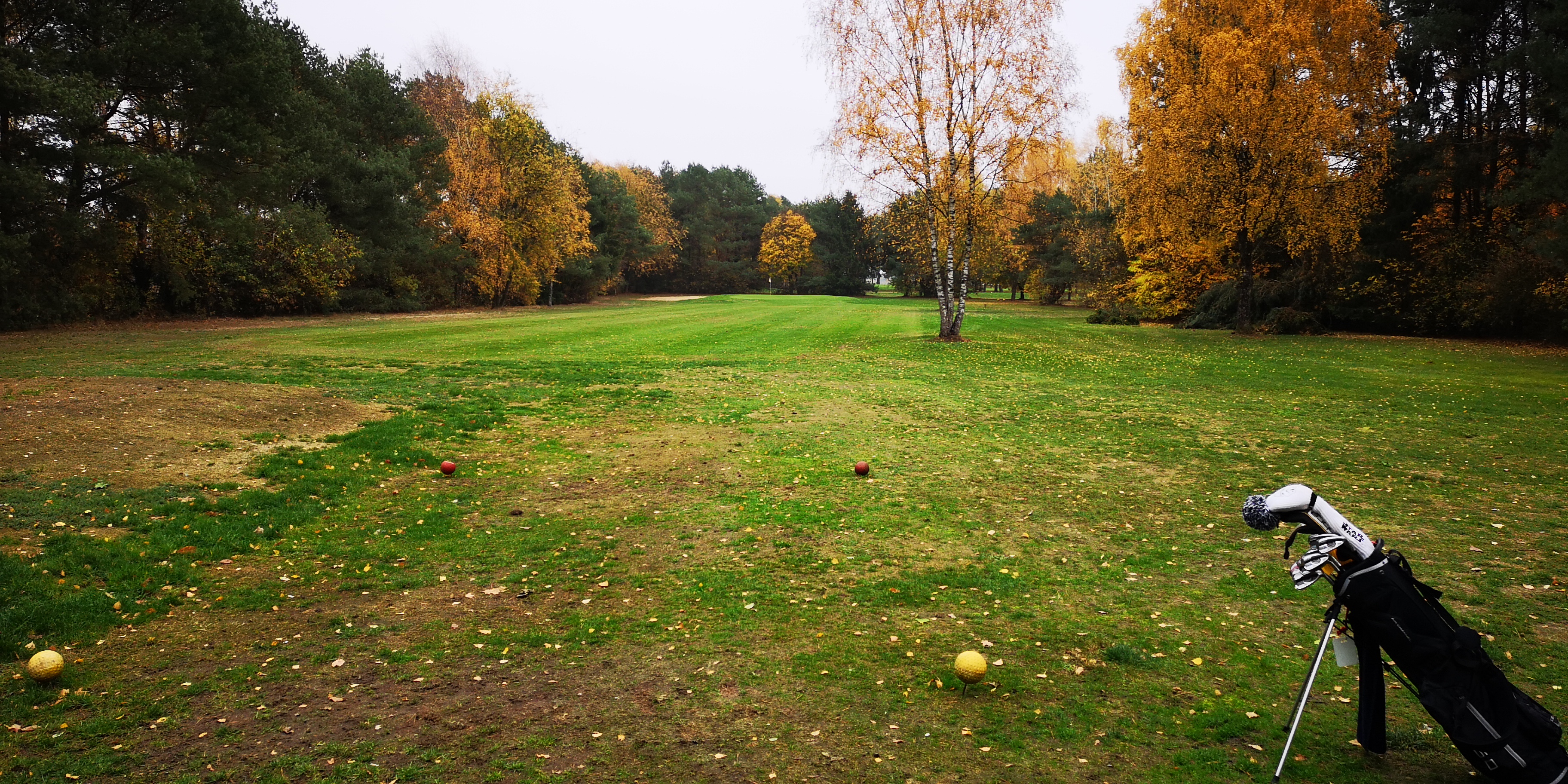 Aber fangen wir von vorne an. Ich bin also mit meinen Bag zum ersten Tee des Kurzplatzes und fand den Einstieg ok. Mit 130 Metern hat das erste Loch eine gute Länge und der Abschlag sah auch gut aus.