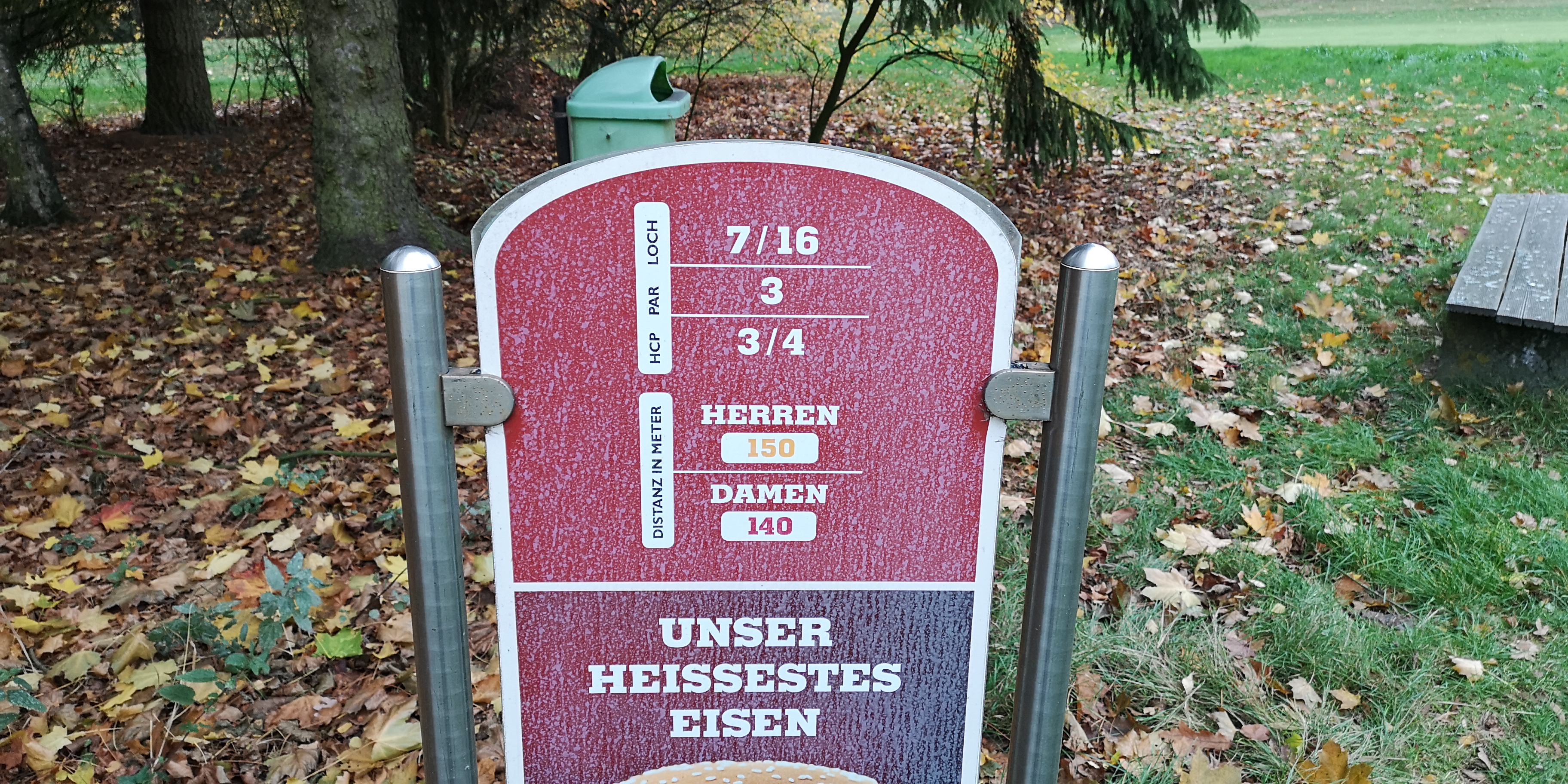 Loch Nummer sieben ist mit 150 Metern das längste Par 3 auf dem Kurzplatz Soltau. Auch hier ist der Abschlag neben den eigentlichen Bereich verlegt worden, der nicht mehr allzu gut ausschaut. Der Pflichtbaum ist dieses Mal relativ nah am Abschlag, aber er ist da. Das Grün ist leicht erhöht (als Buckel, versteht sich) und fällt nach vorne ab.
