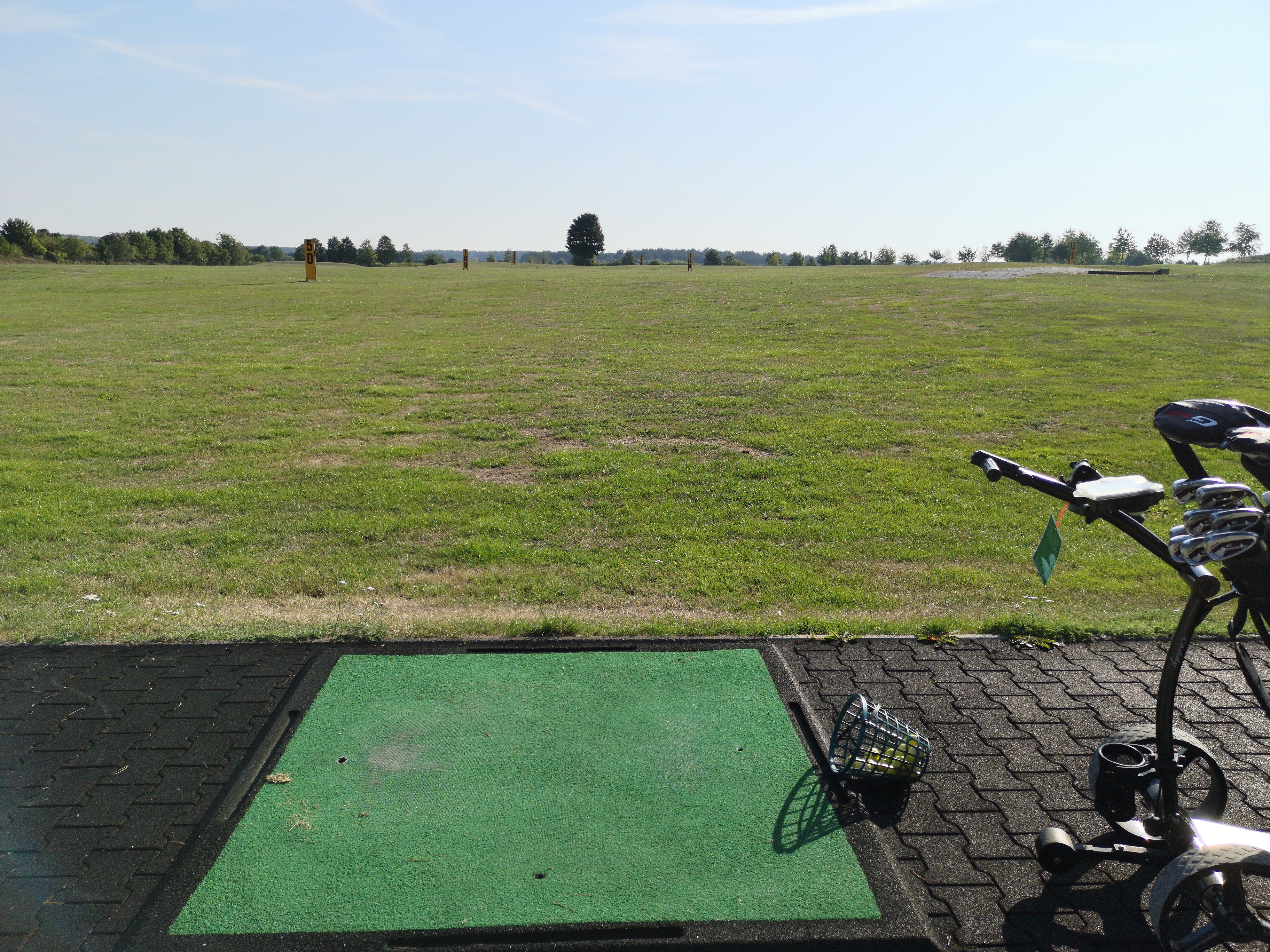 Nach einer kurzen Session auf der Driving Range – es gibt leider für 1 Euro nur gefühlt 13 Bälle – sind wir rechtzeitig vor unserer Startzeit zum ersten Abschlag.