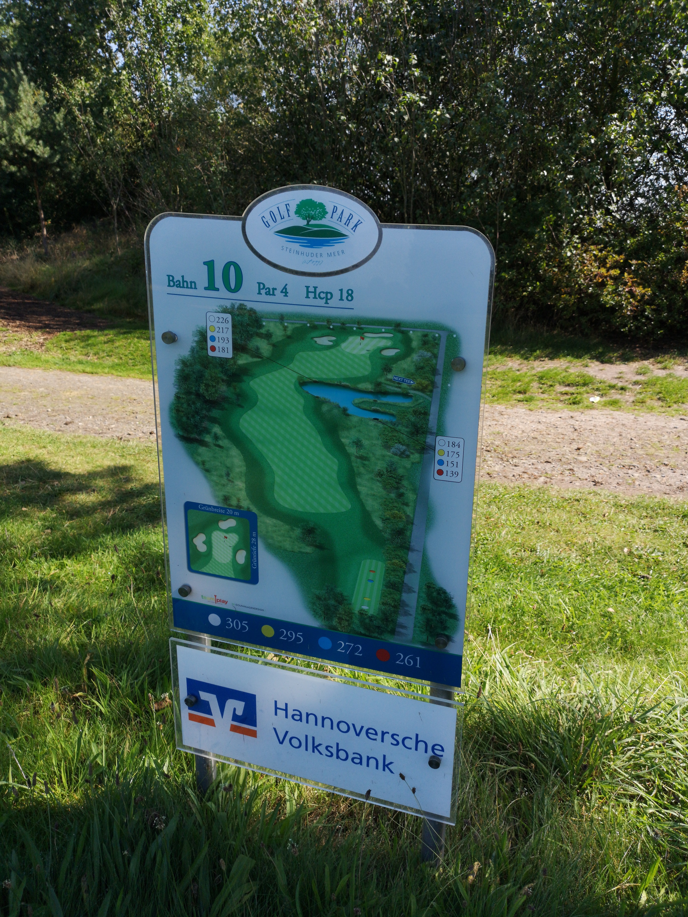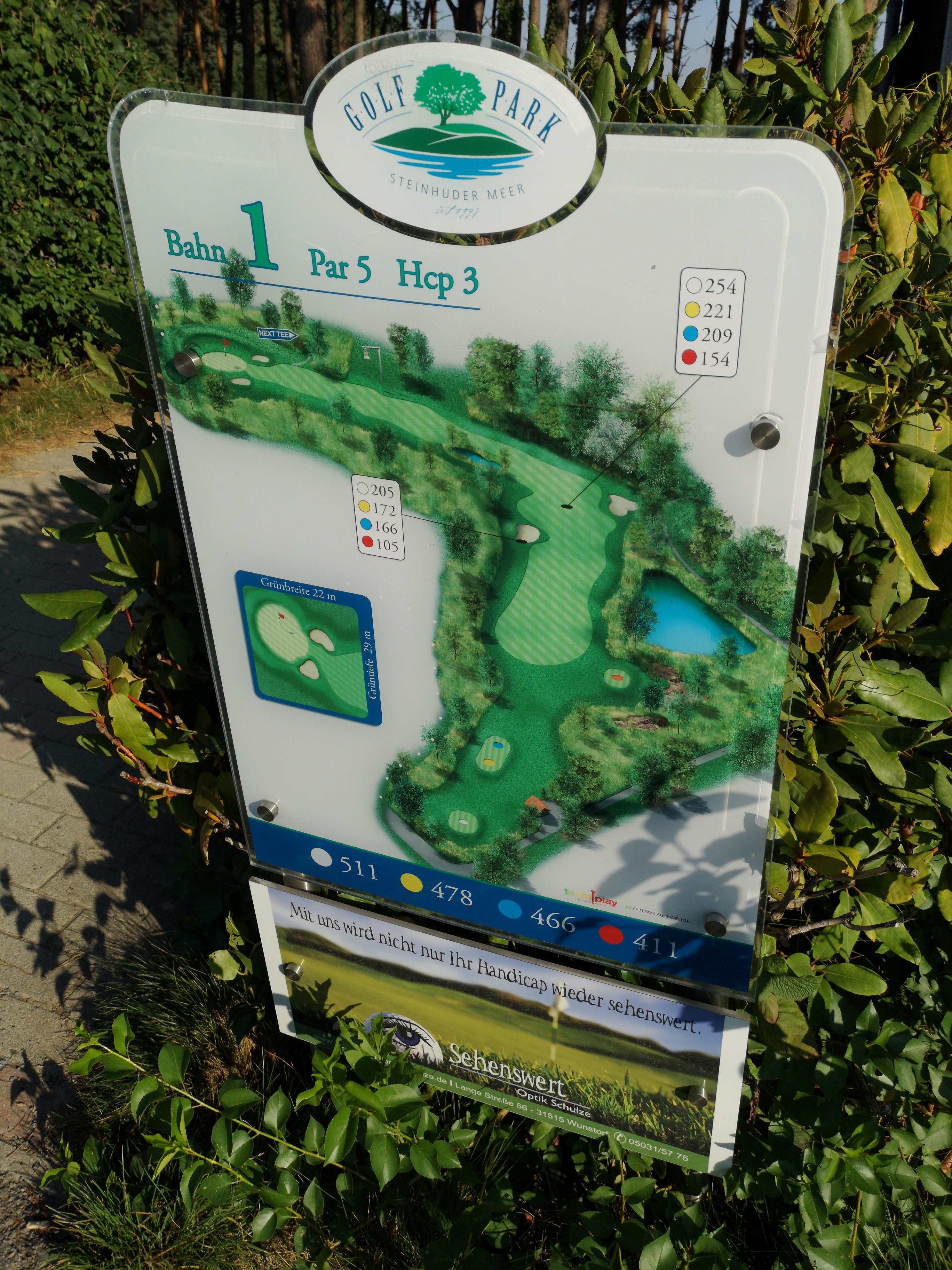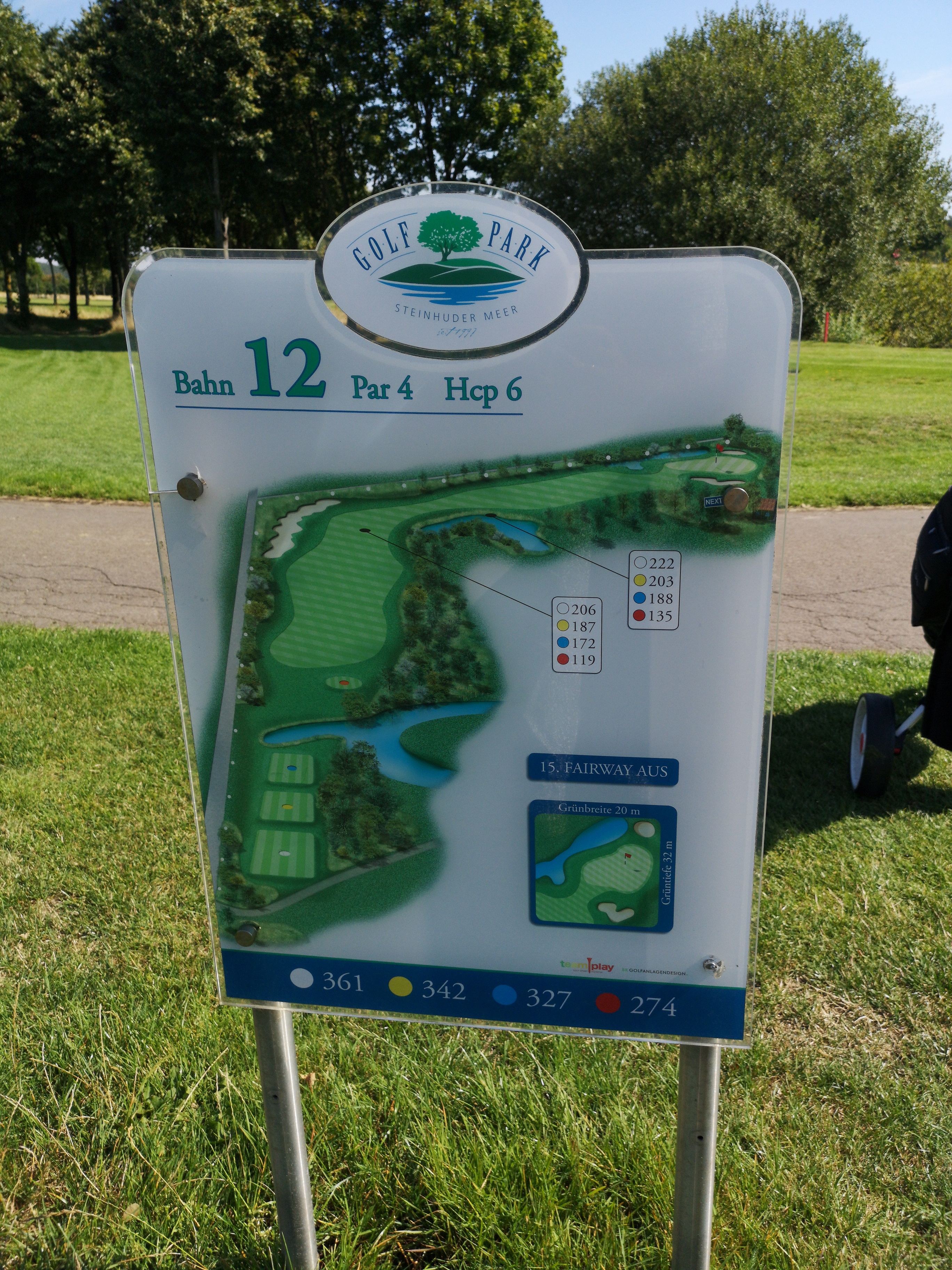 Vor uns waren zwei Spieler im Cart schon unterwegs und wir konnten erst einmal die Tafel mit der Bahnenbeschreibung studieren. Diese Tafeln finde ich im GolfPark Steinhuder Meer wirklich gut gelungen.