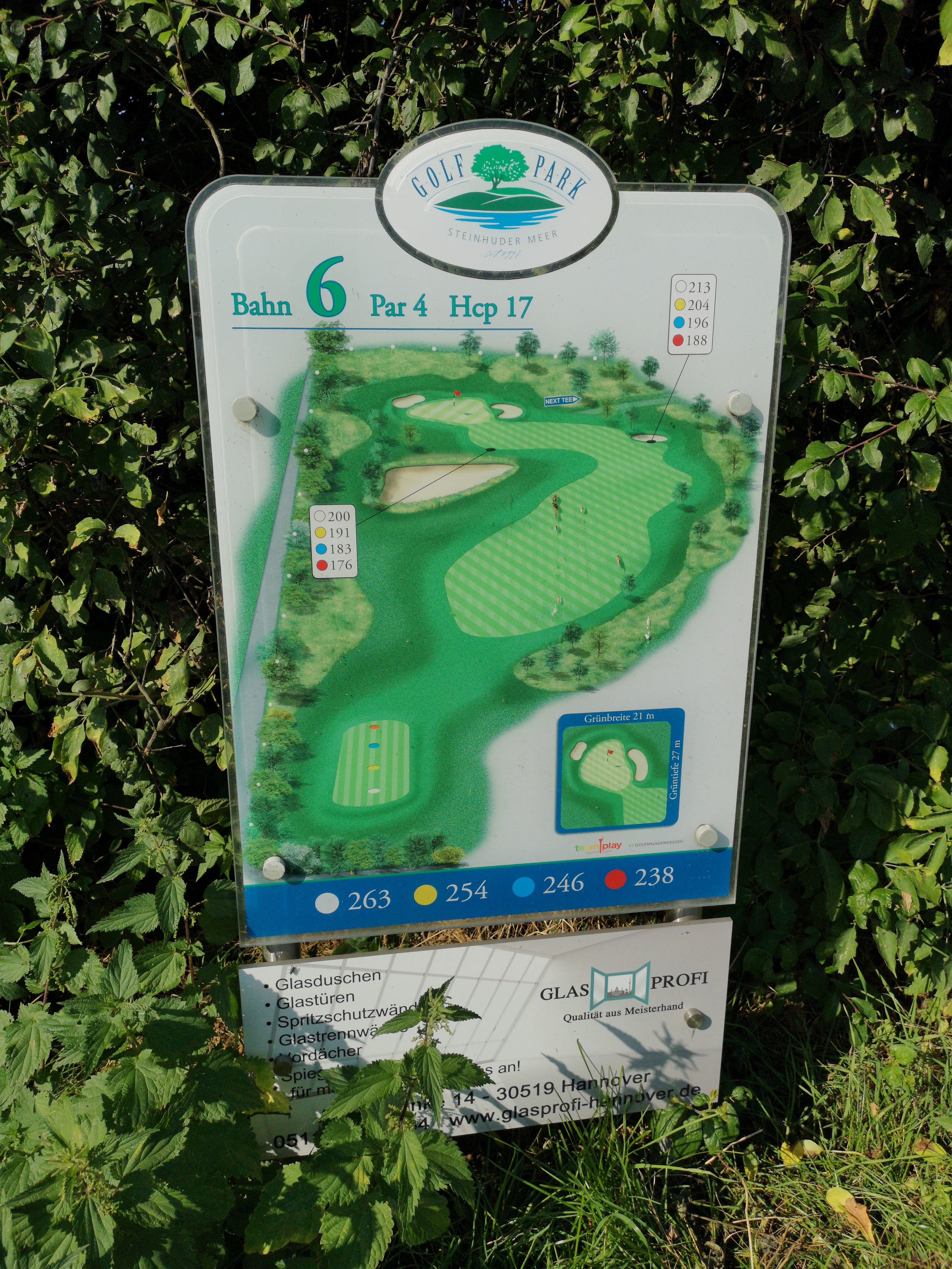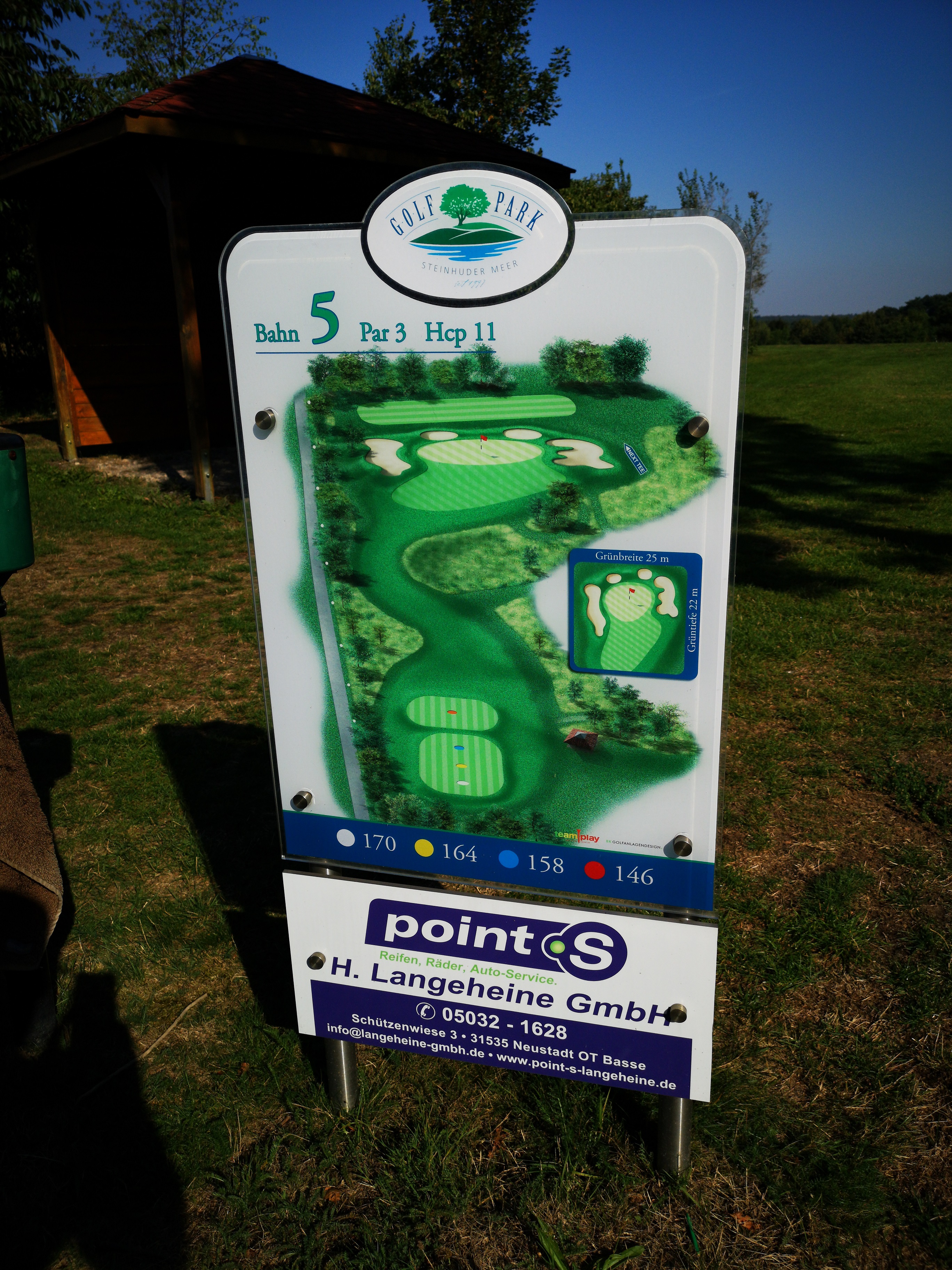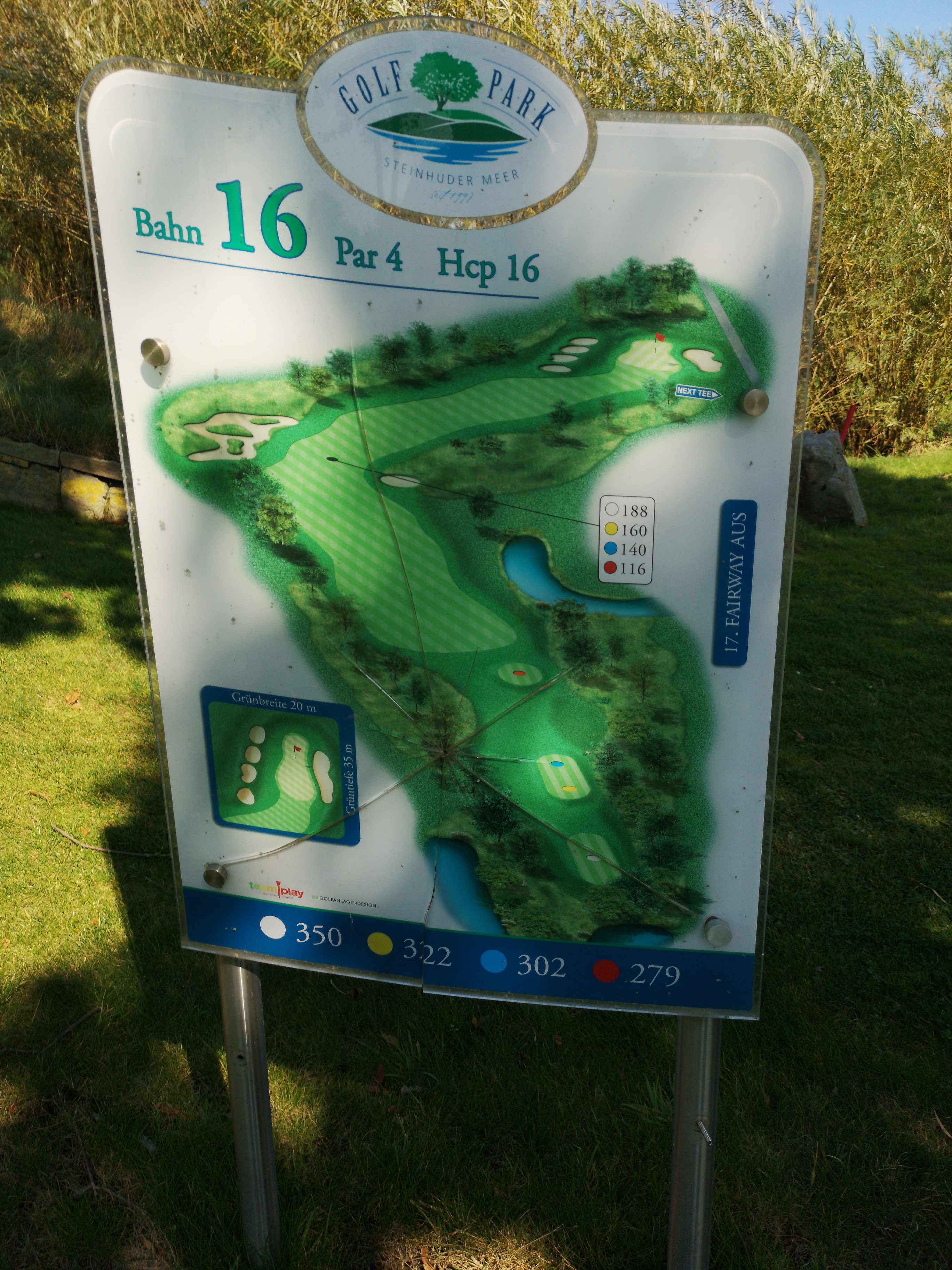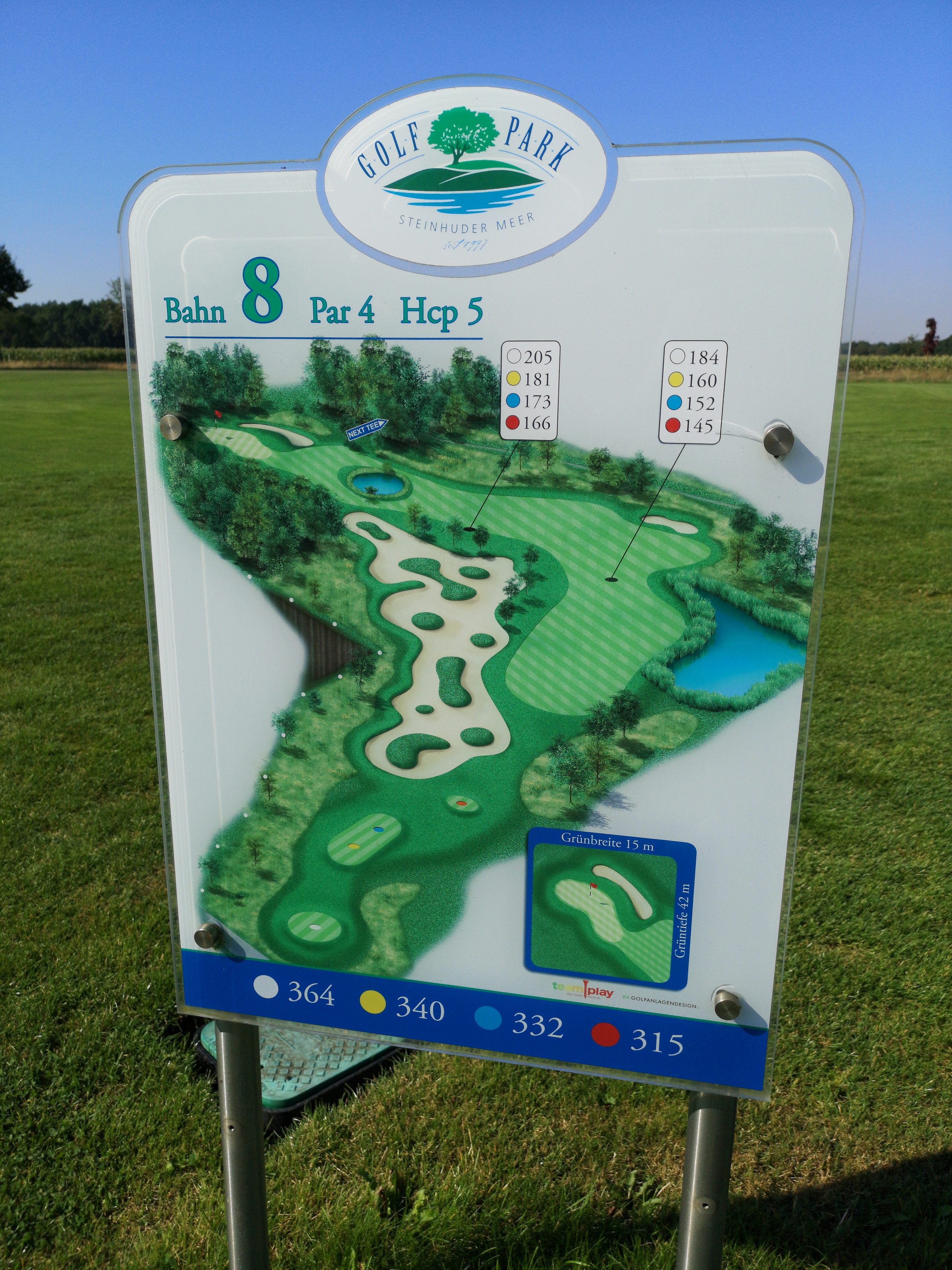 Vor uns waren zwei Spieler im Cart schon unterwegs und wir konnten erst einmal die Tafel mit der Bahnenbeschreibung studieren. Diese Tafeln finde ich im GolfPark Steinhuder Meer wirklich gut gelungen.