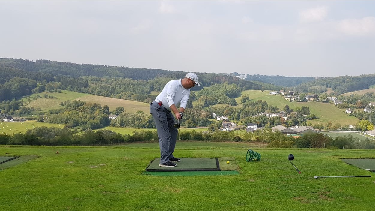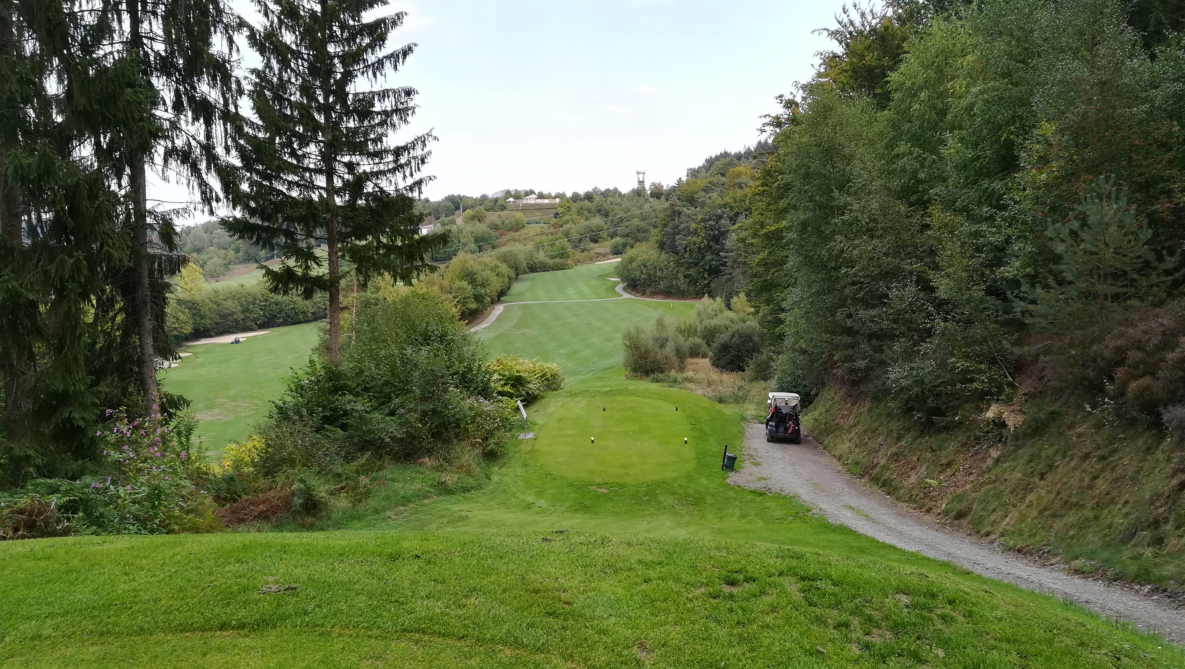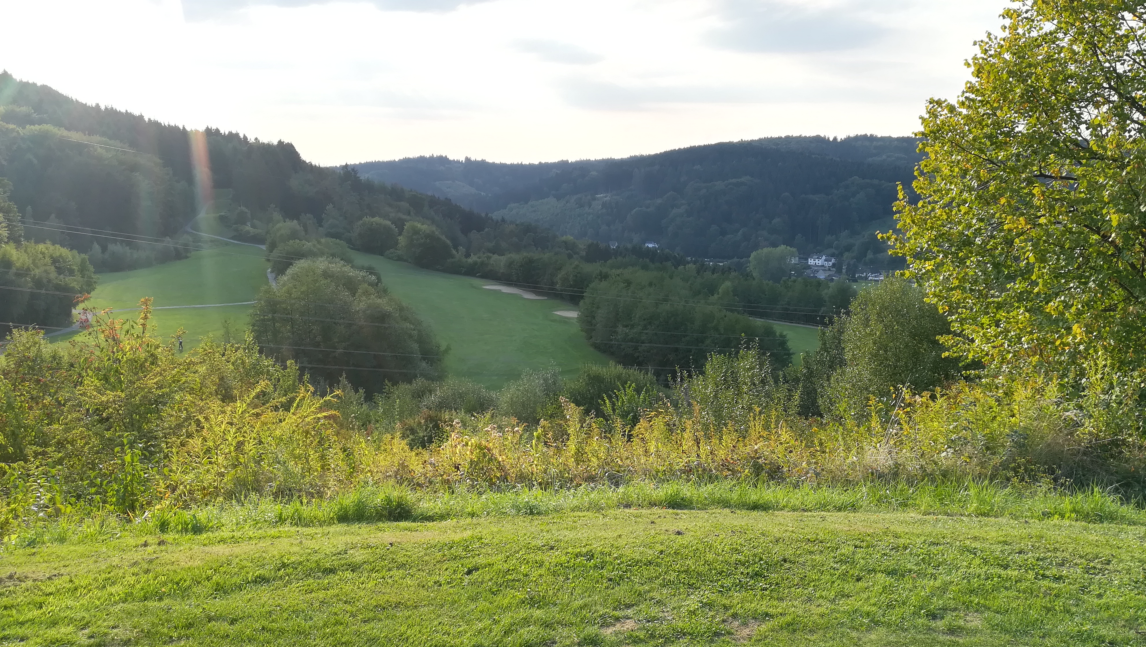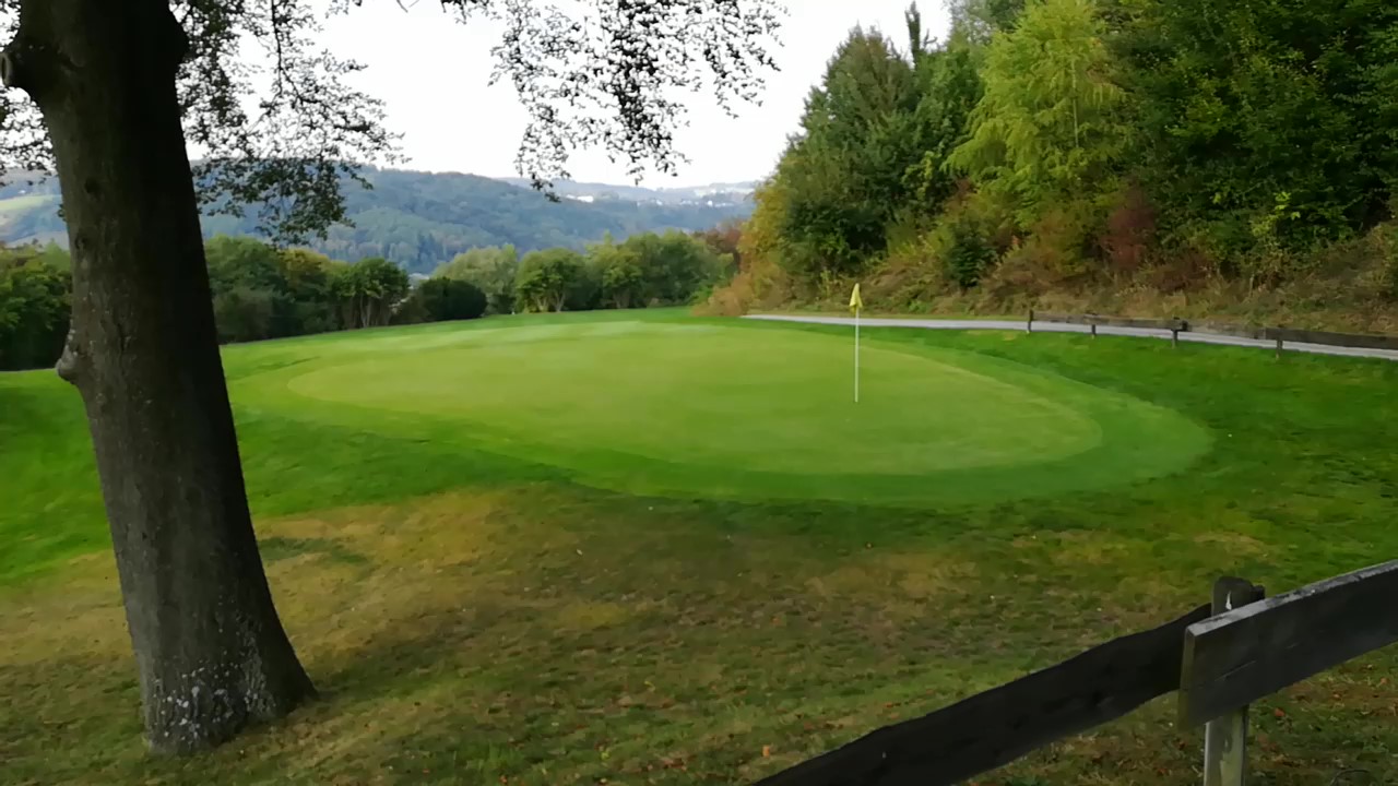 Die Anfahrt ist für einen Flachlandspieler wie mich schon interessant. Der Platz vom Golfclub am Lüderich liegt in Overath bei Köln und ist an einen Berghang gebaut. Also geht es ziemlich steil aufwärts, bis man endlich den Parkplatz erreicht.