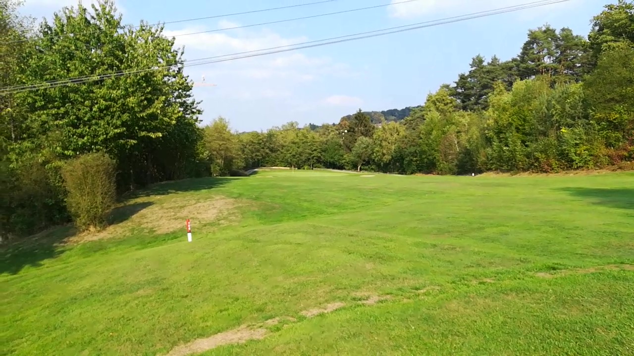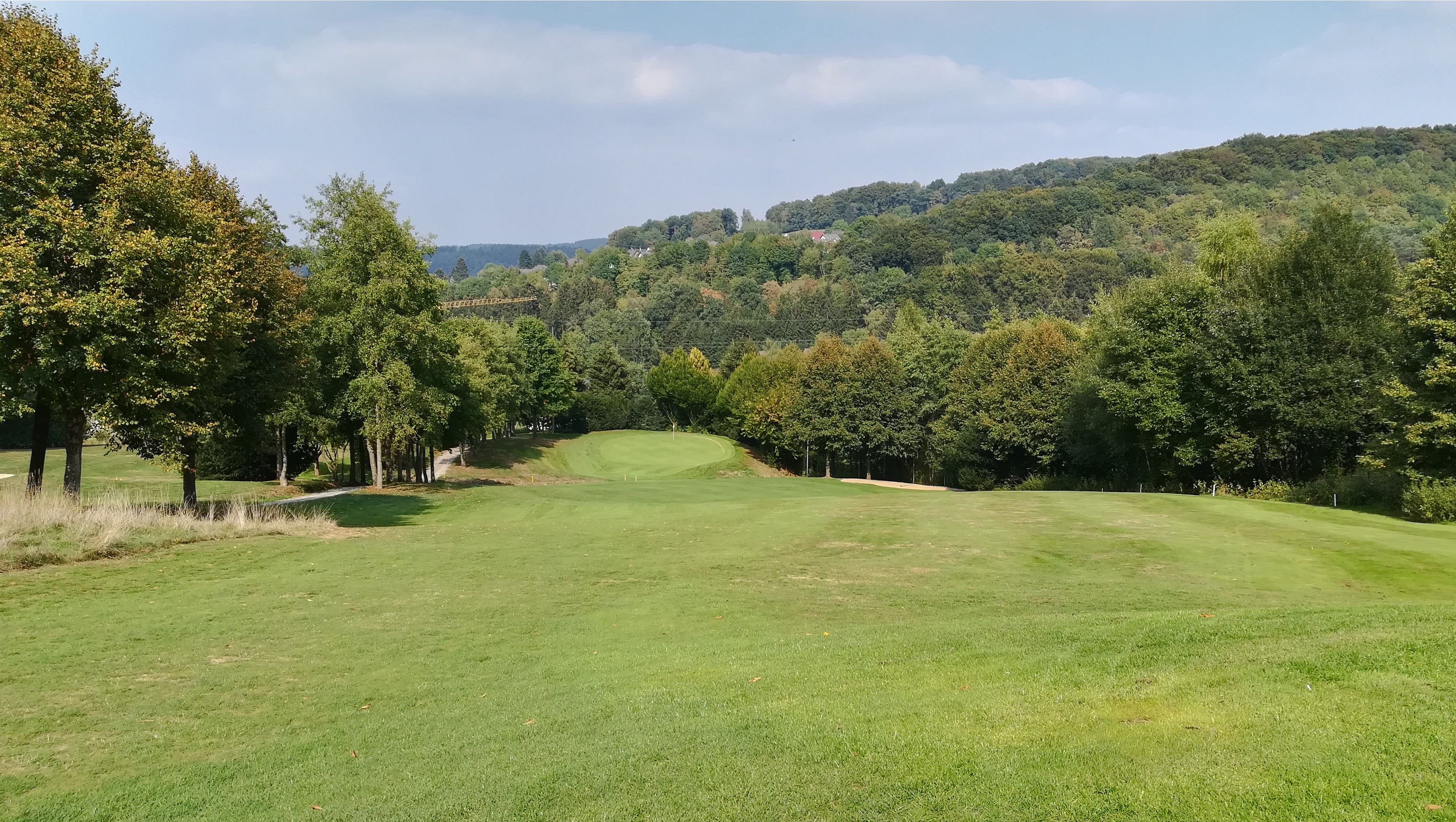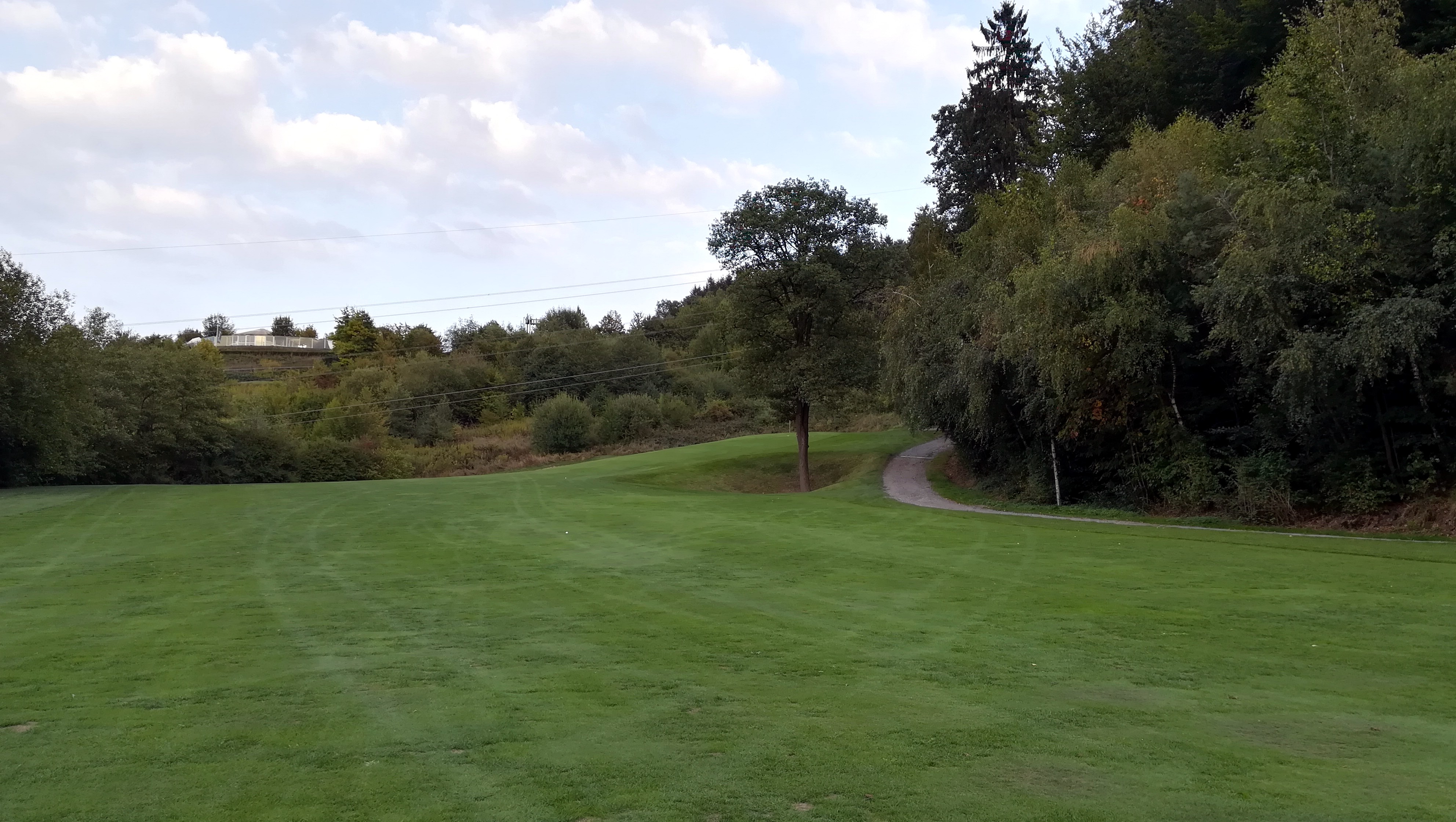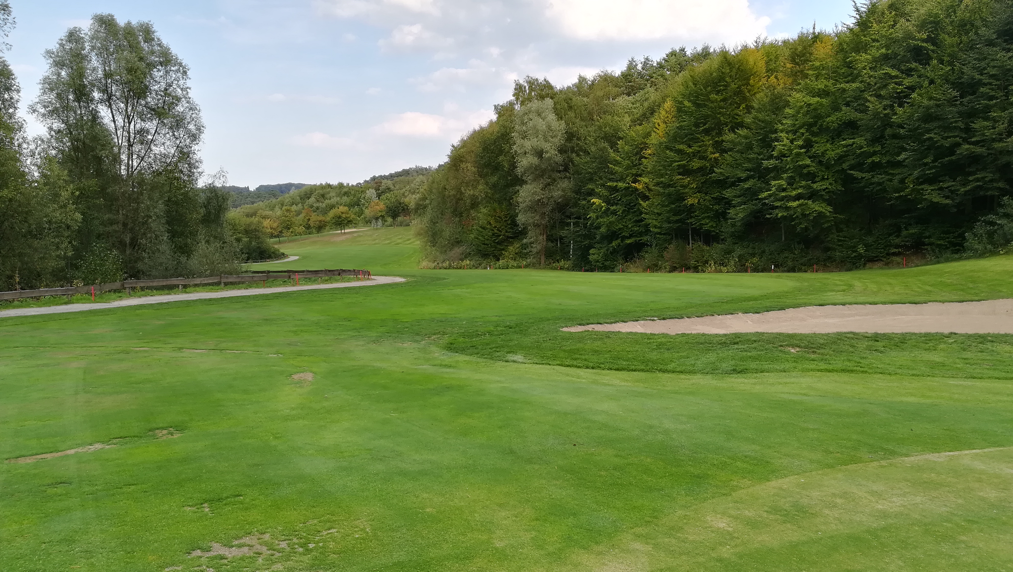 Nach etwa 200 Metern knickt die Bahn nach rechts und es beginnt der Anstieg zum Grün. Im Knick selbst ist ein schöner Teich, der das Fairway in der Breite fast halbiert. Zum Grün hoch wird es steiler, Längenkontrolle ist hier das A und O. Abgesehen davon hat man wieder einen fantastischen Blick, wenn man denn das Grün einmal erreicht hat.