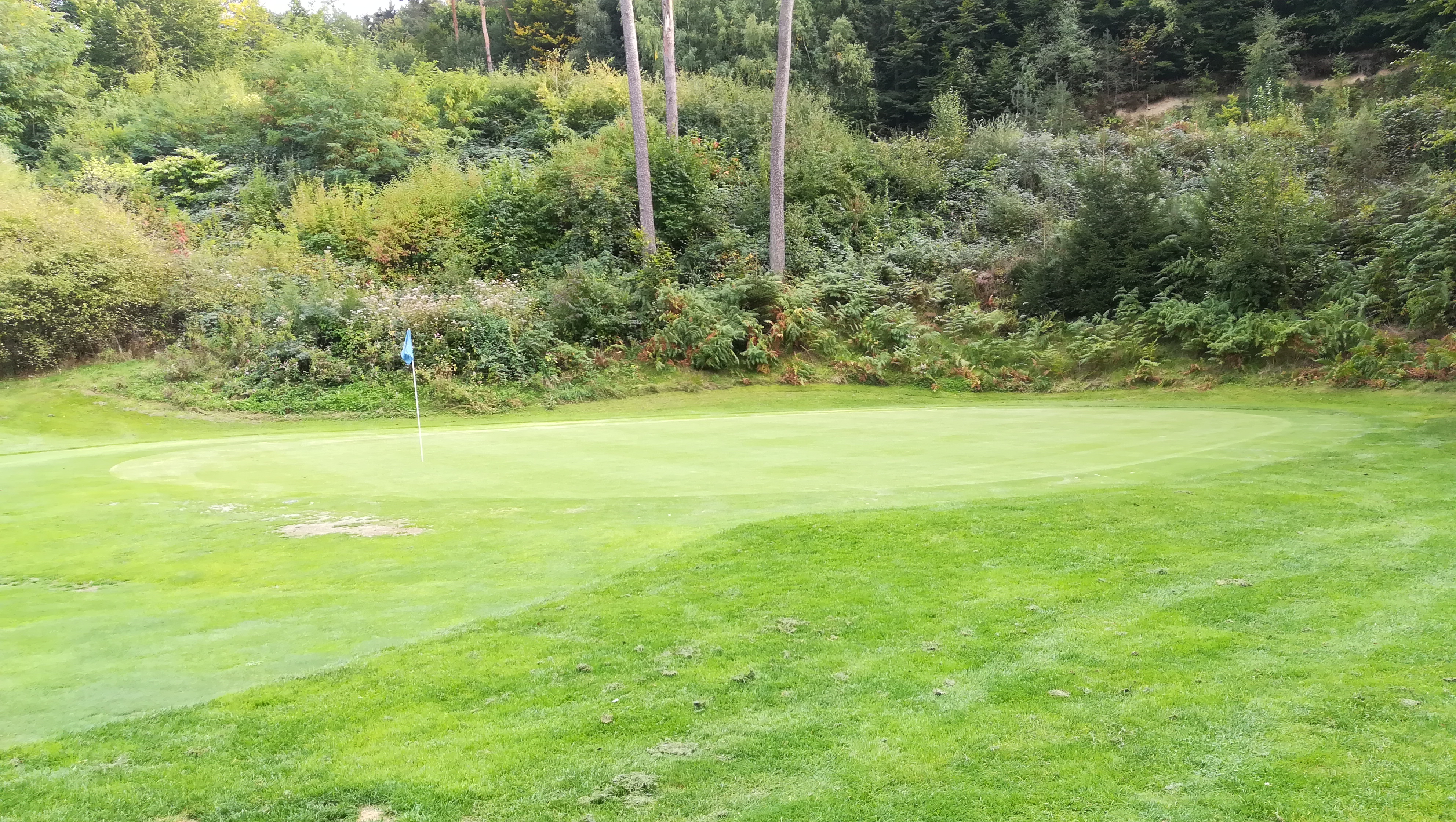 Wenn man das Grün verfehlt, dann kann man nur hoffen, den kleinen aber tiefen Grünbunker hinten links zu treffen, denn sonst verabschiedet sich der Ball auf Nimmerwiedersehen in den dichten Wald.