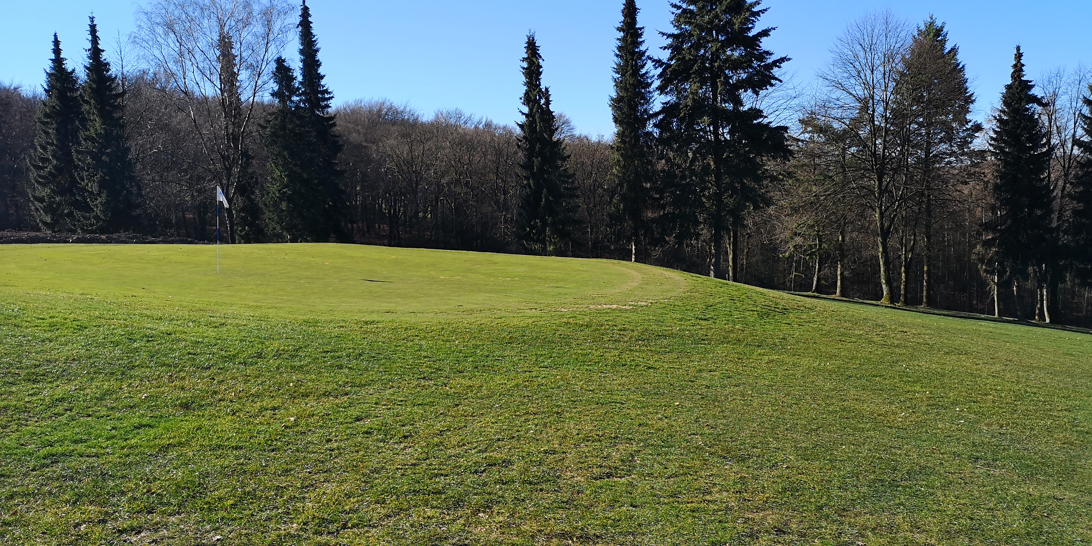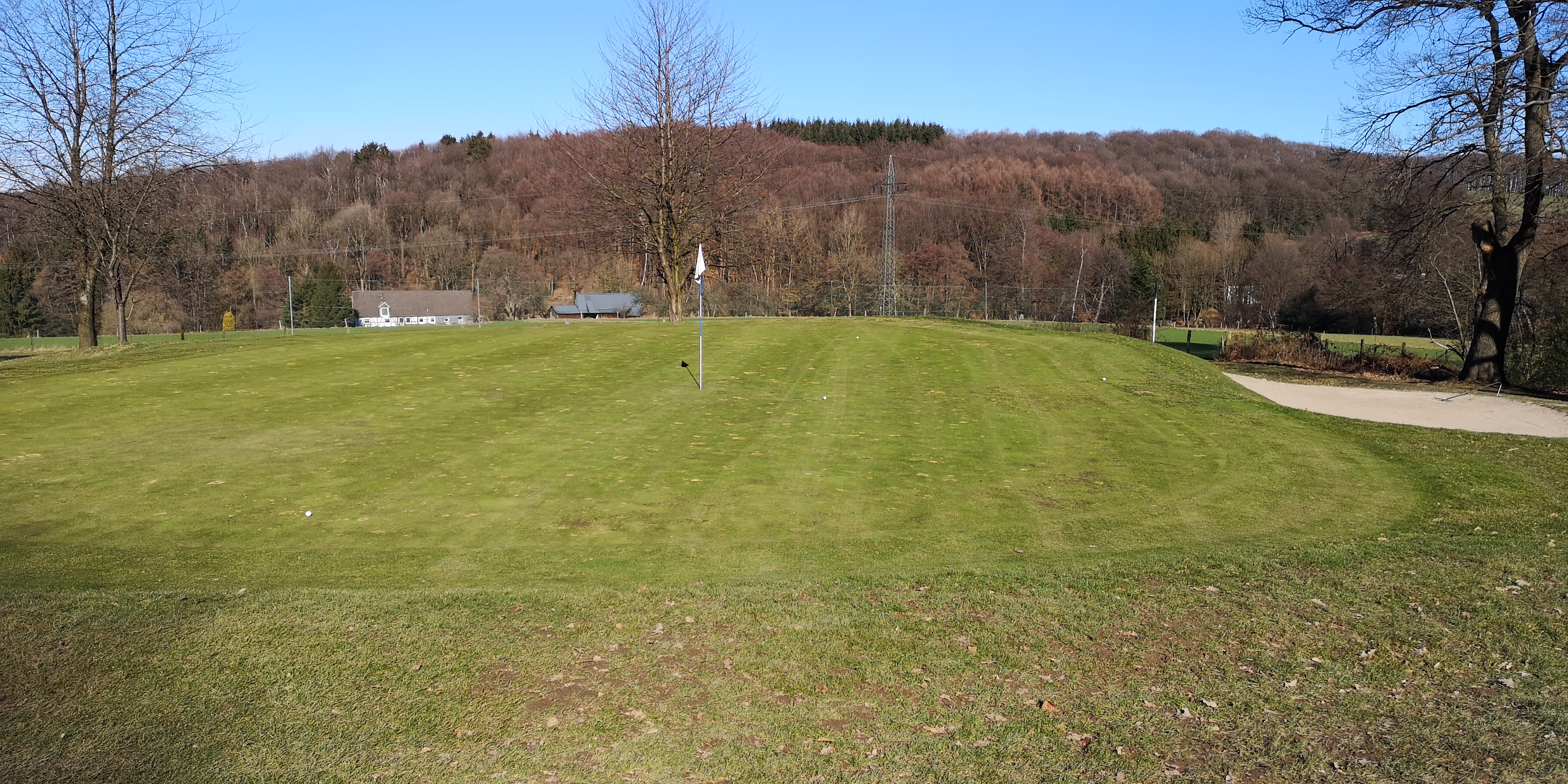Das Grün ist durchschnittlich groß und hat links eine Welle, die je nach Fahnenposition durchaus interessant sein kann. In der Bahnenübersicht auf der Homepage ist vorne links noch ein Teich eingezeichnet, der inzwischen aber „nur noch“ ein Bunker und damit weniger gefährlich ist. Ein weiterer Bunker wartet hinten rechts vom Grün auf zu lange Annäherungen.