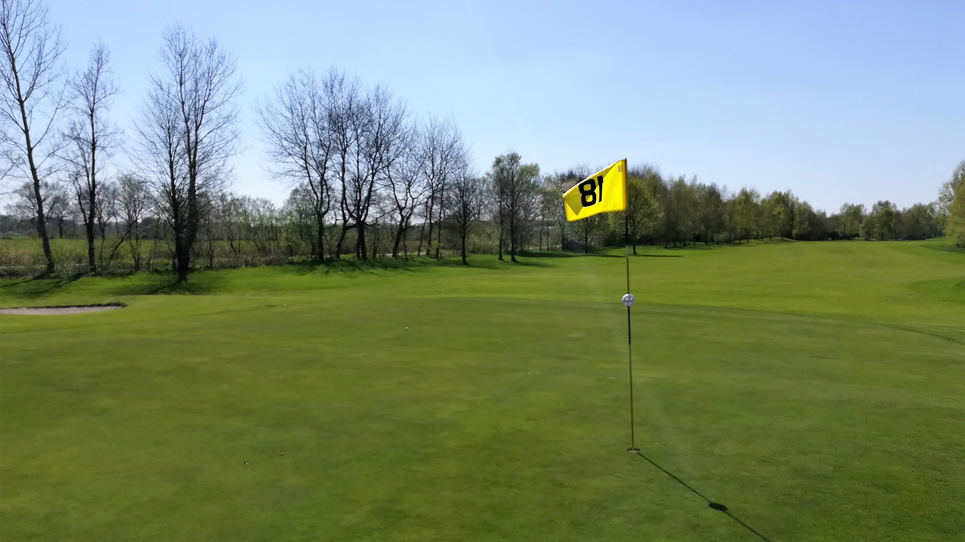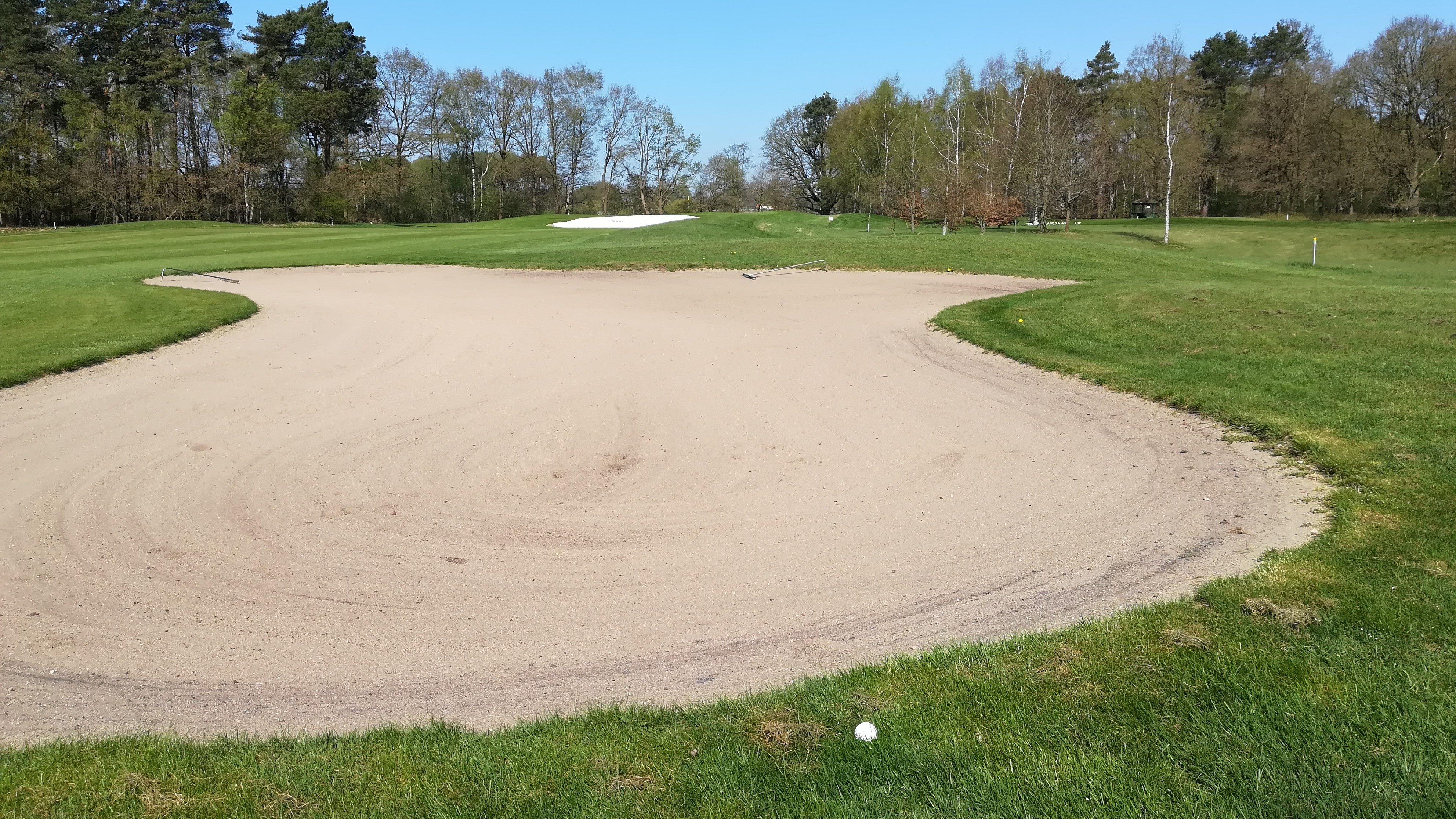 Das ist aber gut so, denn der Bunker unmittelbar vor dem Grün hat eine über ein Meter hohe Steilwand in Spielrichtung, die das direkte Anspiel ausgesprochen riskant macht. Weil Marcus den Bunker mit seinem zweiten Schlag trifft, muss er aus weniger als einem Meter Entfernung über diese Steilwand spielen und zeigt einen fast perfekten Bunkerschlag, der herrlich aufs Grün segelt.