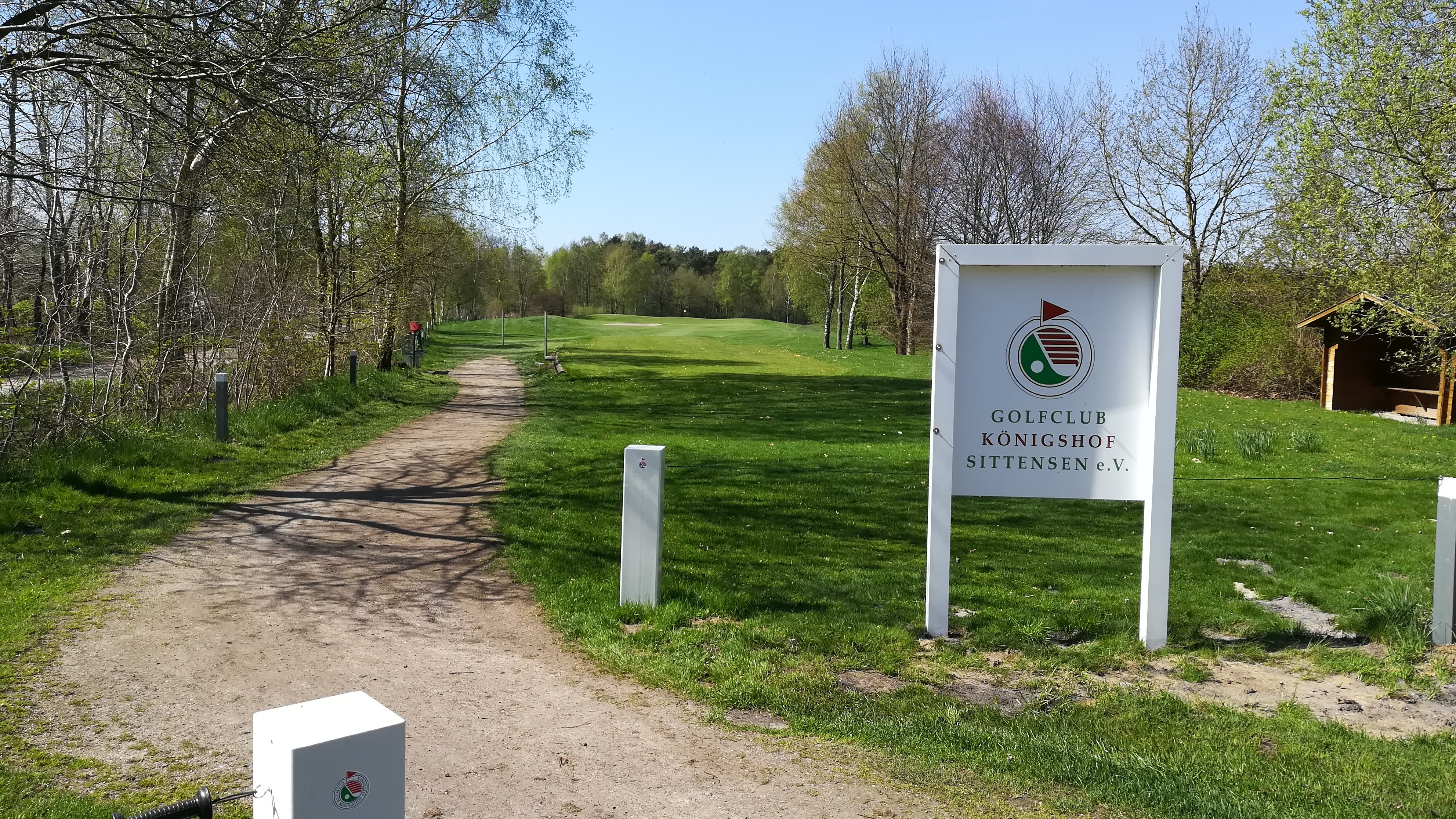 Nach über eineinhalb Stunden Autofahrt über Bundesstraßen kam endlich das Ortsschild „Sittensen“. Der Platz ist gut ausgeschildert und liegt am Rande eines Neubaugebietes, durch das man fährt. Kleiner Schotterparkplatz, daneben einige Felder und ein kleines Clubhaus mit Gastronomie – der erste Eindruck vom Golfclub Königshof Sittensen ist positiv.