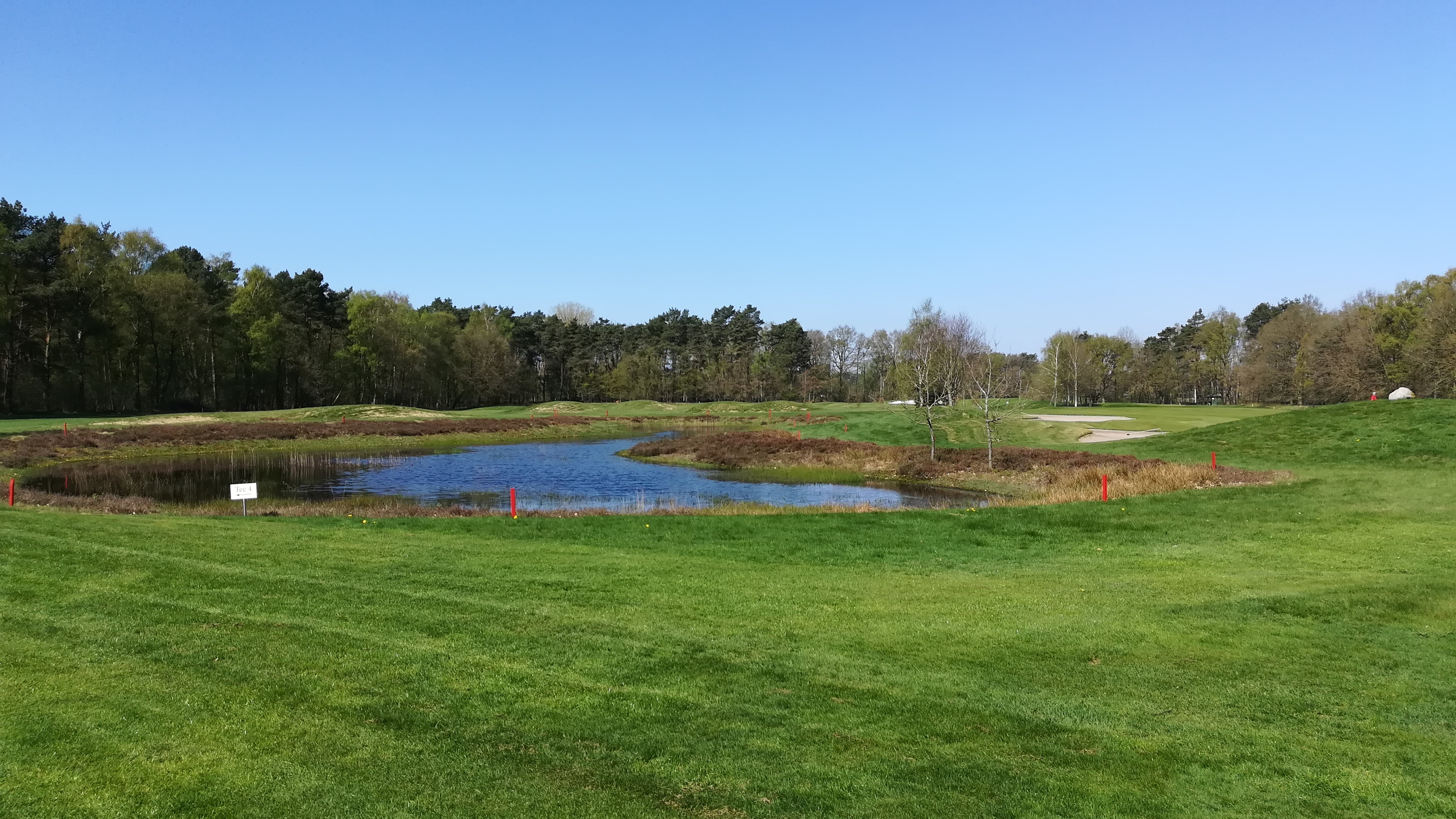 Nach den drei Birken (der schwersten Bahn des Platzes, bei der mich Marcus um mindestens 50 Meter ausdrived) folgt ein mittleres Par 3, das links drei Bunker und rechts einen Teich beherbergt und dadurch alleine schon optisch ein Knaller ist.