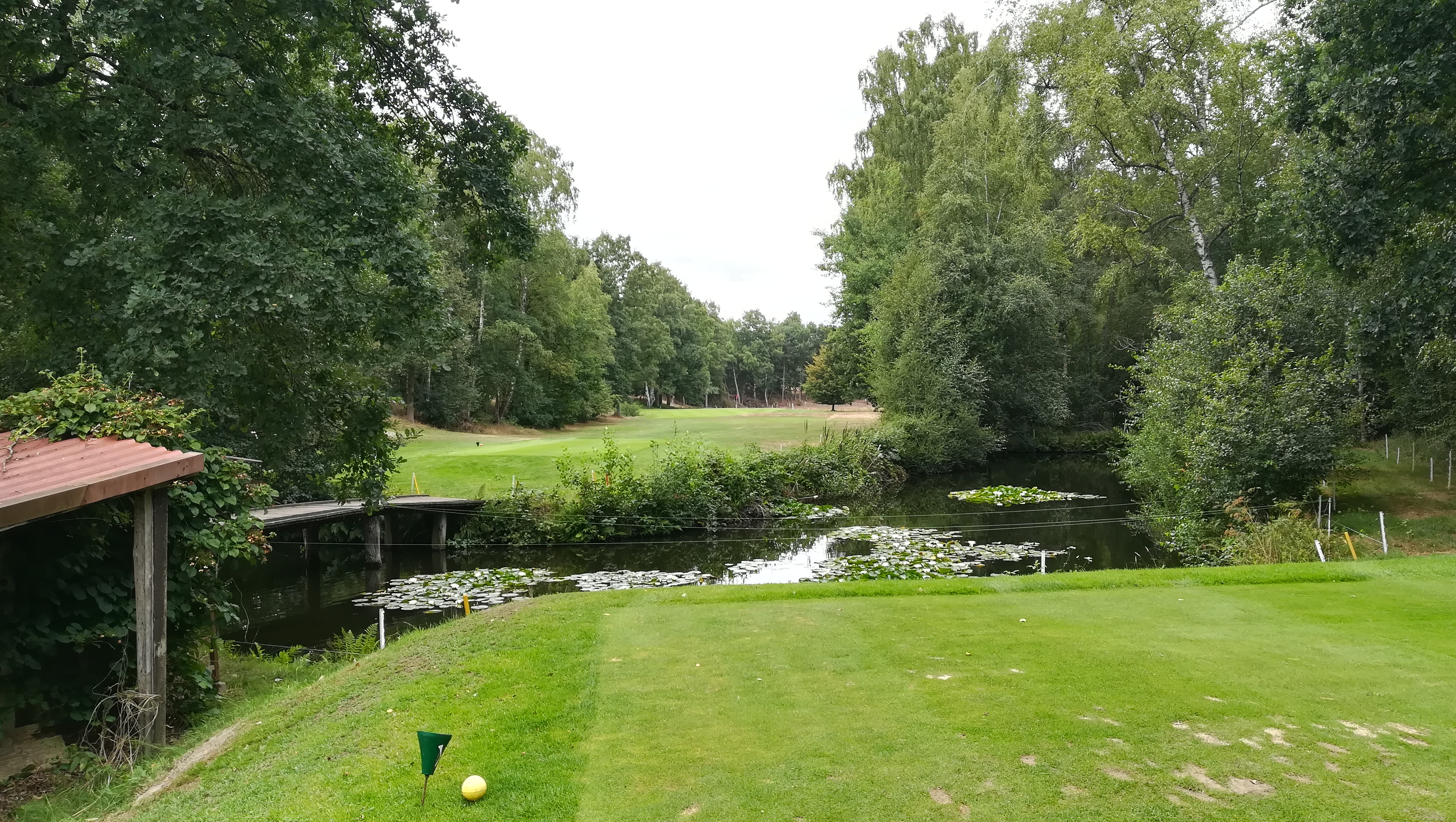 Der Abschlag des folgenden Par 3 geht bei den Herren über einen kleinen Teich, damit man deutlich sieht, was genau noch einmal links vom Grün lauert.