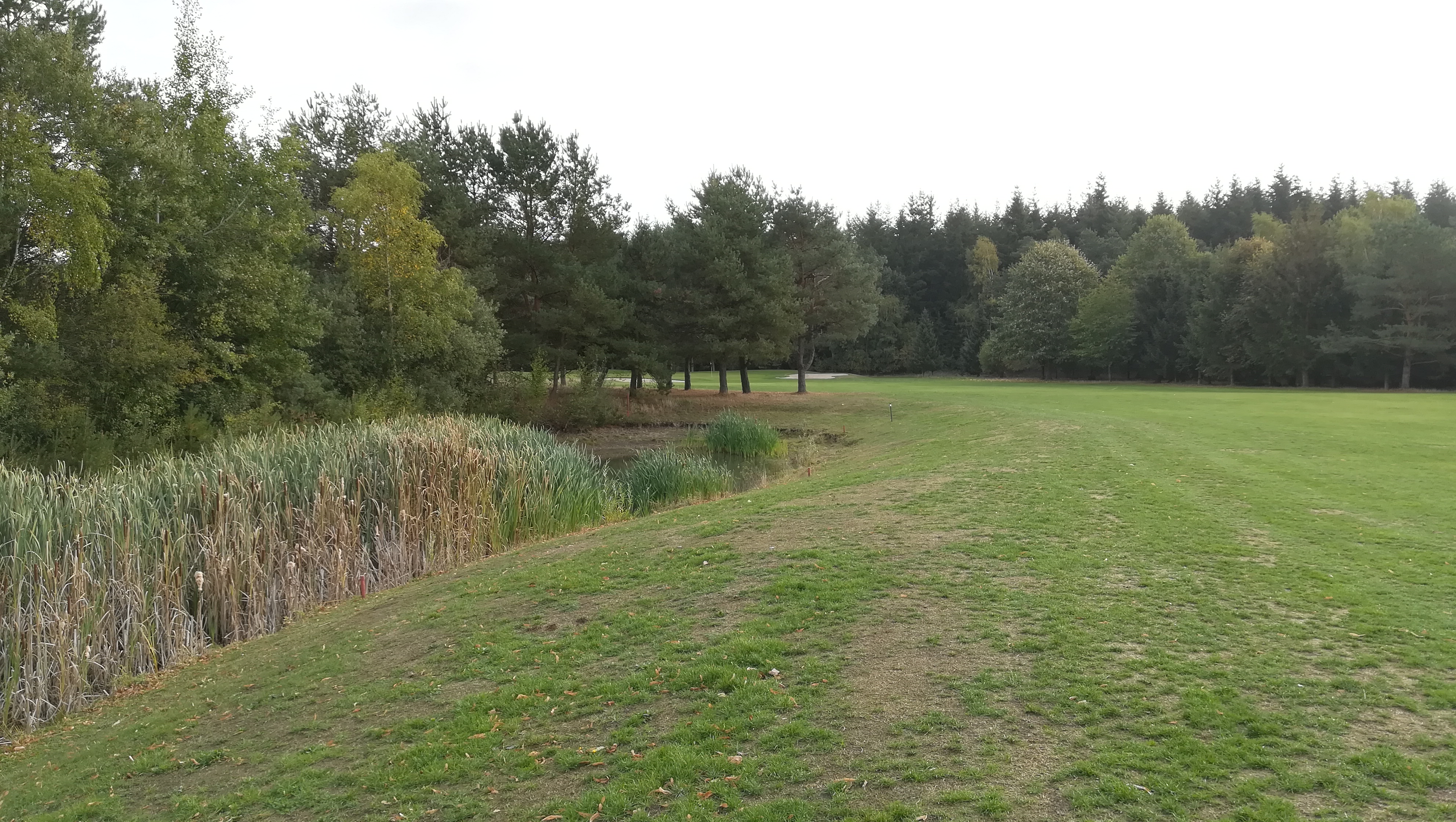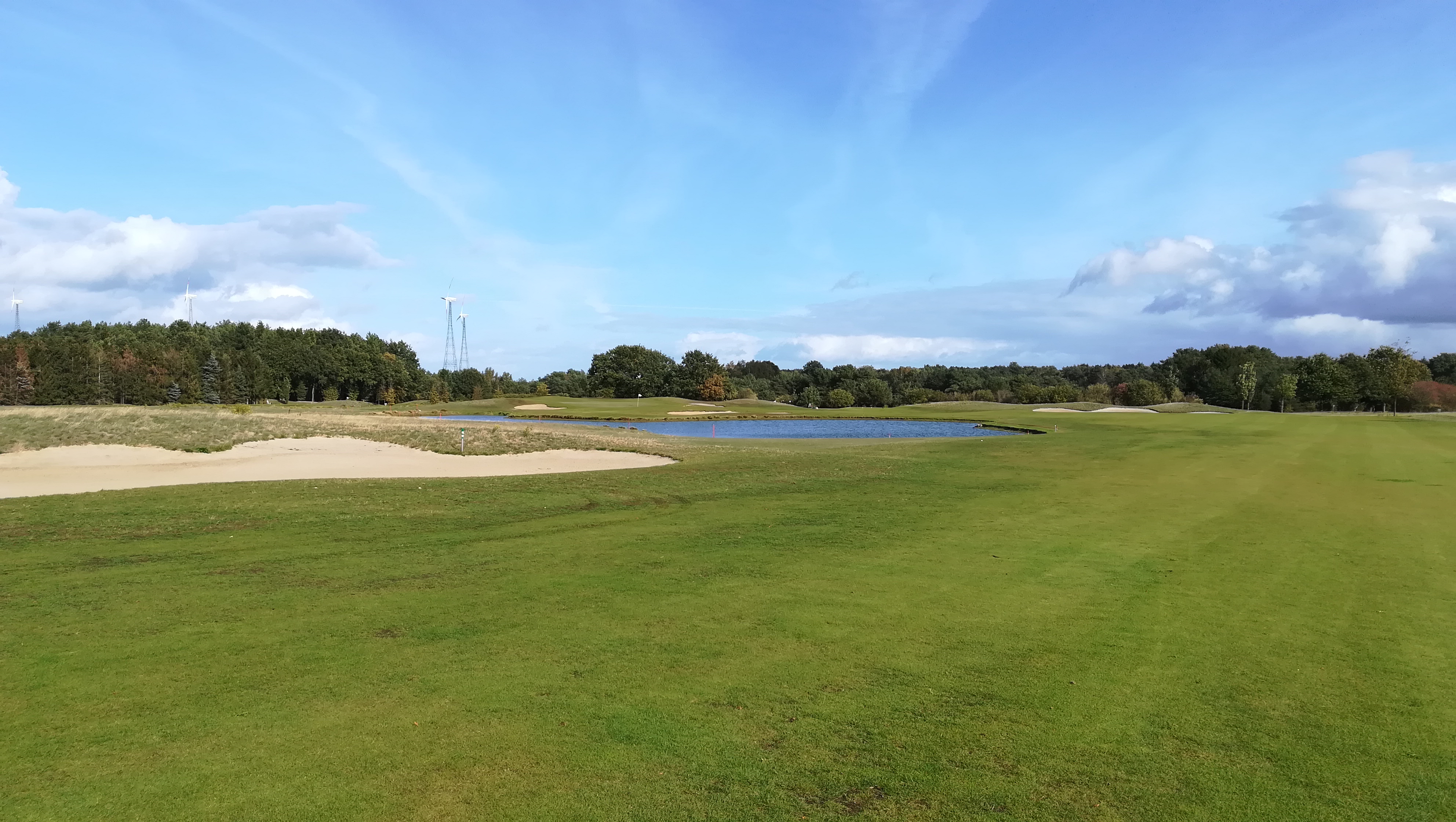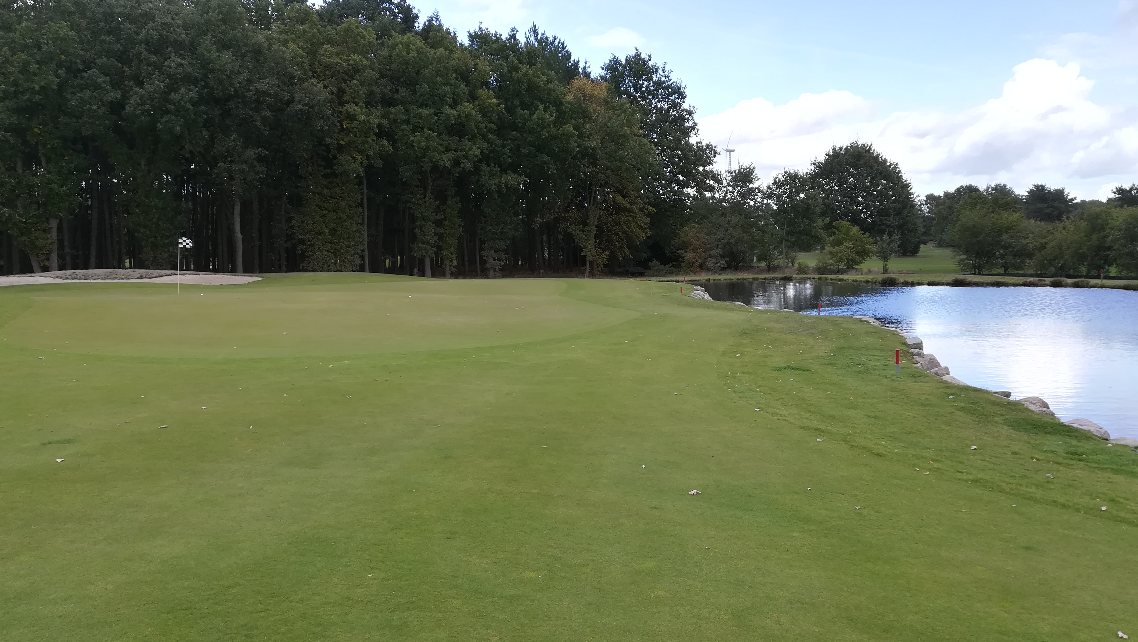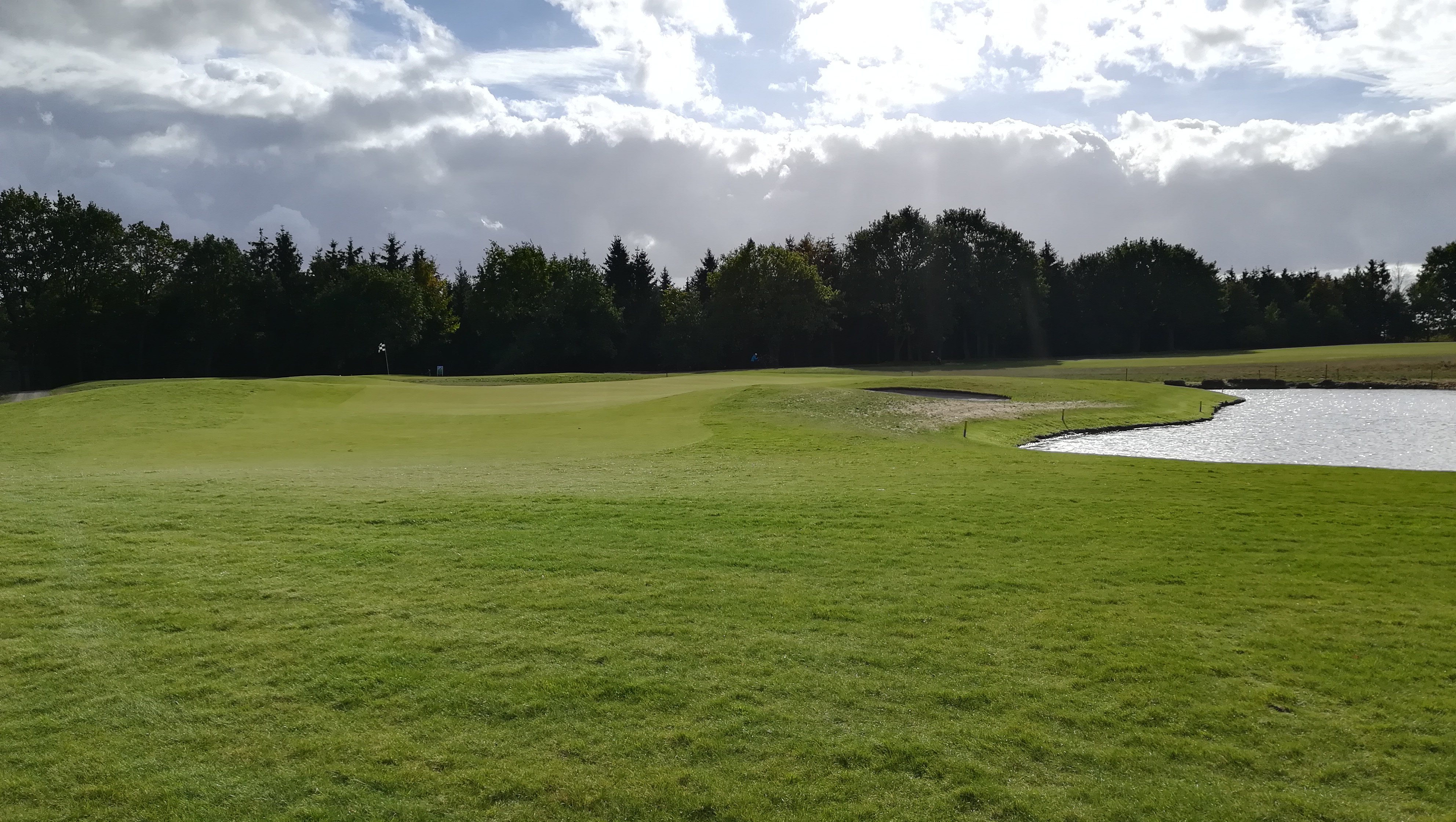 Anschließend geht es vergleichsweise großzügig weiter bis zu einem kleineren Grün, das von zwei Bunkern und einem Teich rechts daneben gut bewacht wird.