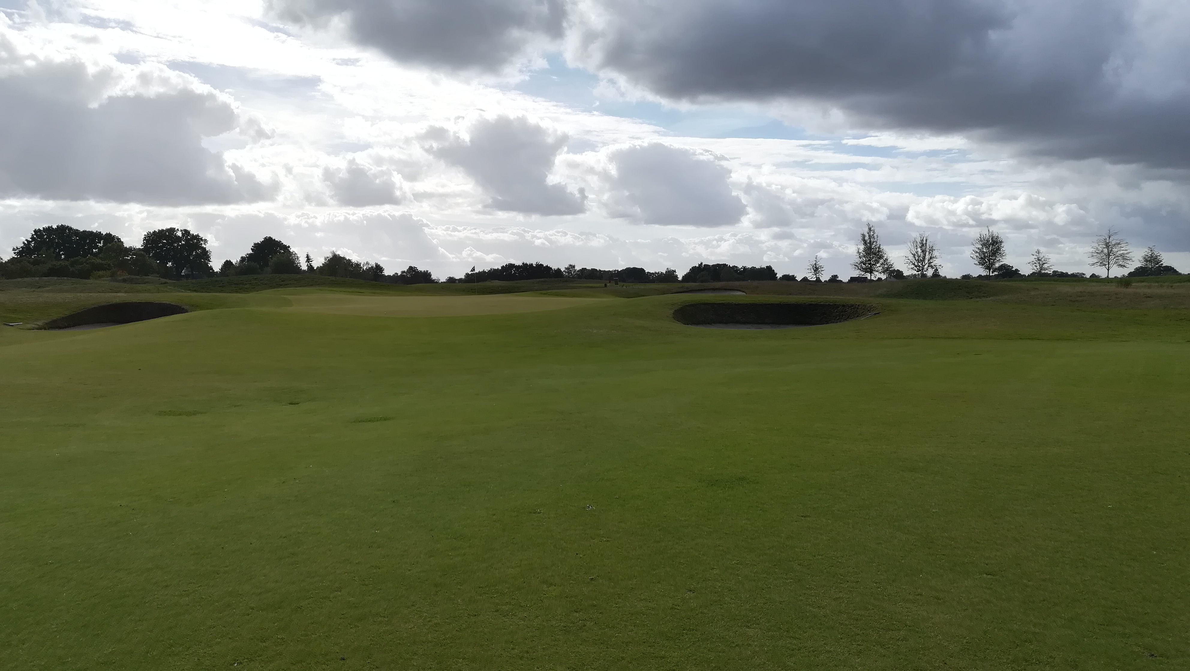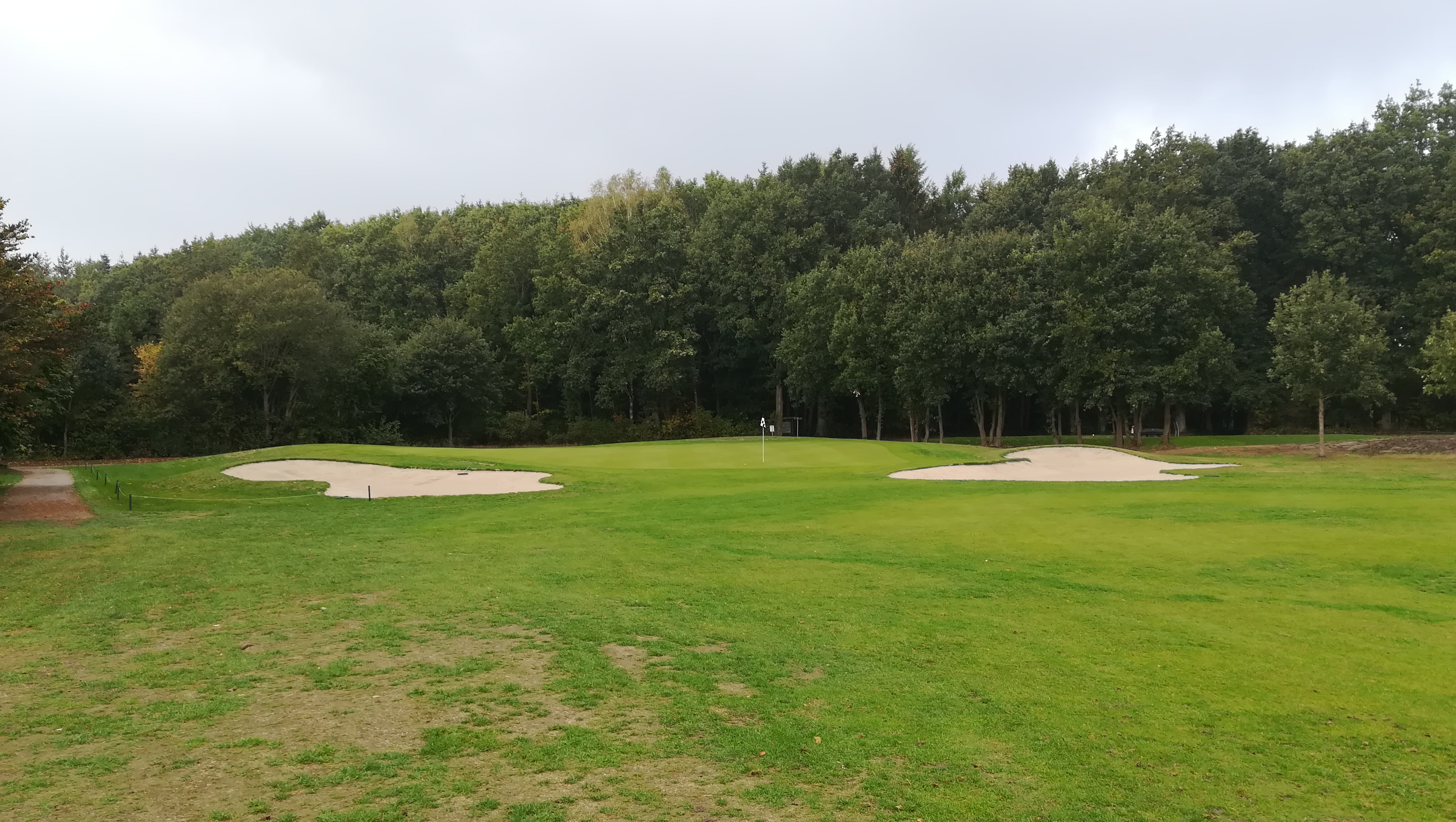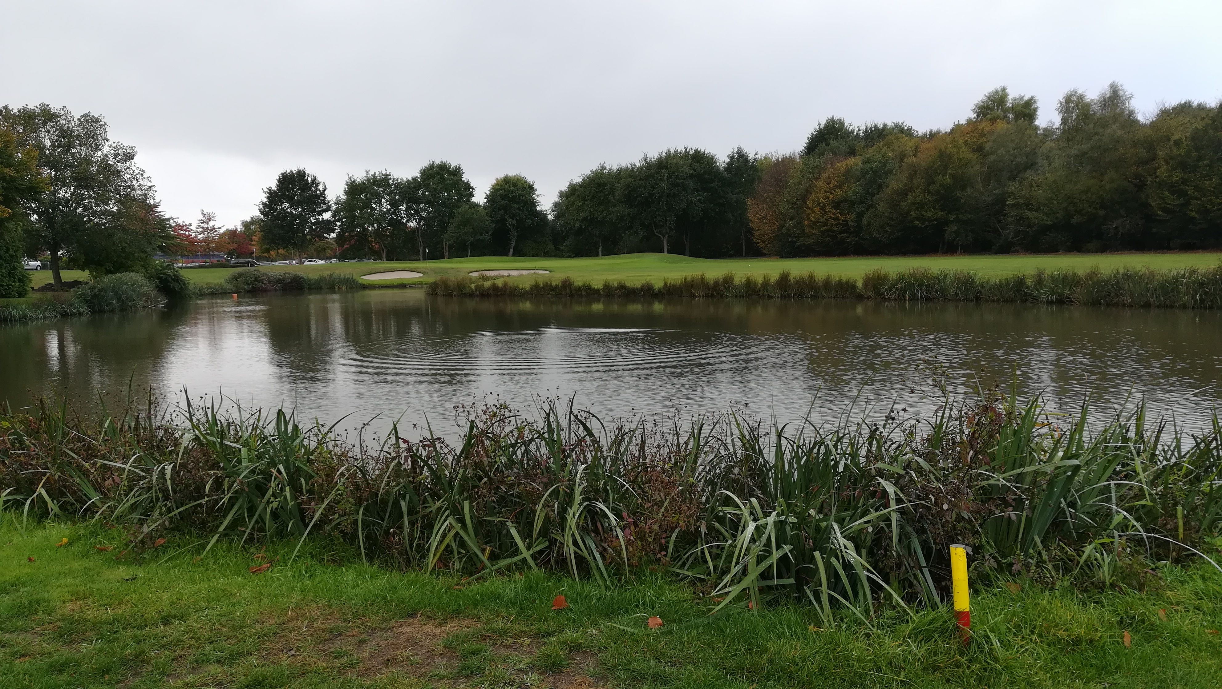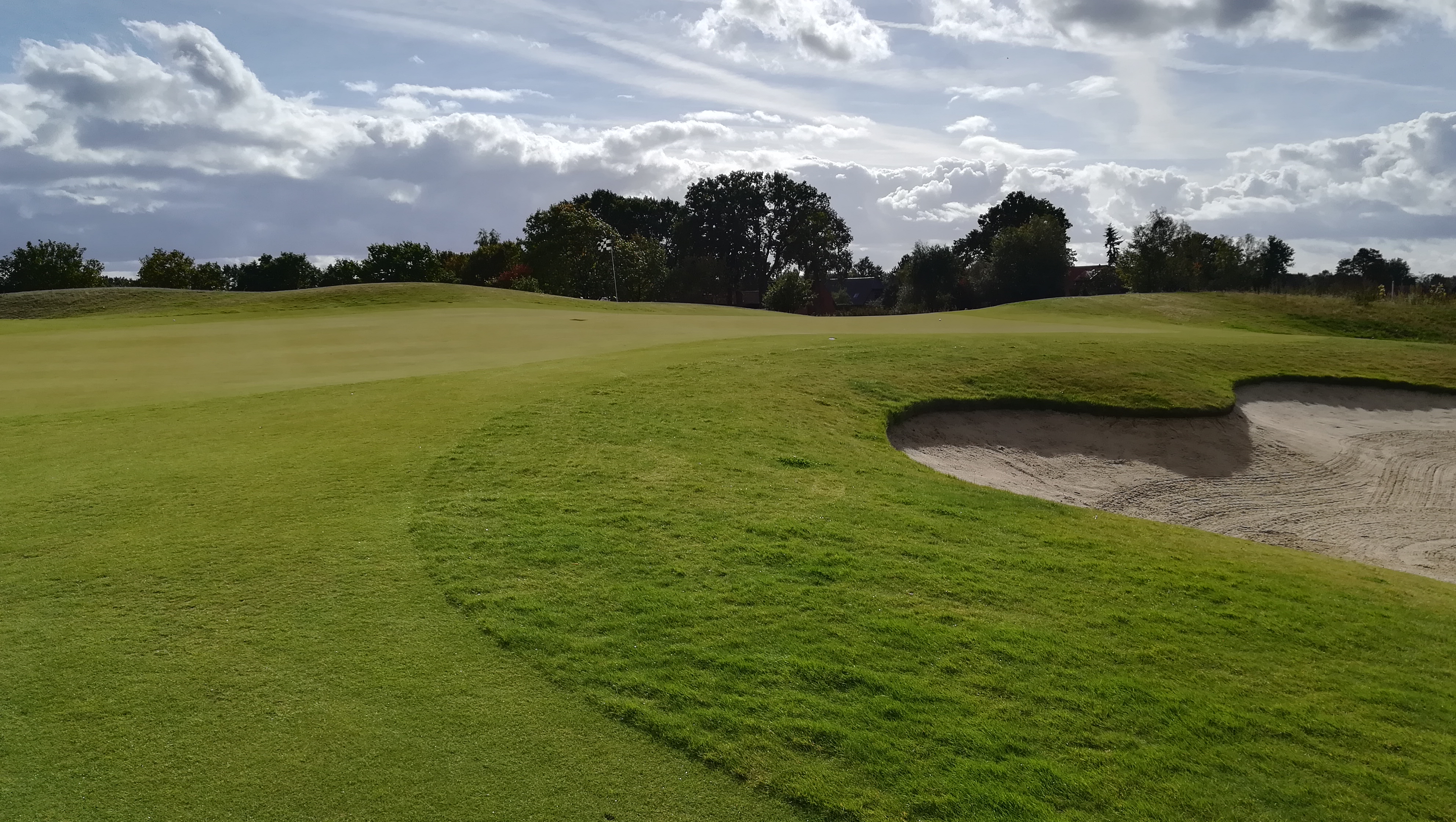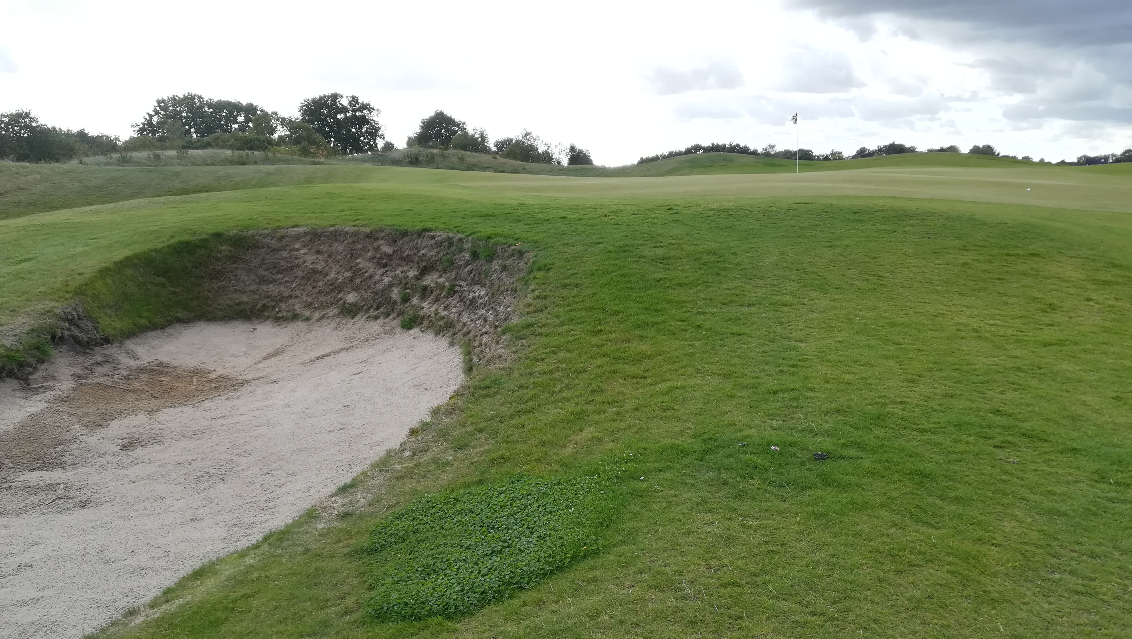 Anschließend geht es vergleichsweise großzügig weiter bis zu einem kleineren Grün, das von zwei Bunkern und einem Teich rechts daneben gut bewacht wird.