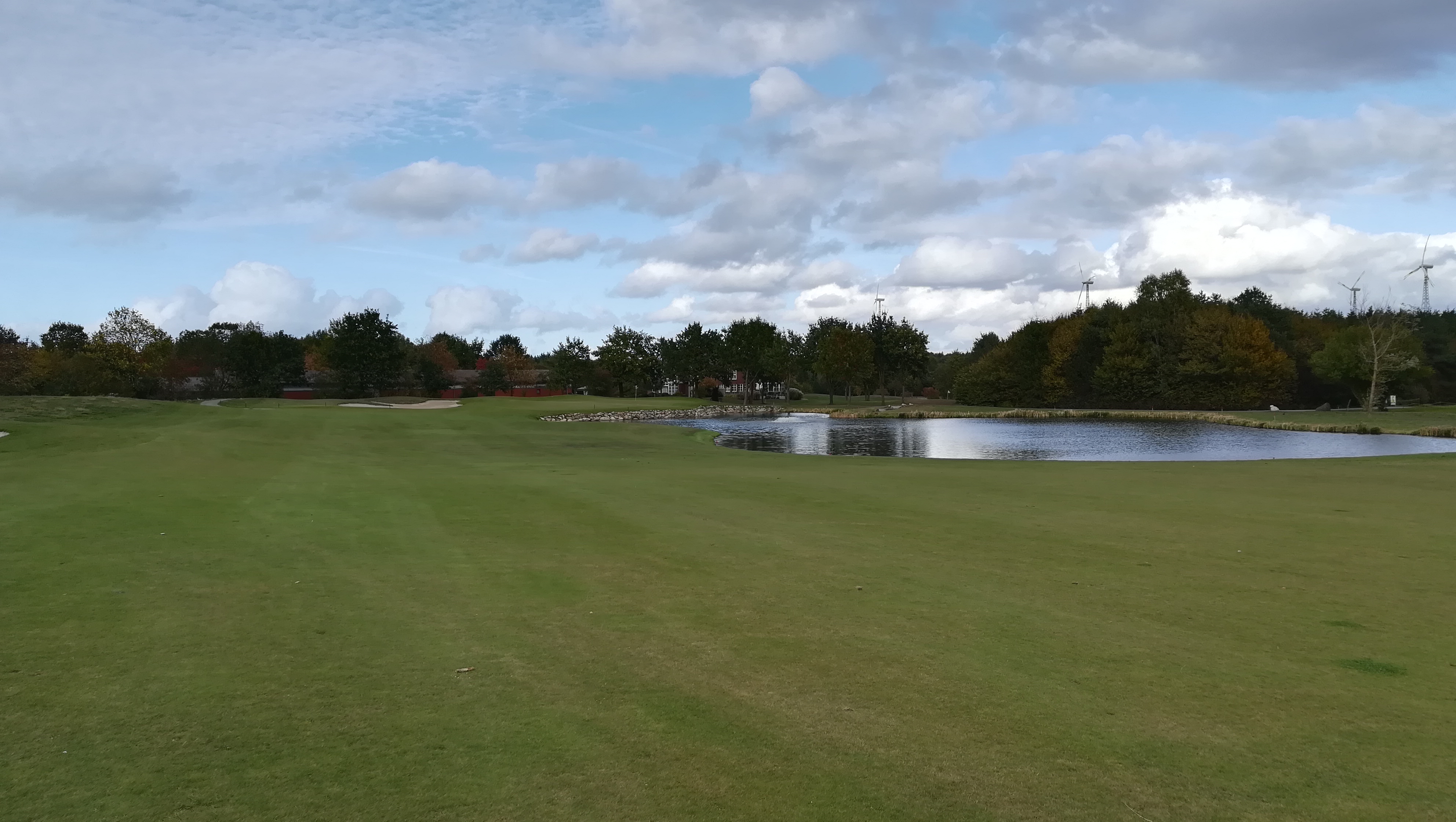 Und mit dem Abschlussloch A9 hat man noch einmal ein schönes Par 4 Dogleg links. Optisch ist die Bahn etwas offener, im Knick wartet aber erneut ein Teich, der jedem zu kurzen Abkürzungsversuch ein feuchtes Ende bereitet.