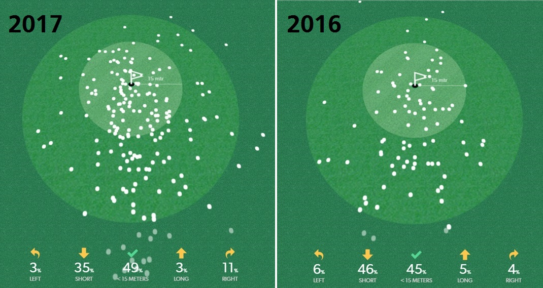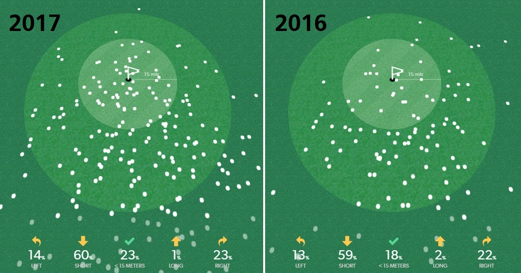 Meine Trefferqualität ist auch hier insgesamt leicht nach oben gegangen. Zwar verfehlen immer noch gut ein Drittel aller Annäherungen ihr Ziel seitlich und drei von fünf Schlägen bleiben zu kurz, aber immerhin habe ich die Trefferquote innerhalb des virtuellen 15-Meter-Radius um die Fahne von 18 auf 23 Prozent steigern können.