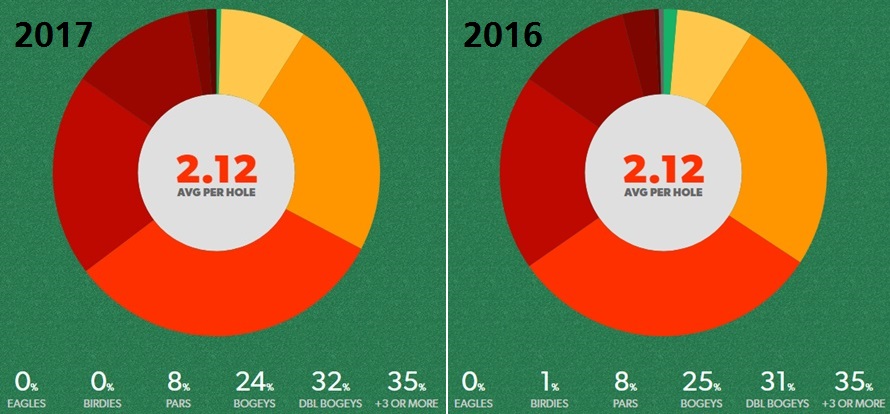 Tja, Ihr seht es selbst. Im Grunde hat sich hier nicht viel bis gar nichts getan. Oder anders ausgedrückt: Das Ergebnis ist so schlecht geblieben wie bisher. Die zwei Birdies aus 2017 tauchen prozentual nicht auf, weil es insgesamt viel mehr Schläge waren und weniger als 0,5 Prozent eben kaufmännisch auf eine Null abgerundet wird. Anderenfalls würde das Ergebnis aber auch nicht besser ausschauen…
