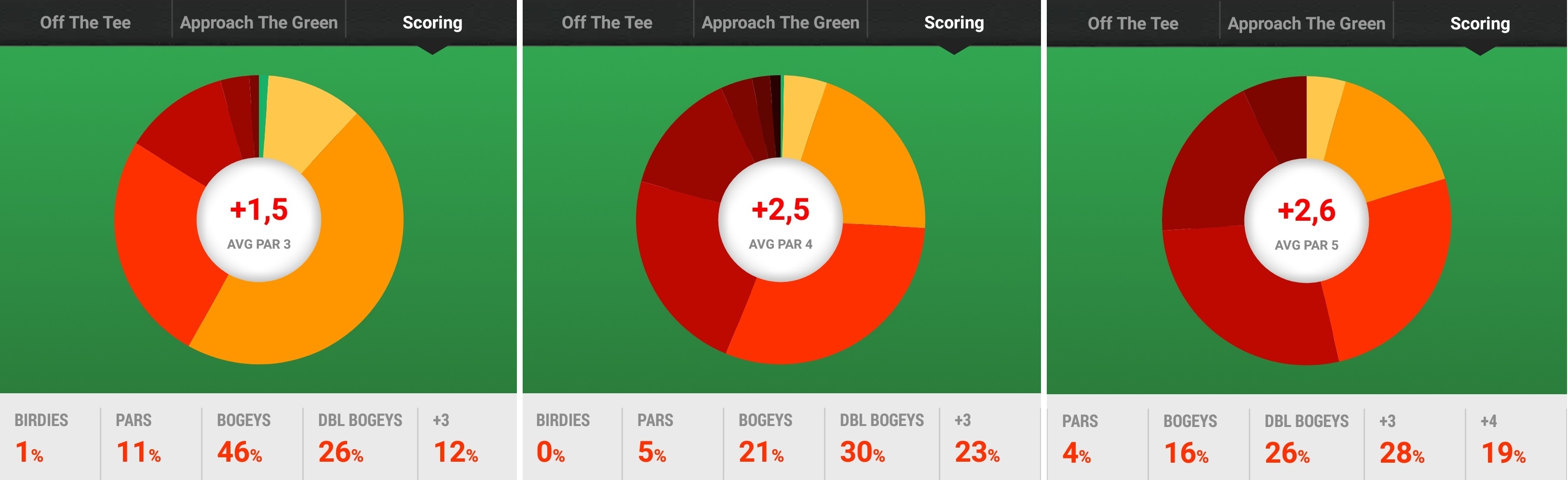 Ich fürchte, ich muss die Werte gar nicht mehr kommentieren. Besonders schlimm sind ja die ganz großen Zahlen, also die mit „+3“ („und mehr“ fehlt da noch) betitelten Werte. Wenn ich mir eine Bahn kaputt mache, dann meistens auch richtig. Ich habe für einen anderen Artikel schon Google fragen müssen, um auf den Begriff Quintuple-Bogey zu kommen…
